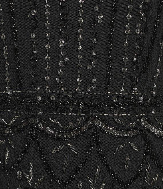 From Pissaro Nights, this dress features: Mesh fabrication Sheath silhouette Bell long sleeves Split v-neckline Beaded embellishment Zip back closure Approx. 55" length Polyester Spot clean Imported.