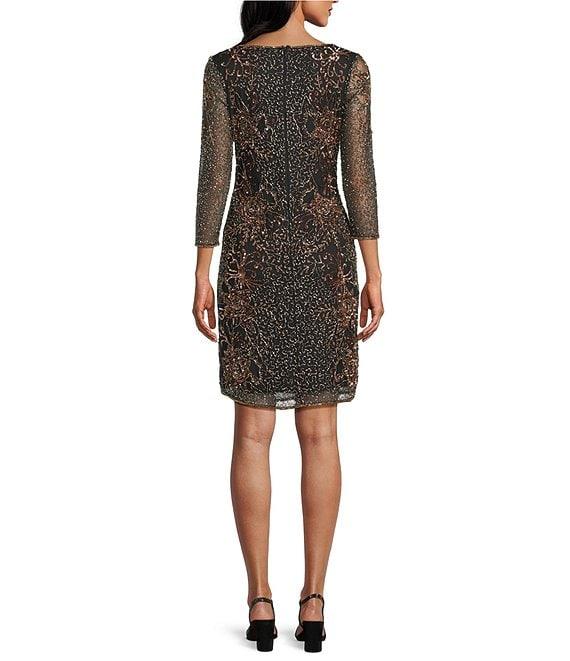 Pisarro Nights Petite Size Beaded Floral Motif Mesh 3/4 Sleeve Short Dress