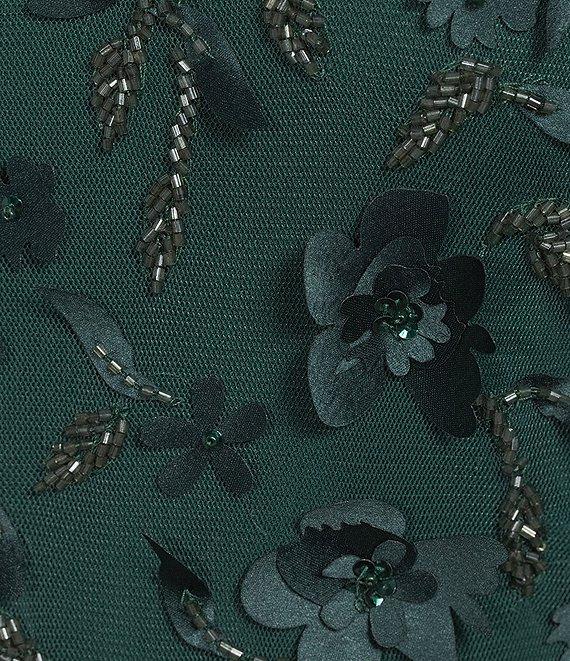 From Pisarro Nights, this dress features: Mesh fabrication Illusion crew neckline Short sleeves A-line silhouette Lined 3D floral details Zip back closure Approx. 47" in length from high point shoulder Polyester Spot clean Imported.