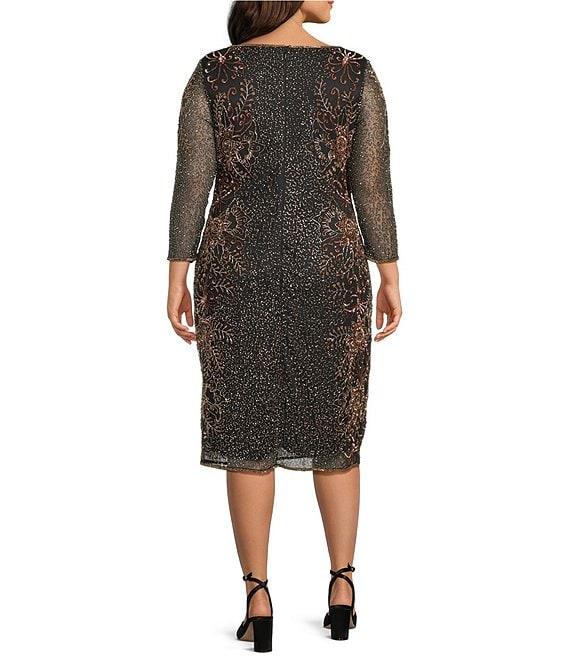 Pisarro Nights Plus Size Beaded Floral Motif Mesh 3/4 Sleeve Short Dress