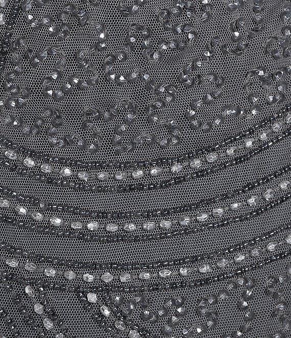 From Pisarro Nights Plus, this dress features: Mesh fabrication V-neckline Short sleeves Sheath silhouette Lined Beading details Zip back closure Approx. 47" in length from high point shoulder Polyester Spot clean Imported.