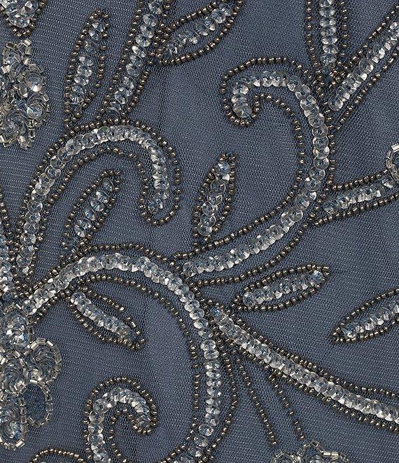 From Pisarro Nights Plus, this gown features: Mesh fabrication V-neckline Cap sleeves Sheath silhouette Lined Beaded Zipper back closure Approx. 57" in length Rayon Spot clean Imported.