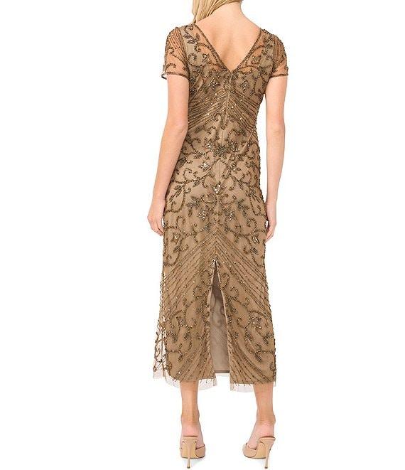 Pisarro Nights V-Neck Short Sheer Sleeve Back Slit Beaded Sheath Dress