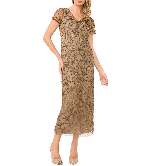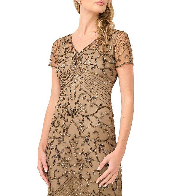From Pisarro Nights, this dress features: Beaded fabrication Sheath silhouette V-neckline Sheer short sleeves Zip back closure Rayon Spot clean Imported.