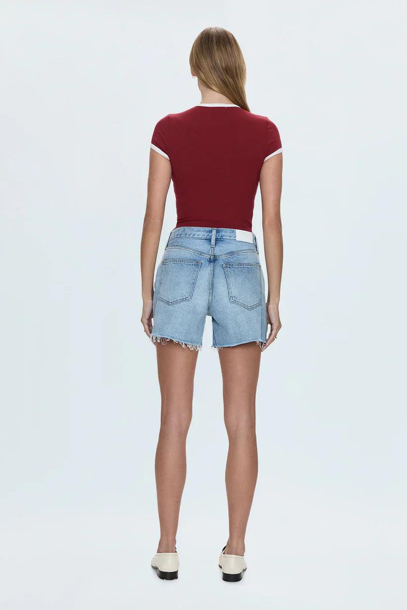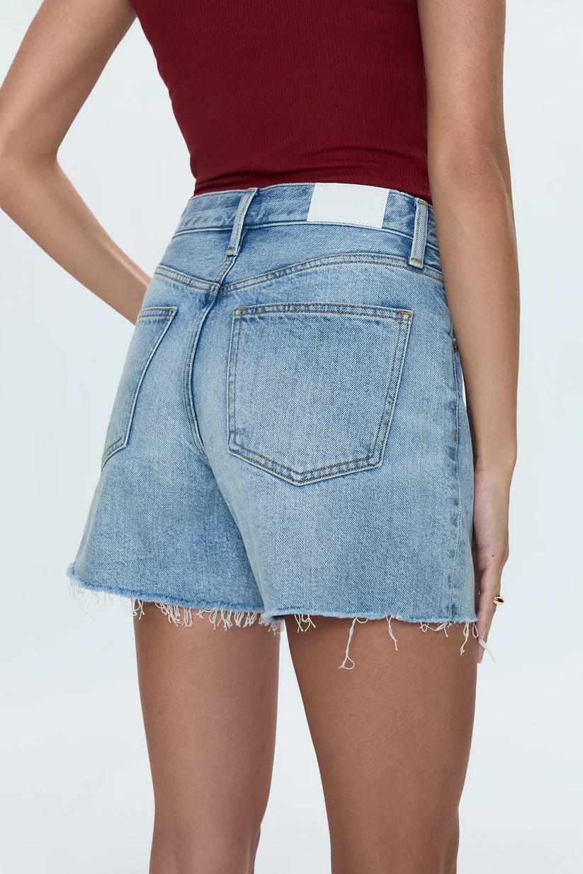 Meet the Andie: Your new favorite high-rise cut-off shorts. These rigid denim shorts offer a flattering fit and a perfectly vintage feel. The light medium wash and raw hem add a touch of cool, making them perfect for any occasion.