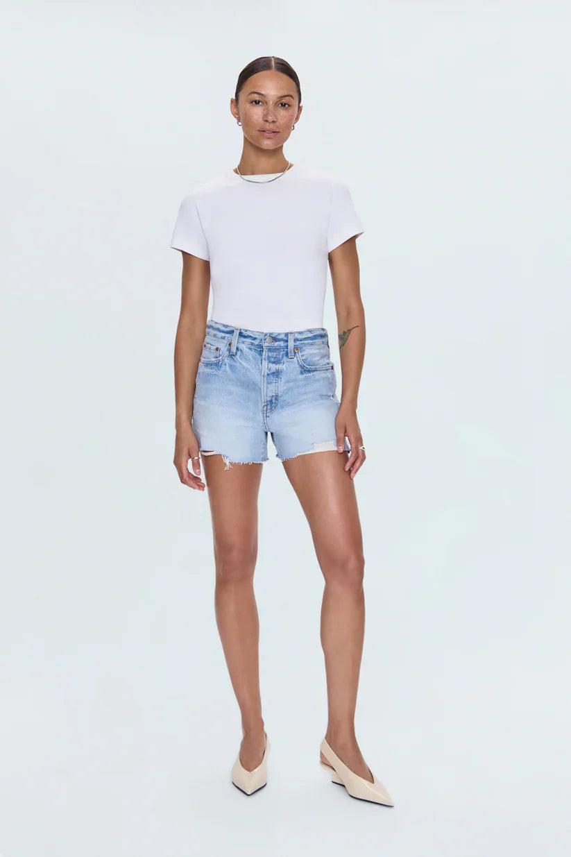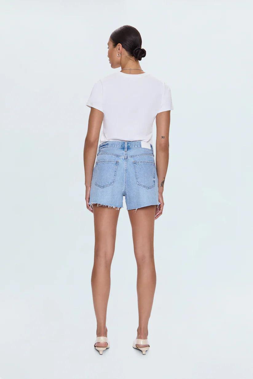 Like staring straight into the sun. High-rise denim short with a relaxed silhouette, in a medium length crafted from rigid non-stretch denim to hold its shape. Radiant Vintage is a sun soaked light wash with vintage inspired color fading, a subtle frayed hem, and hints of distressing.