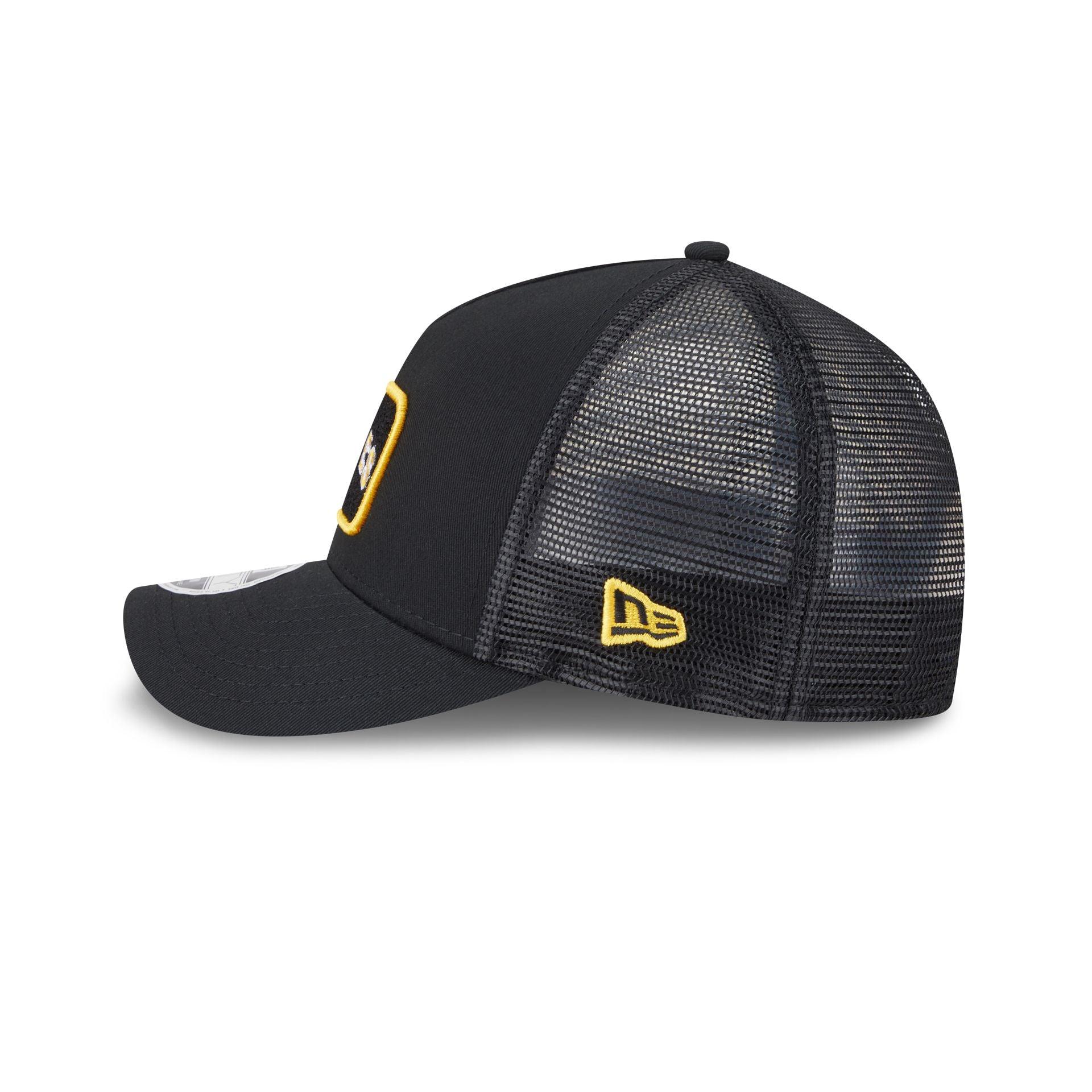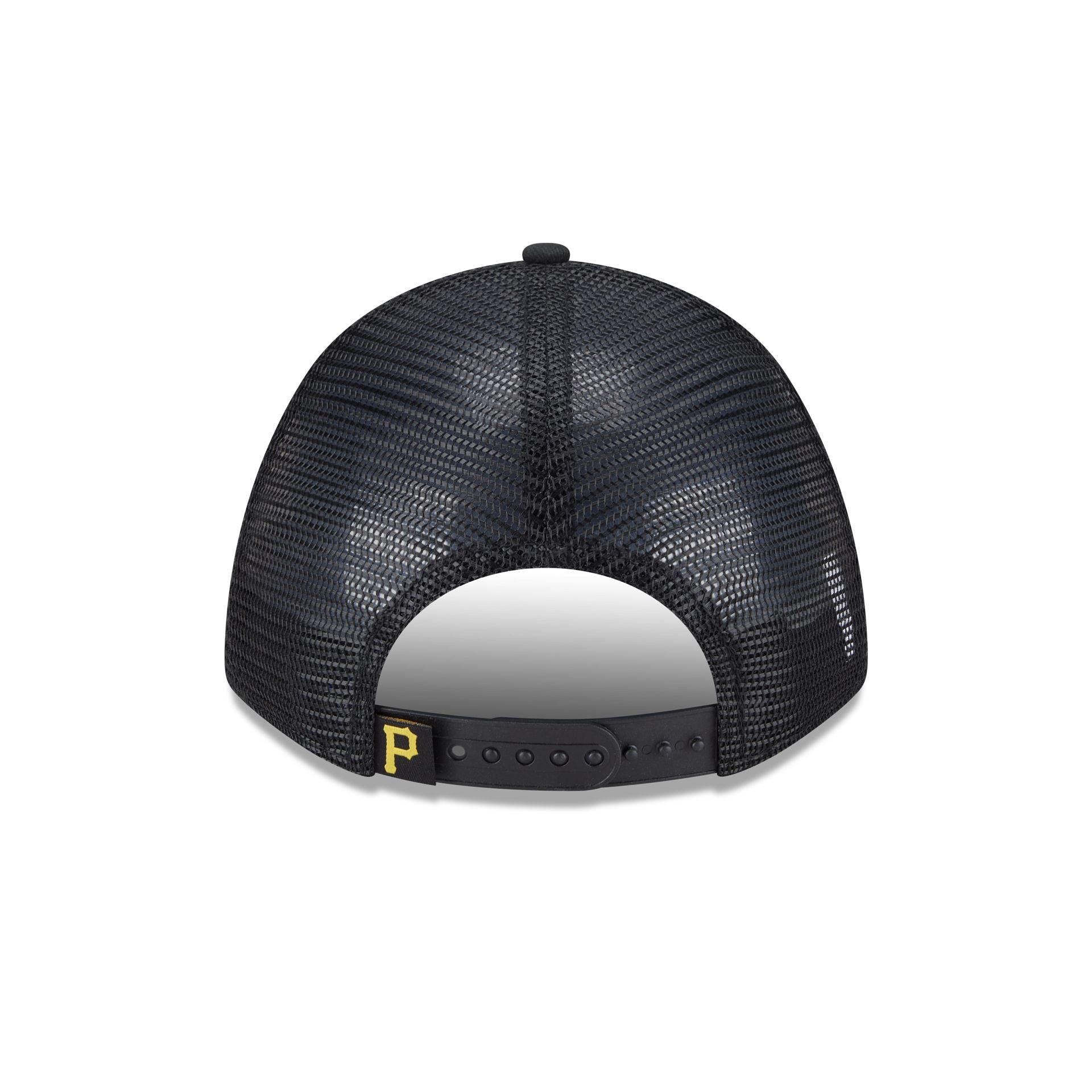 The Pittsburgh Pirates Tonal Patch 9FORTY M-Crown A-Frame Trucker features an embroidered Pirates wordmark patch at the front panels with a team tag on a snapback closure at a mesh rear.