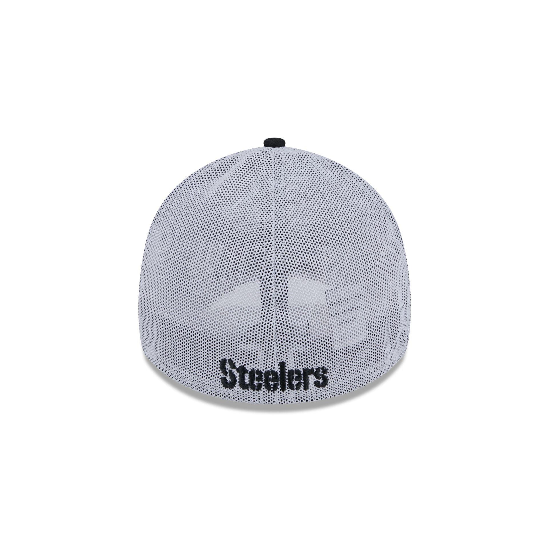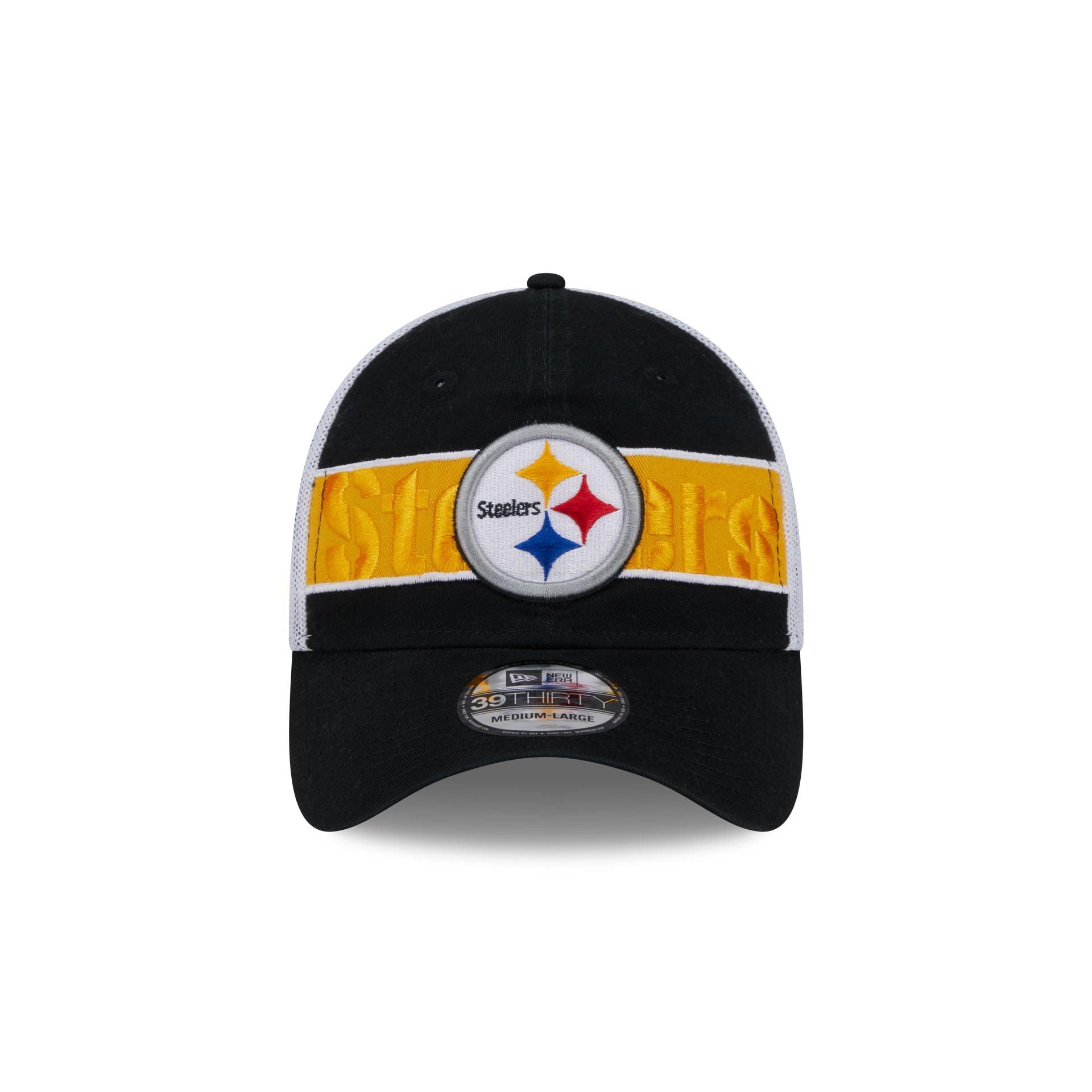 The Pittsburgh Steelers Banded 39THIRTY Stretch Fit Cap features an embroidered Steelers logo at the front panels with a team wordmark at the rear. Additional details include a mesh stretch fit and a gray undervisor.