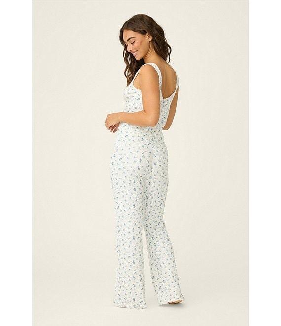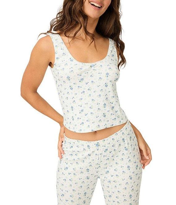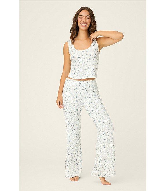 From PJ Salvage, this pajama set features: Top: Ditsy floral print Double brushed pointelle knit fabrication Scoop neckline Sleeveless Lace trim & rosette detail at the neckline Pullover construction Polyester/elastane Machine wash cold/line dry Bottom: Matching pant Elastic waistband Lace trim & rosette detail at the waist Side slits at the hem Pull-on construction Polyester/elastane Machine wash cold/line dry Imported.