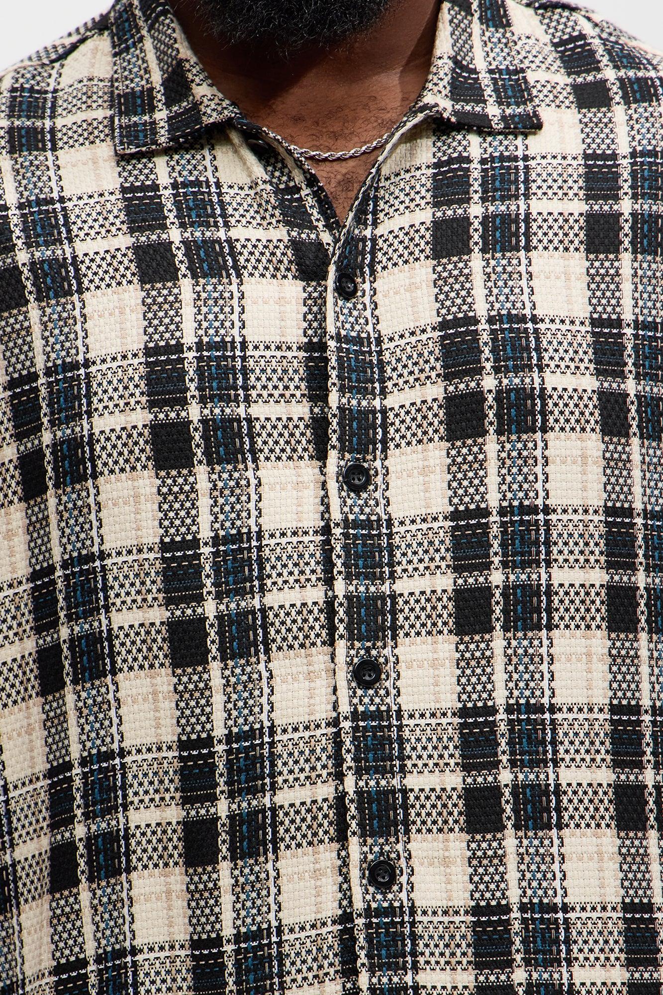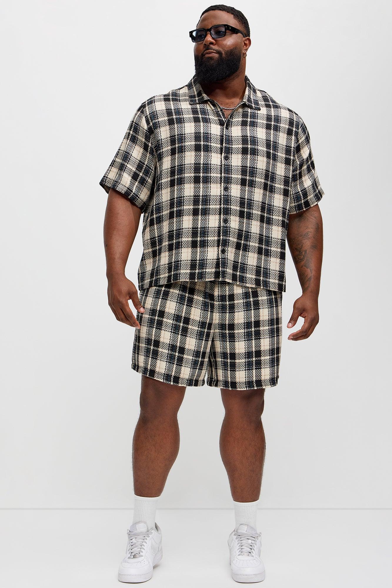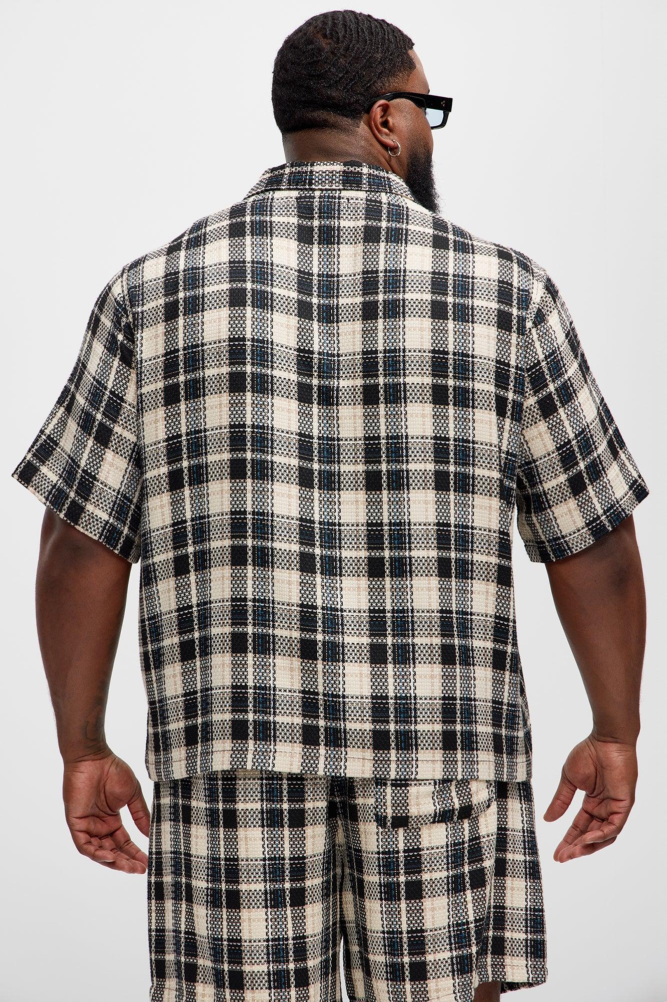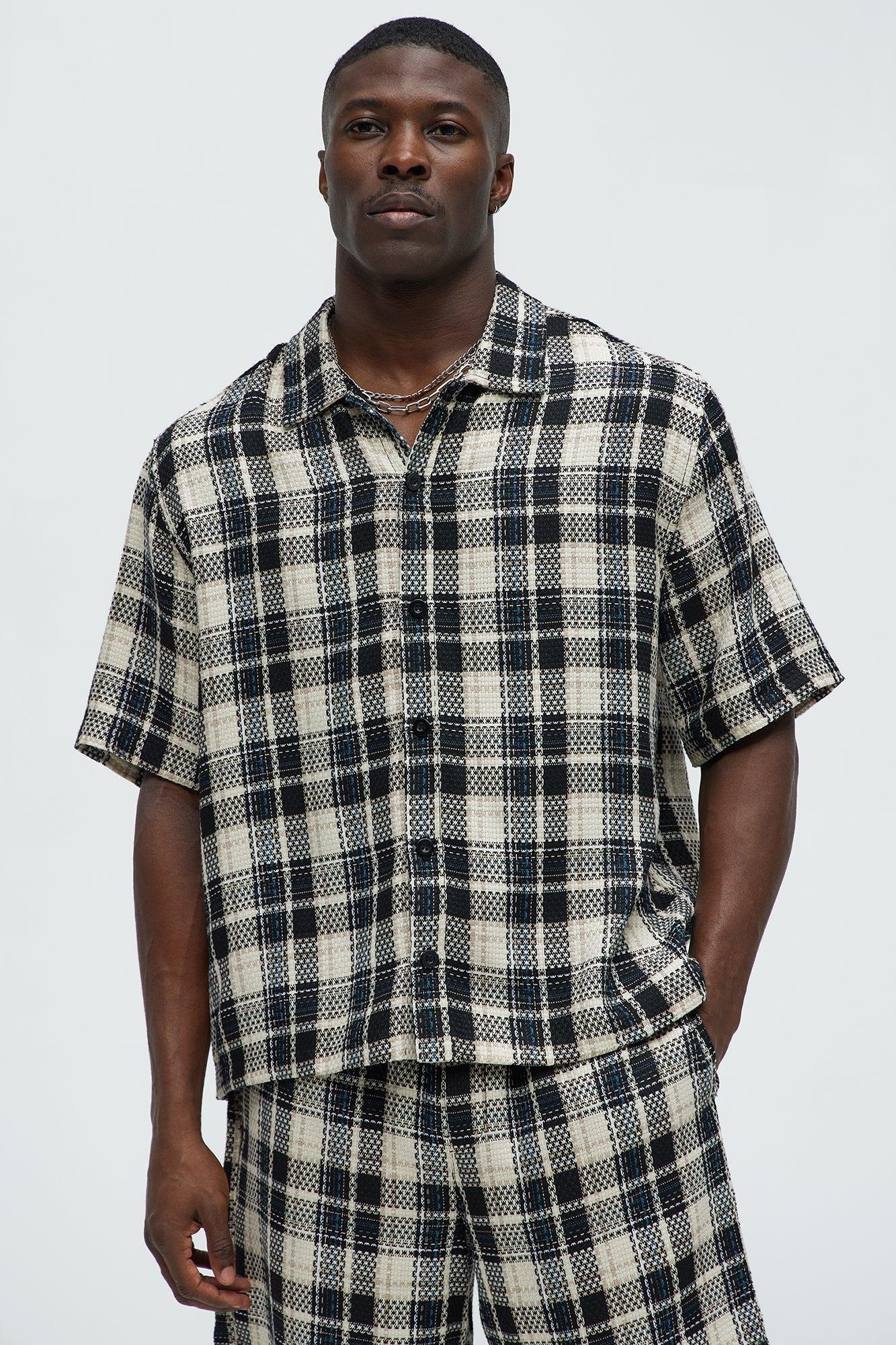 Available In Black/combo. Fold Down Collar front Button Closure Short Sleeves Cropped Fit Pair With "Plaid Basket Weave Volley Shorts" 70% Polyester 30% Cotton Imported California Proposition 65WARNING: Cancer and Reproductive Harm - www.P65Warnings.ca.gov.