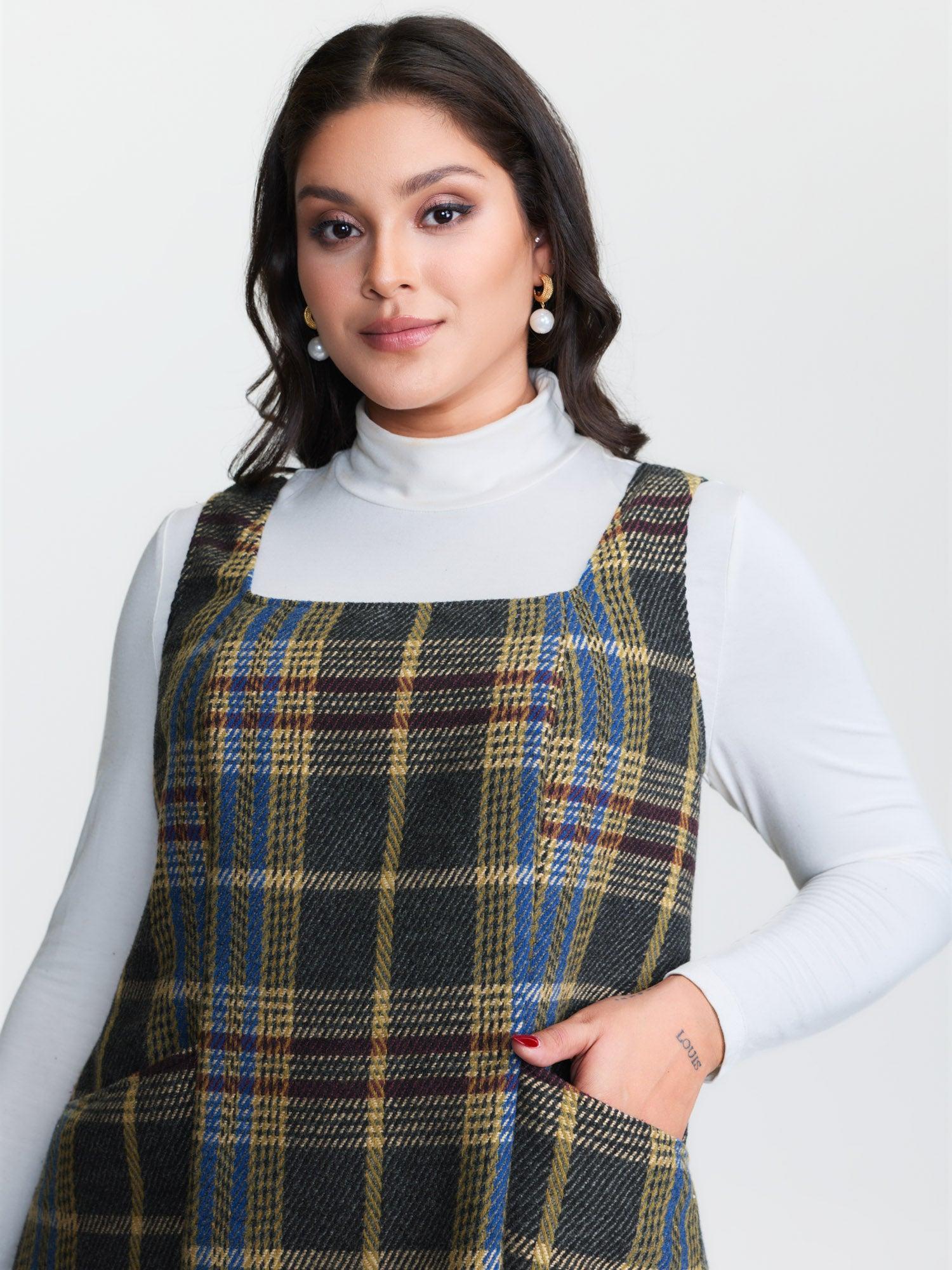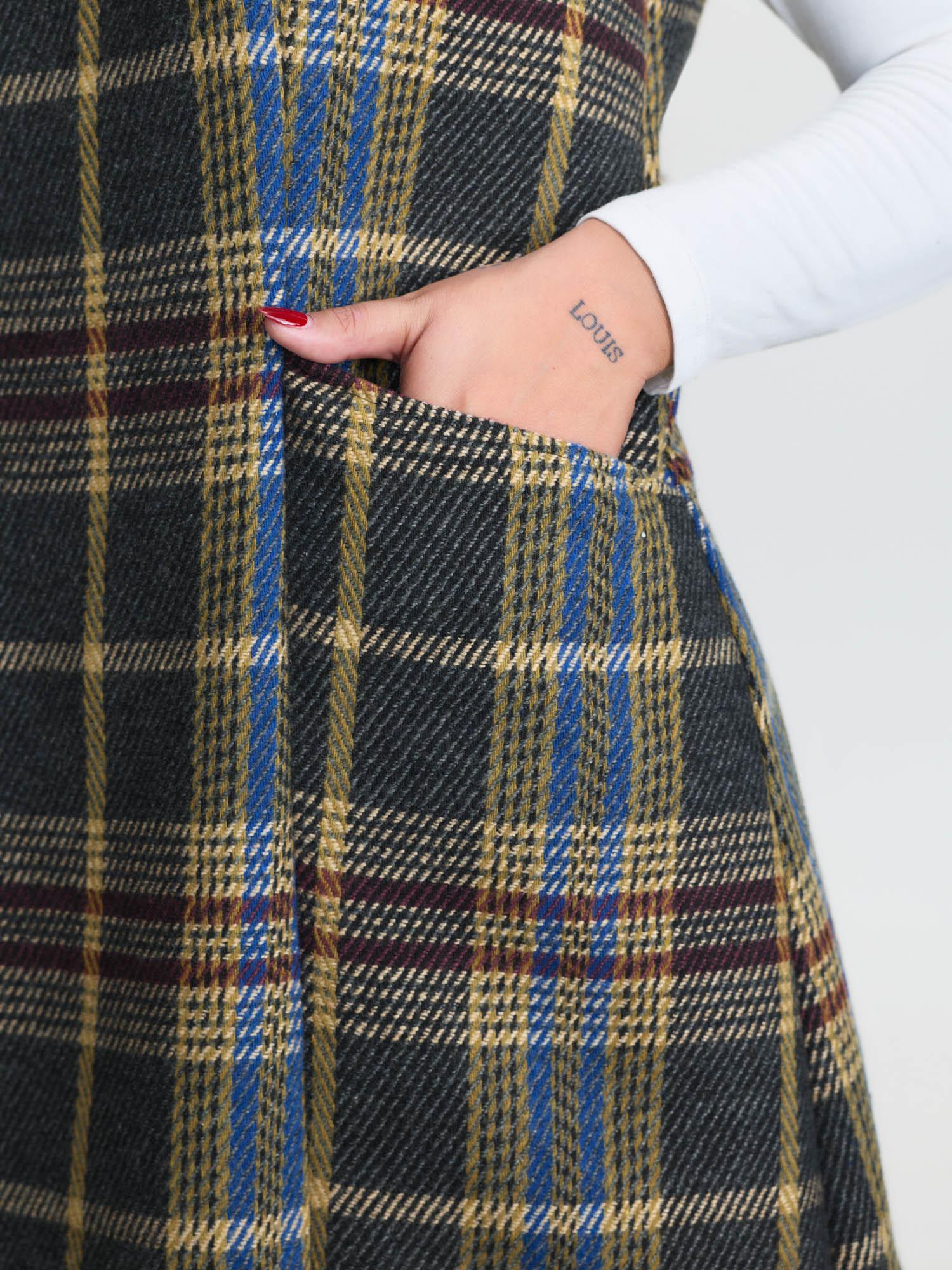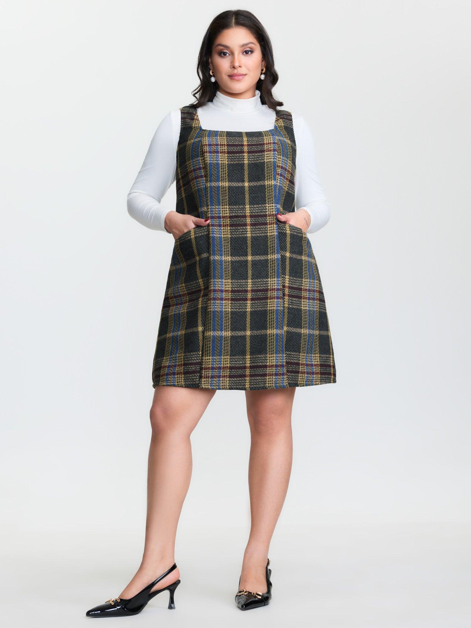 Plaid Pattern Slant Pockets Knee Dress Female