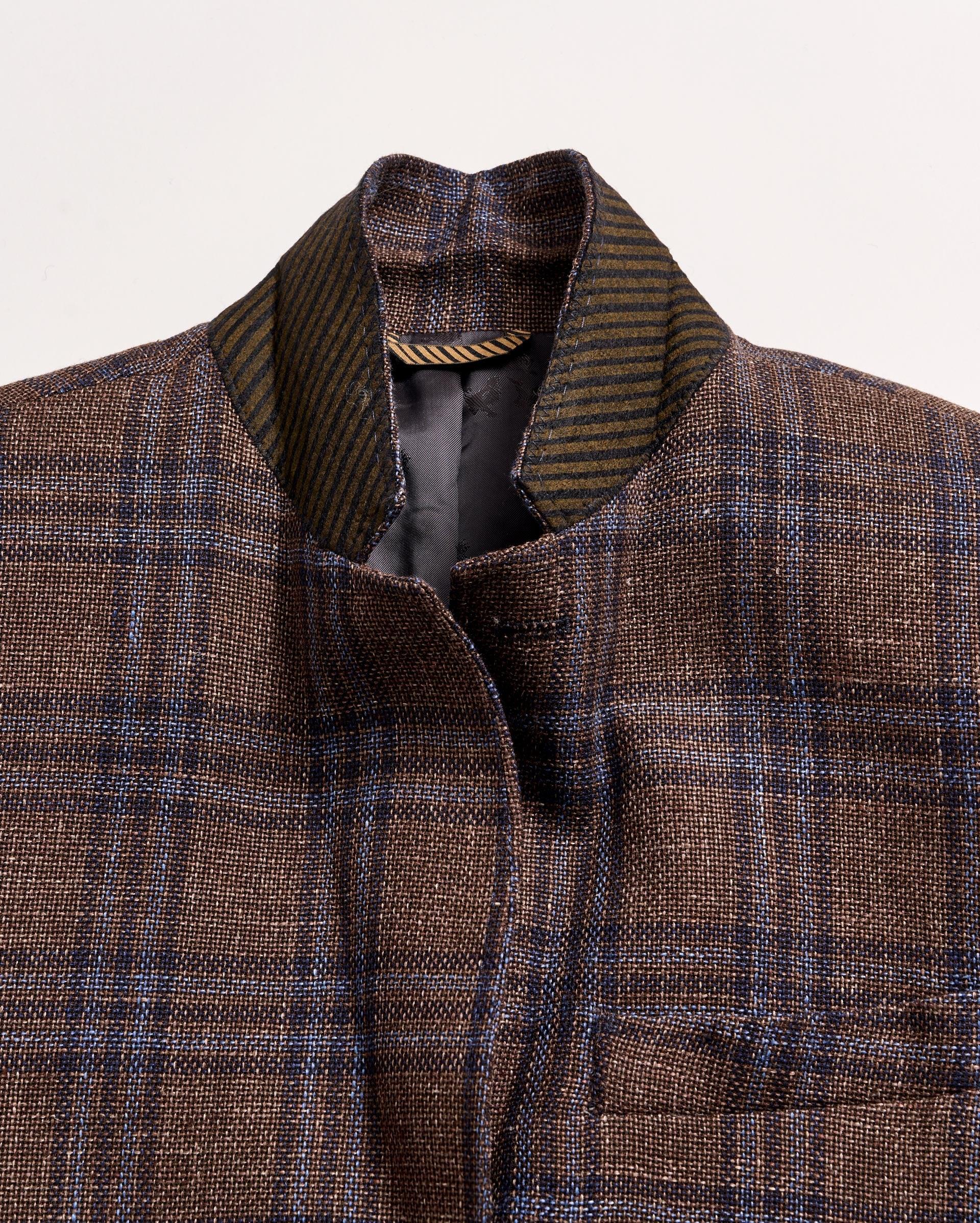 Plaid Walton Jacket, crafted in Italy with virgin wool and linen, features a subtle plaid, patch pockets, dark horn buttons, and signature details.