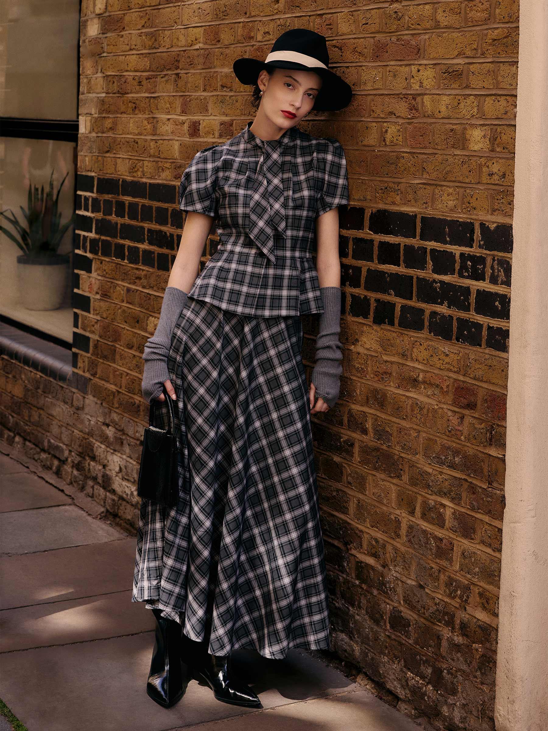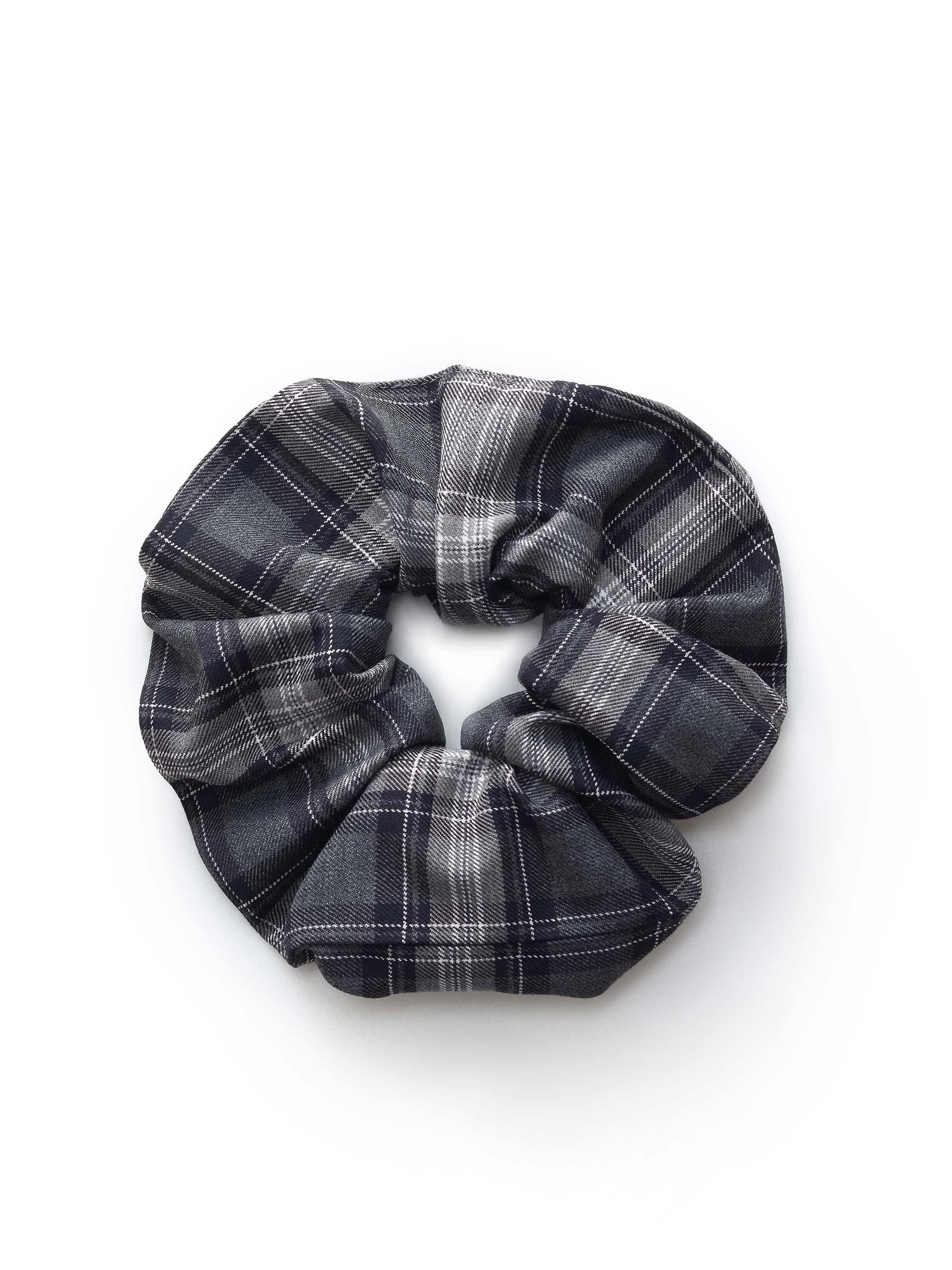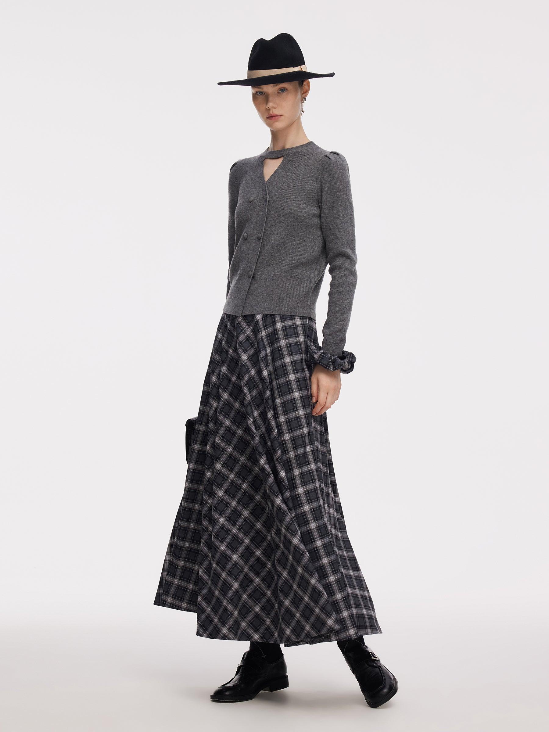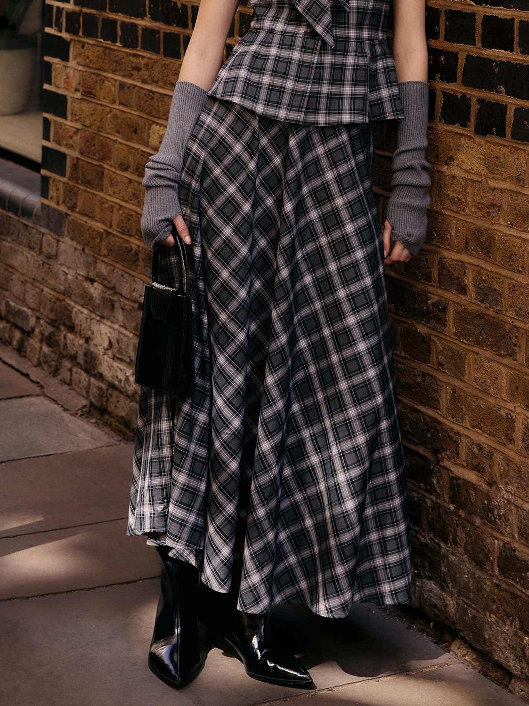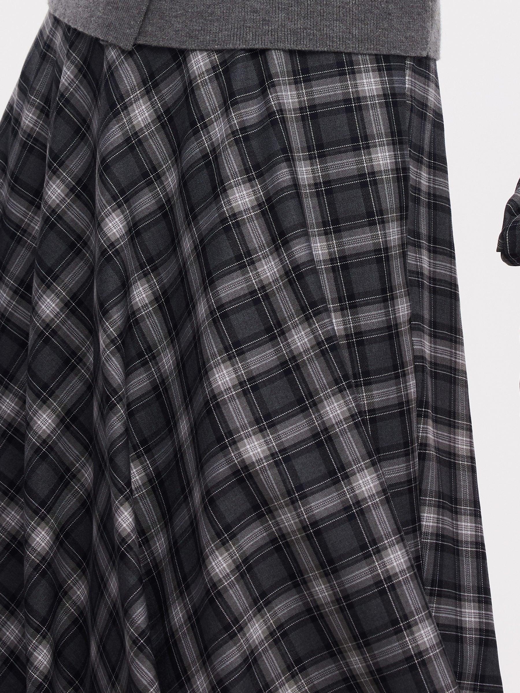 -With elastic waistband at the back -With scrunchie -With pockets Made from crisp fabric that resists wrinkles and maintains shape, this skirt offers durability and flexibility. The deep gray classic plaid, with its low-saturation hues and large checks, exudes understated vintage charm, visually slimming the hip line.