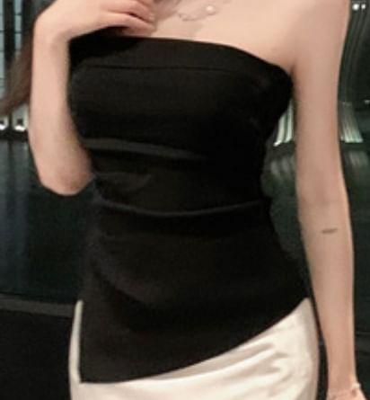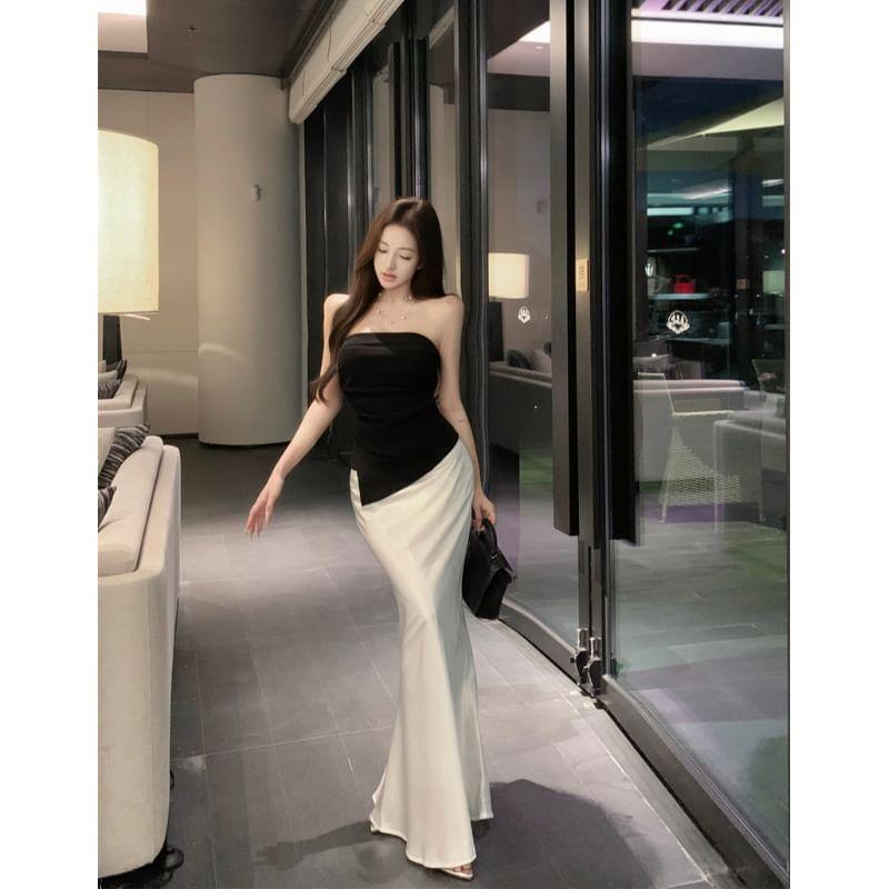 Plain Asymmetrical Tube Top / High Waist Plain Satin Maxi Mermaid Skirt