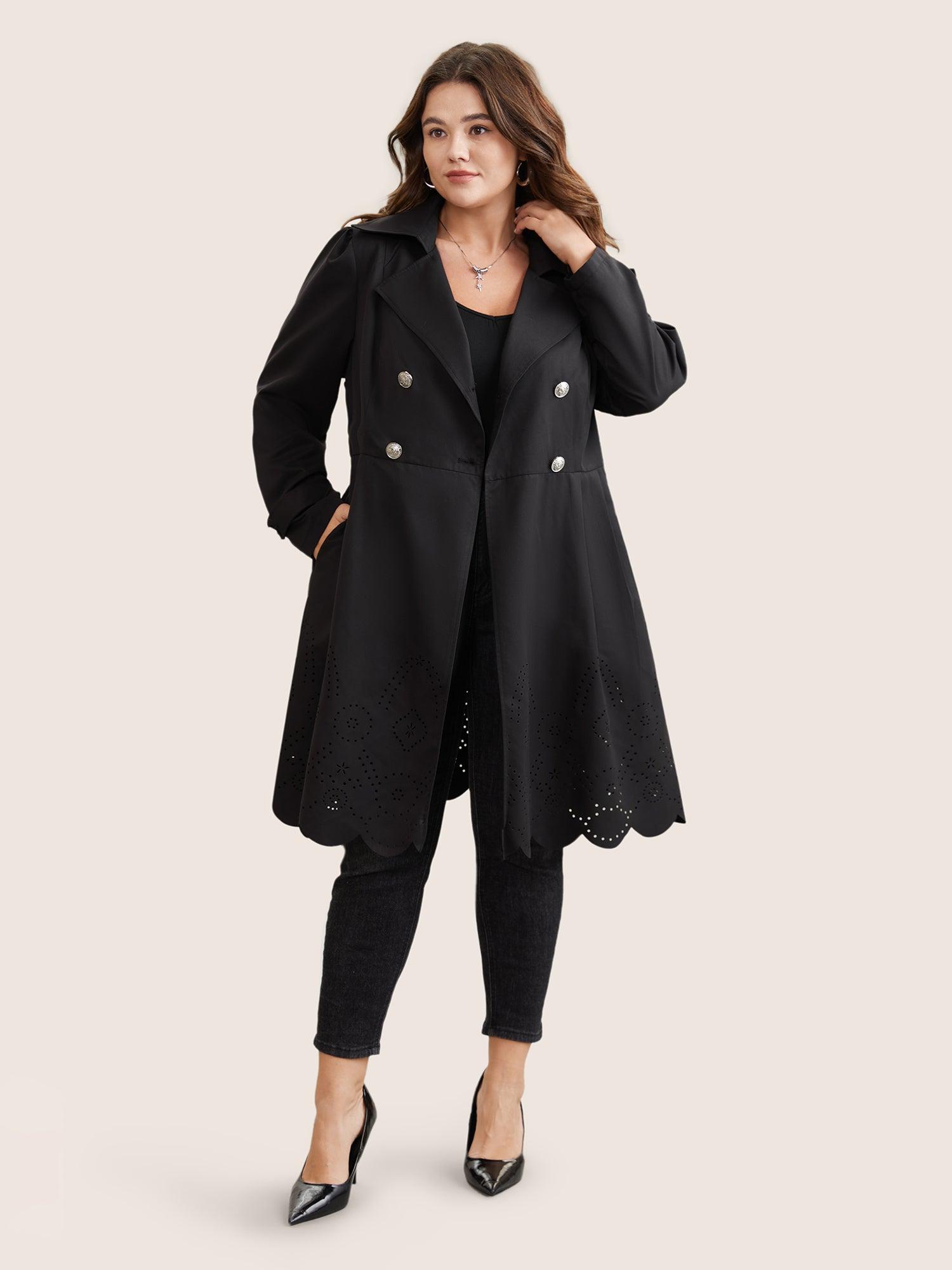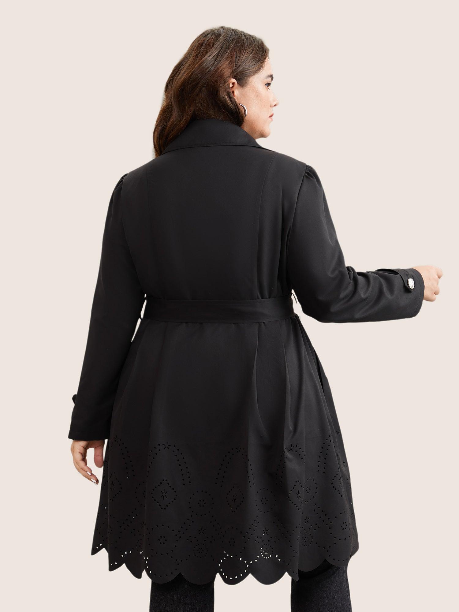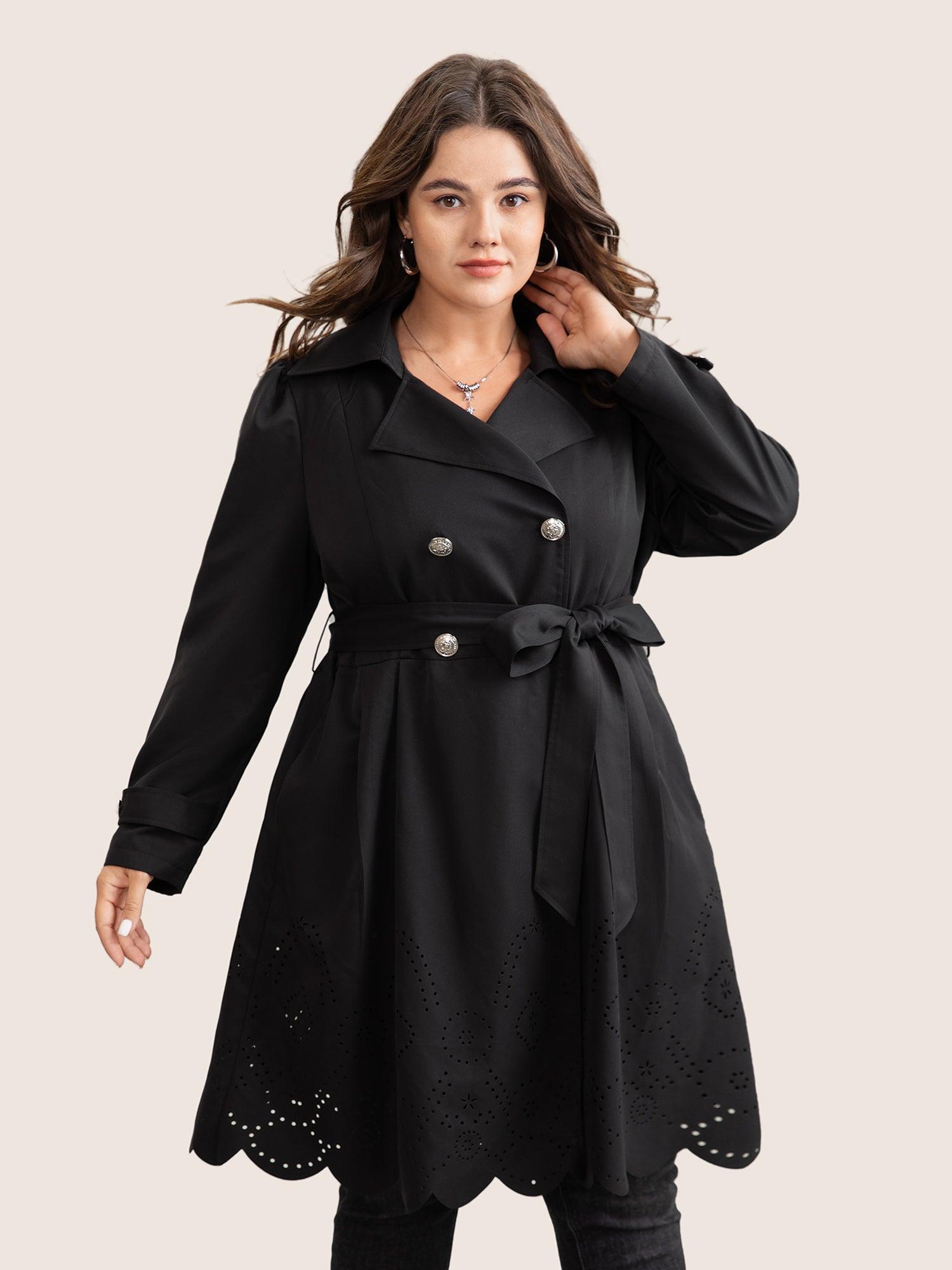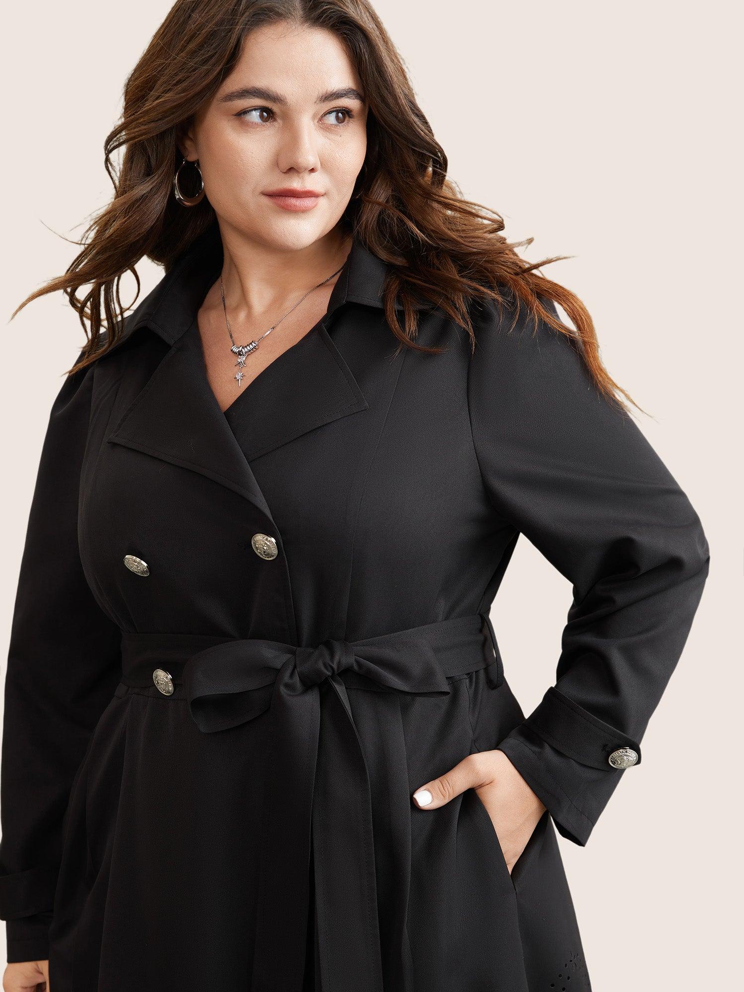 Shop Plain Double Breasted Belted Laser Cut Coat now and redefine your style with confidence at BloomChic. Tailored for mid and plus-size women. This trendy Outerwear Women, sizes 10-30. Season:Winter;Color:Black;Pattern Type:Plain;Details:Pocket, Button, Belted, Plain, Cut-Out;Pocket:It is perfectly sized to carry a phone.;Belt:Belt;Closure Type:Button;Lining:No-lining