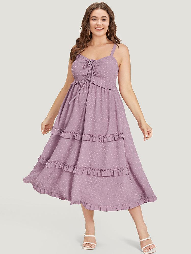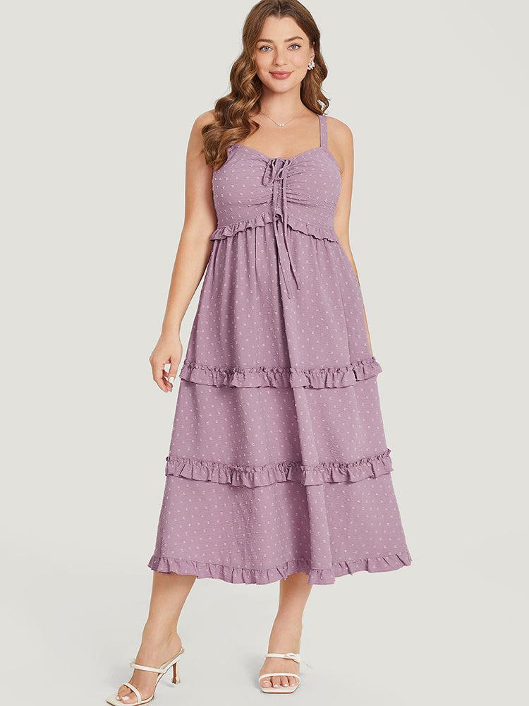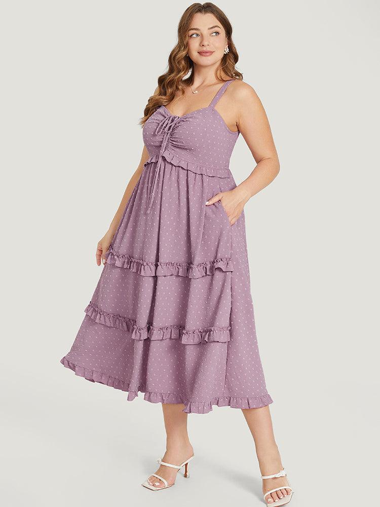 Shop Plain Drawstring Ruched Pocket Ruffle Trim Cami Dress now and redefine your style with confidence at BloomChic. Tailored for mid and plus-size women. This trendy Dress, sizes 10-30. You can never go wrong with BloomChic Dresses. Season:Summer;Color:Mauve;Style:Elegant;Neckline:Spaghetti Strap;Sleeve Type:Sleeveless;Pattern Type:Polka Dot, Plain;Details:Ruffles, Tiered, Pocket, Drawstring, Elastic Waist, Ruched, Adjustable Straps;Pocket:It is perfectly sized to carry a phone.;Belt:No-belt