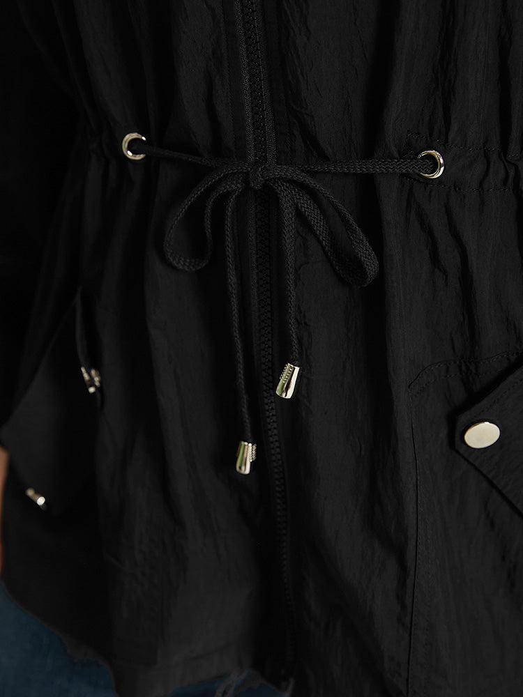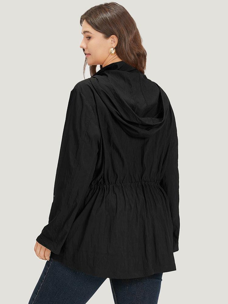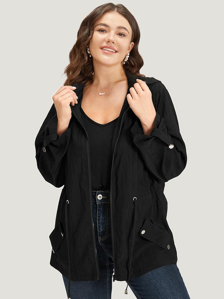 Shop Plain Hooded Zipper Drawstring Tab Sleeve Coat now and redefine your style with confidence at BloomChic. Tailored for mid and plus-size women. This trendy Outerwear Women, sizes 10-30. Color:Black;Pattern Type:Plain;Details:Pocket, Zipper, Plain, Drawstring, Button;Pocket:It is perfectly sized to carry a phone.;Belt:No-belt;Closure Type:Zipper;Lining:No-lining