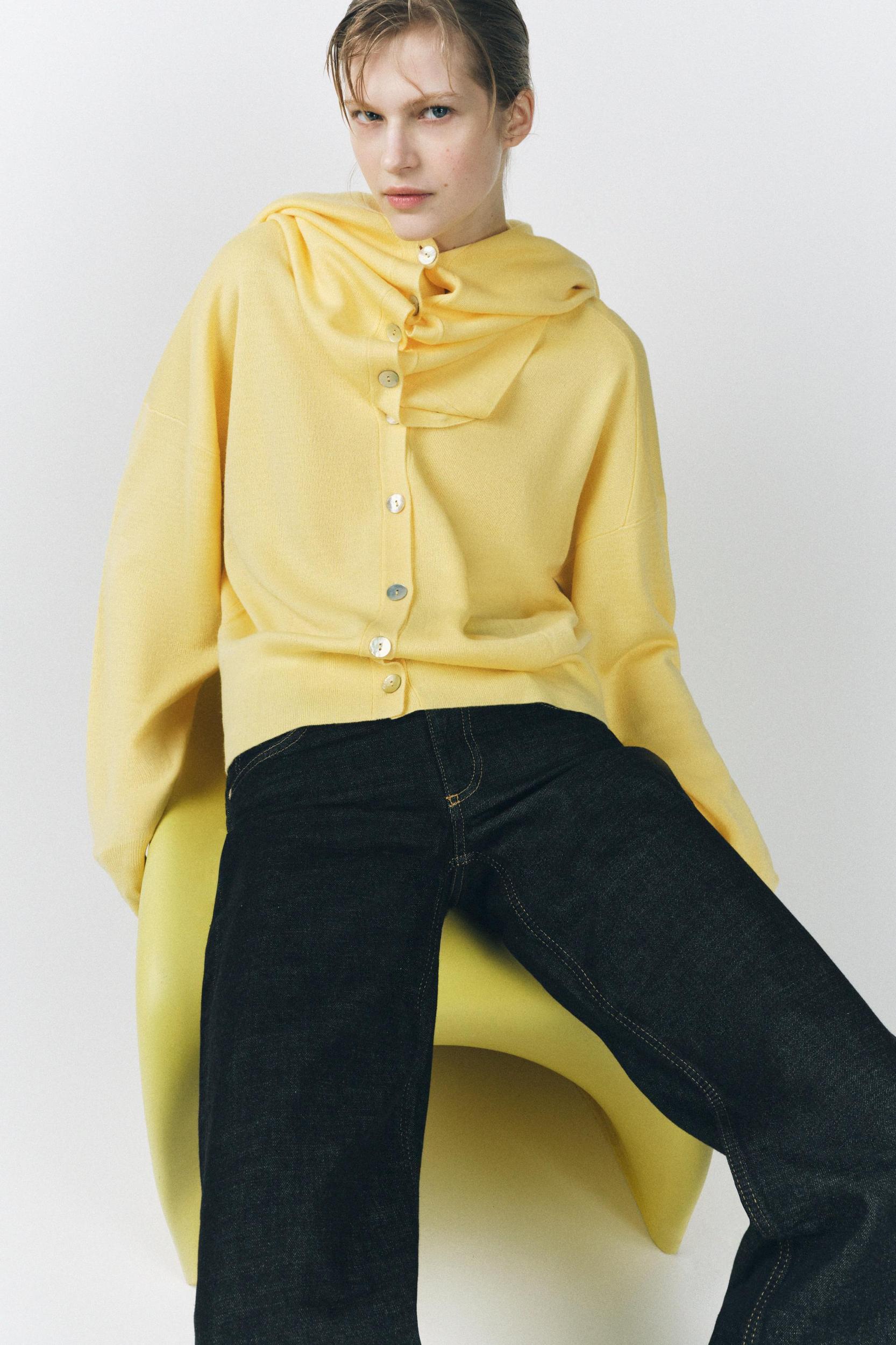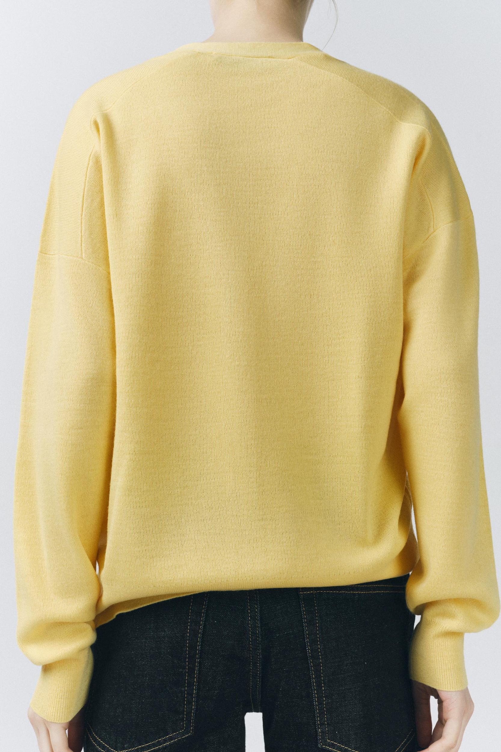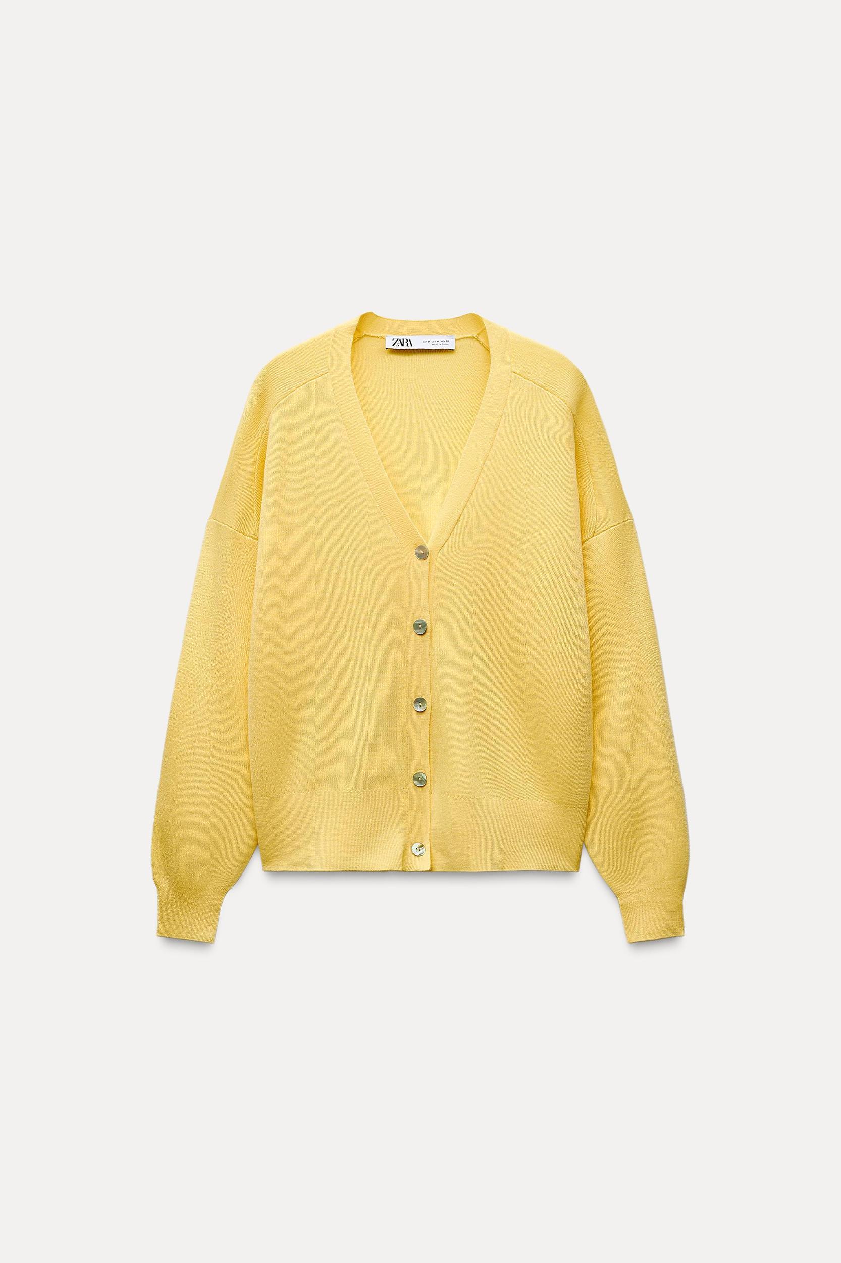 Wool blend cardigan. V-neckline and long sleeves. Front button closure.