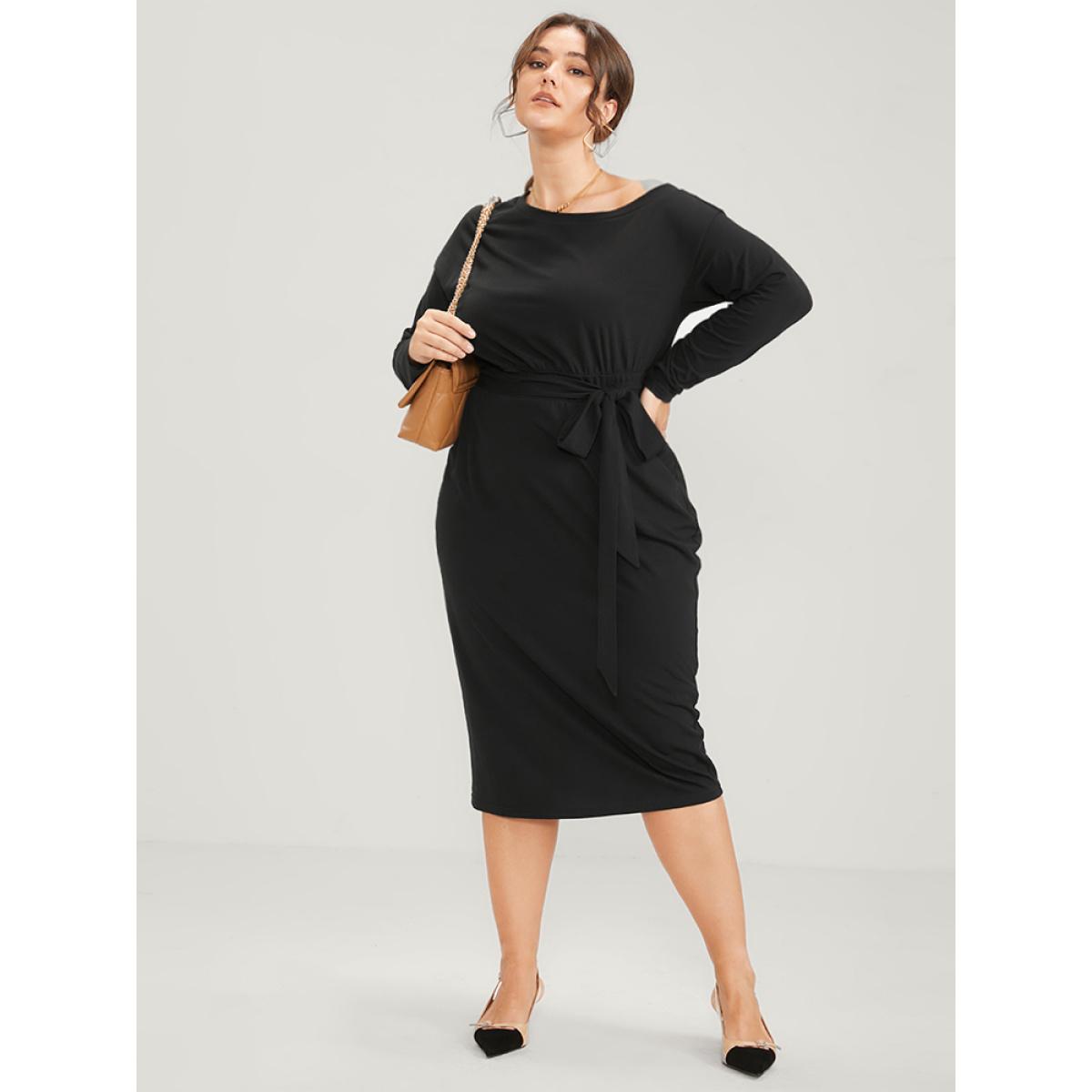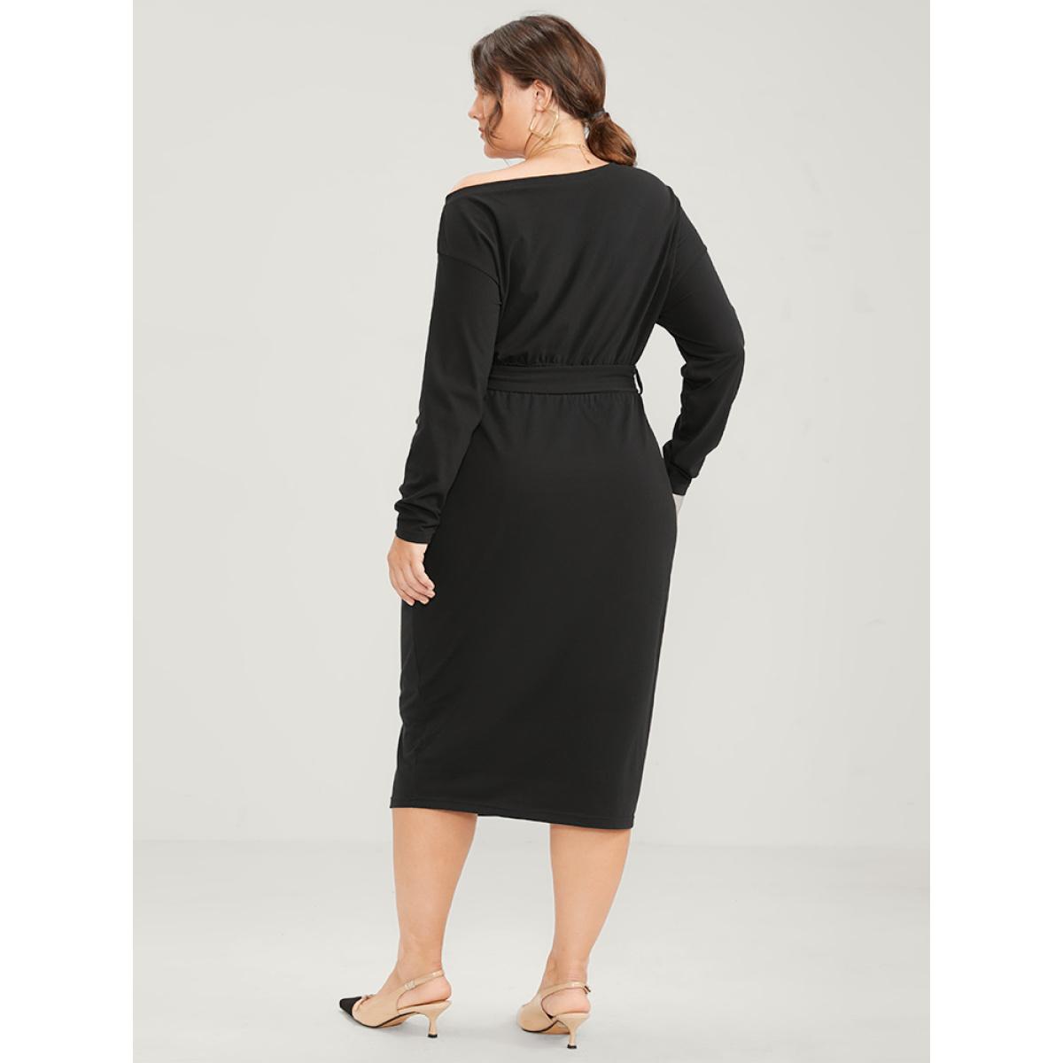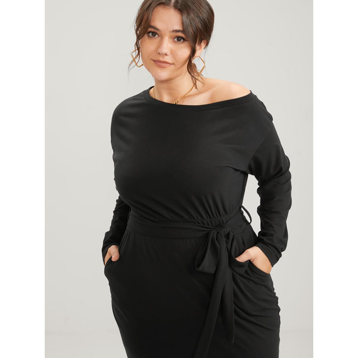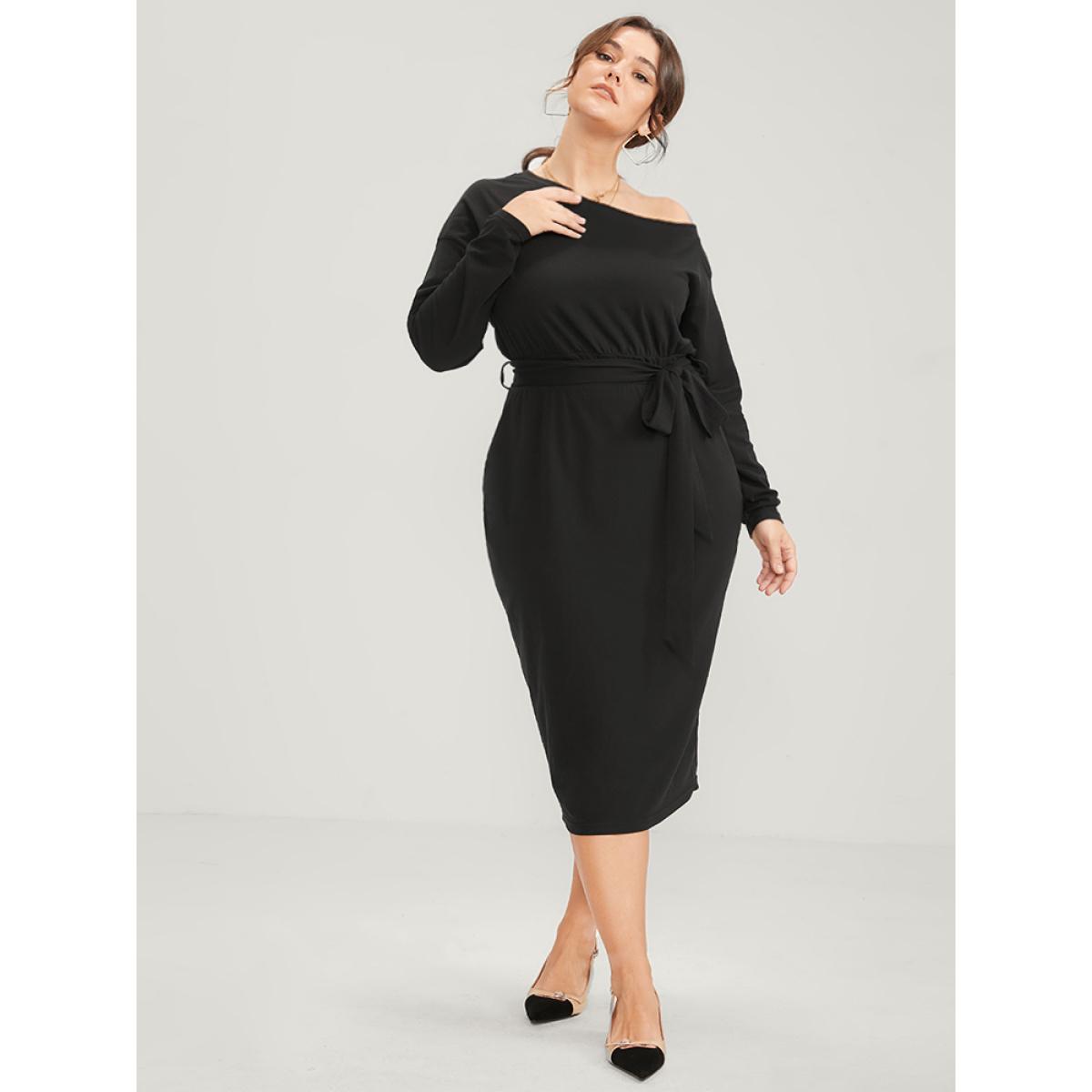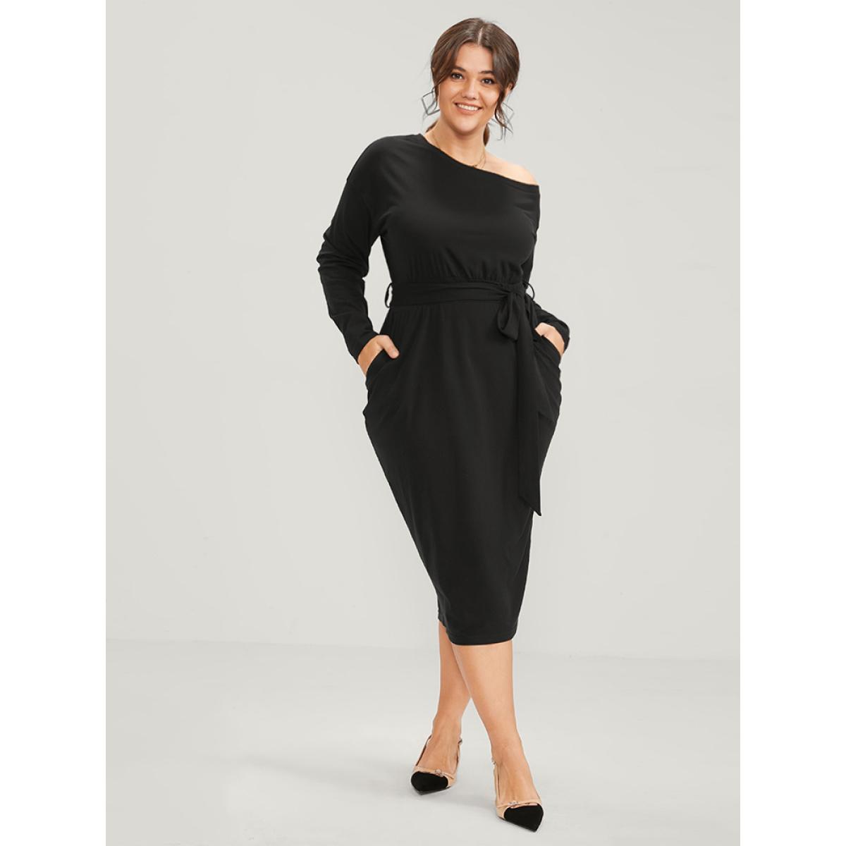 Plain Plus Size Women Workwear Knit Dress Slightly Stretchy Bodycon Long Sleeve One Shoulder Pocket Belt Going out Glamour Dresses BloomChic