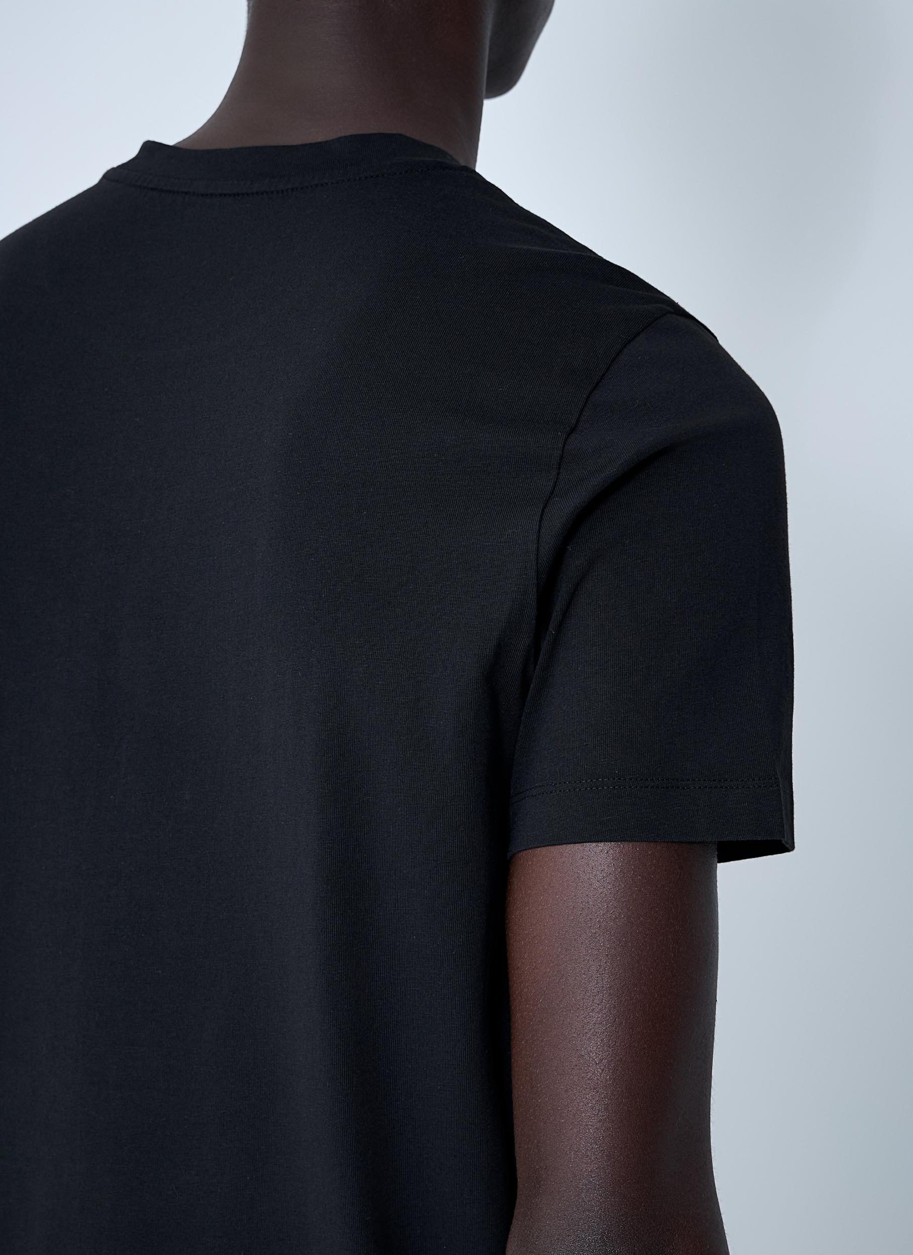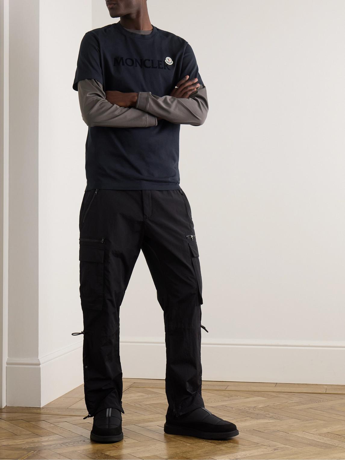 Shop Moncler Bold Logo Cotton T-shirt With Distinctive Emblem In Black from 800+ stores, starting at $279. Night blue logo T-shirt, this men's T-shirt is decorated with the oversized flocked Moncler logo and felt logo patch. This T-shirt is made of cotton knitted fabric and features short sleeves and round necks.
