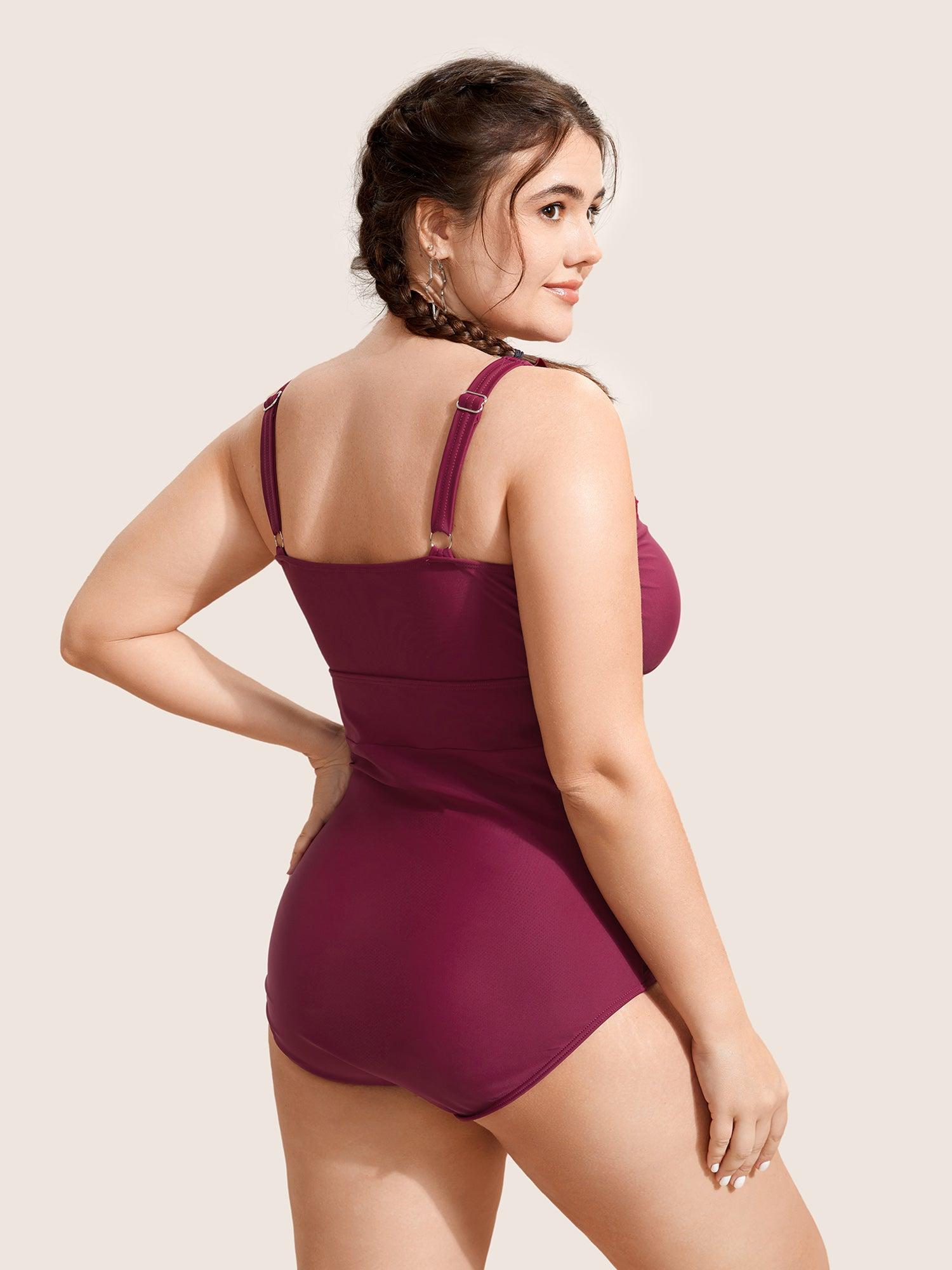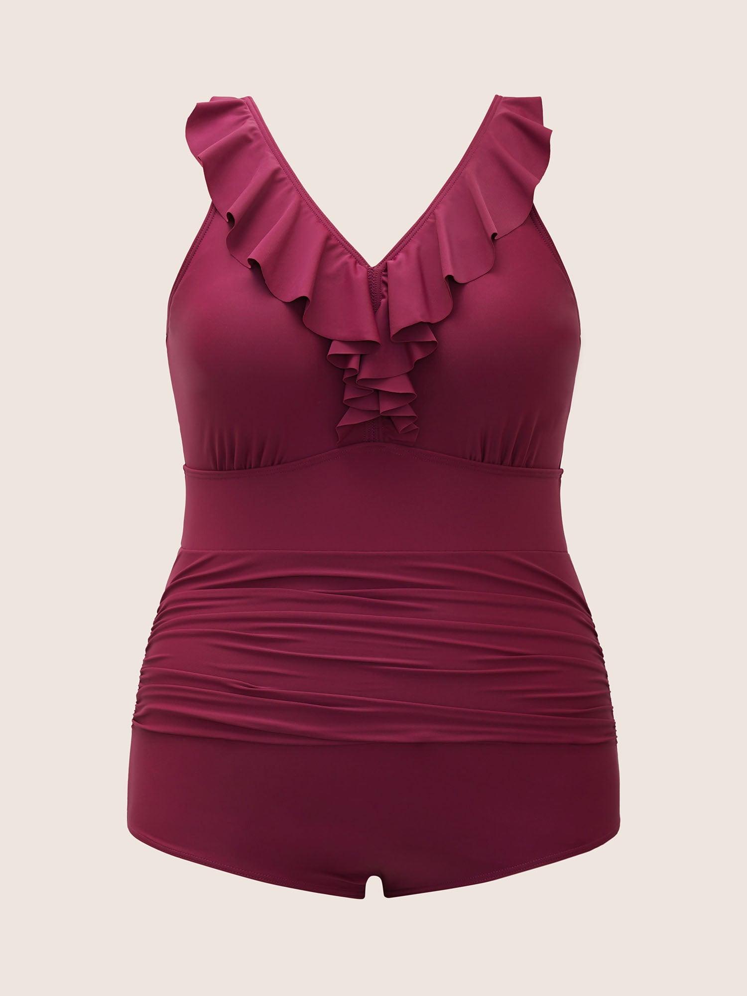 Shop Plain Ruffle Trim Gathered Sleeveless One Piece Swimsuit now and redefine your style with confidence at BloomChic. Tailored for mid and plus-size women. This trendy Swimwear Women, sizes 10-30. Season:Summer;Color:RedViolet;Style:Beach Vacation;Cup Type:Removable cups;Neckline:V-neck;Sleeve Type:Sleeveless;Prints:Non;Details:Ruffles, Gathered;Pocket:No-pocket;Belt:No-belt;Chest pad:Removable Padding;Lining:Lining;Closure Type:Non