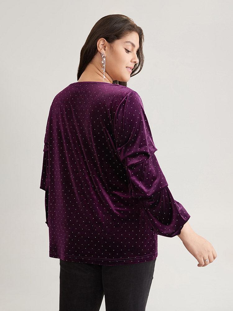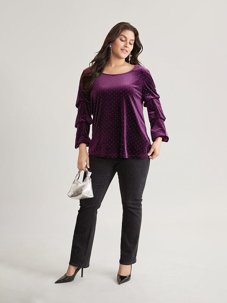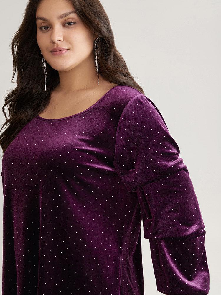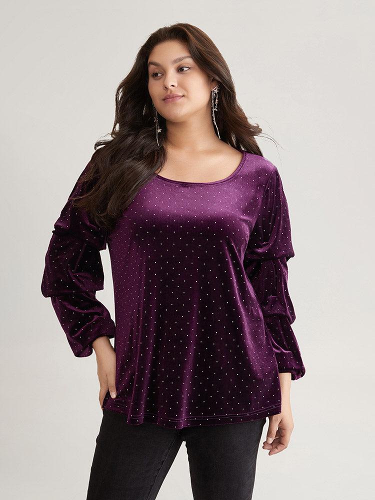 Shop Plain Velvet Rhinestone Round Neck T-shirt now and redefine your style with confidence at BloomChic. Tailored for mid and plus-size women. This trendy Tops Women, sizes 10-30. Season:Winter;Color:Eggplant;Style:Elegant;Pattern Type:Plain;Neckline:Round Neck;Sleeve Type:Regular Sleeve;Details:Rhinestone detailing, Velvet, Elastic cuffs;Pocket:No-pocket