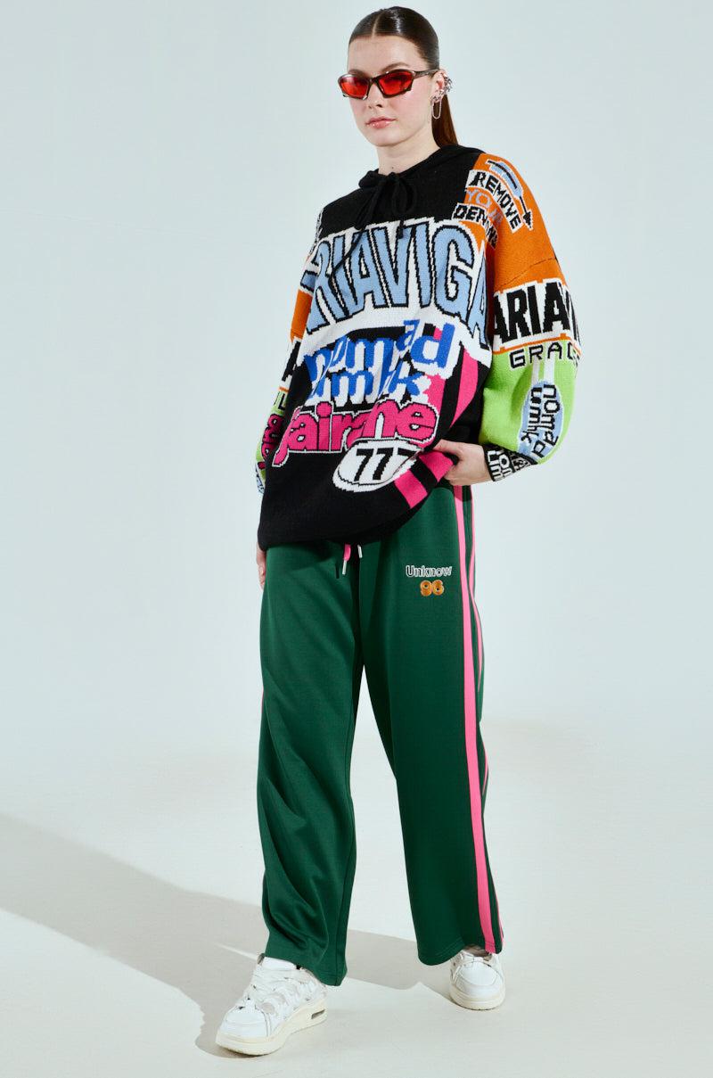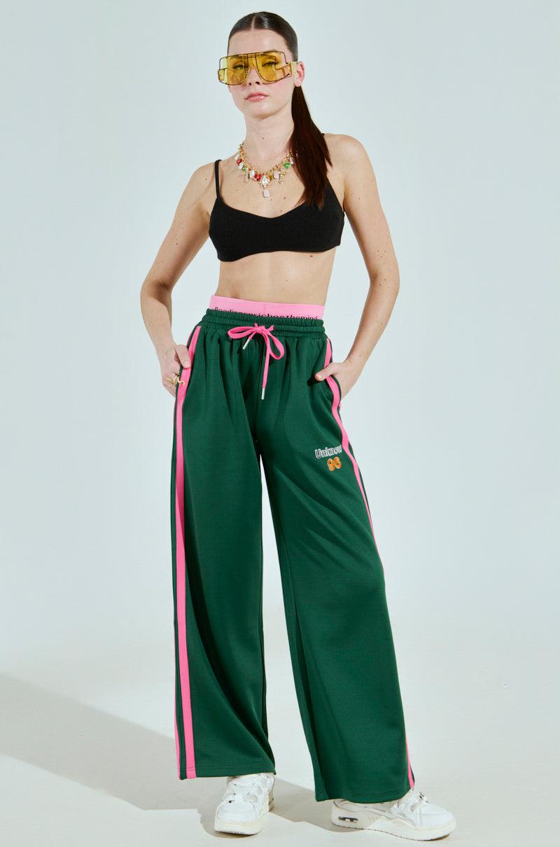 Ready, set, go! The AKIRA Label Play With Me Wide Leg Jogger is crafted from a sleek, jersey-like base and features a high rise design, a unique double waistband with a contrast elasticized detail that peeks above the shirred waistband and includes the phrase “Reading enriches the mind” in cyber-esque font. It also boasts a coordinating drawstring closure, contrast striped detailing running down both pant legs, on-seam side pockets, and an embroidered “Unknown 96” patch on the upper thigh. Complete with a wide leg silhouette, and an easy, pull-on fit. - 95% Polyester 5% Spandex- Hand Wash Cold- Stretchy- Imported (all measurements approximate from size small)- 13” Rise- 31” Inseam- Model is 5’9” and is wearing size small Product ID: 1030175