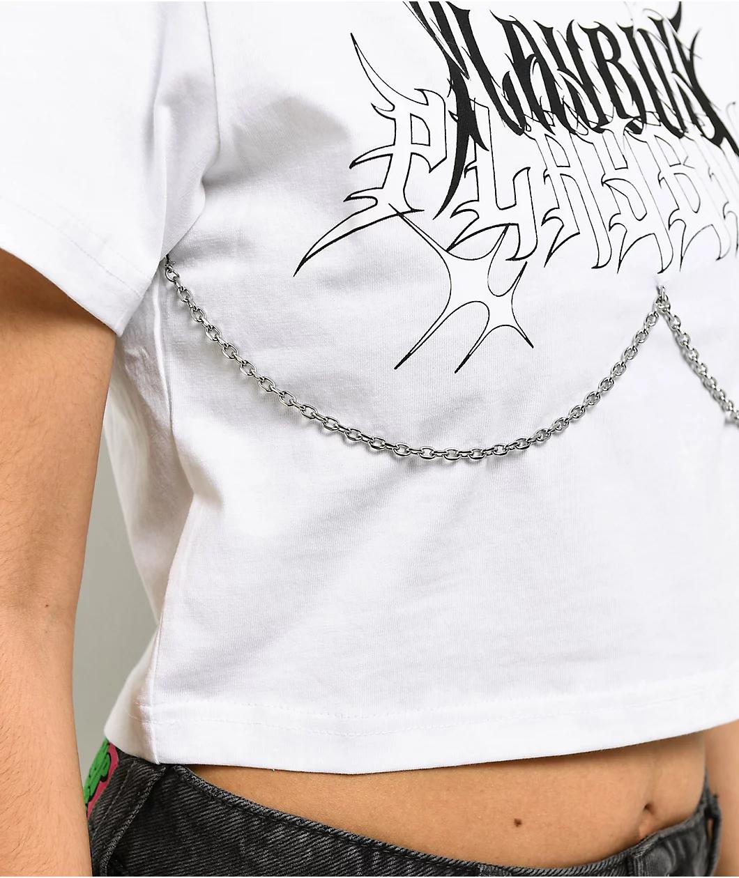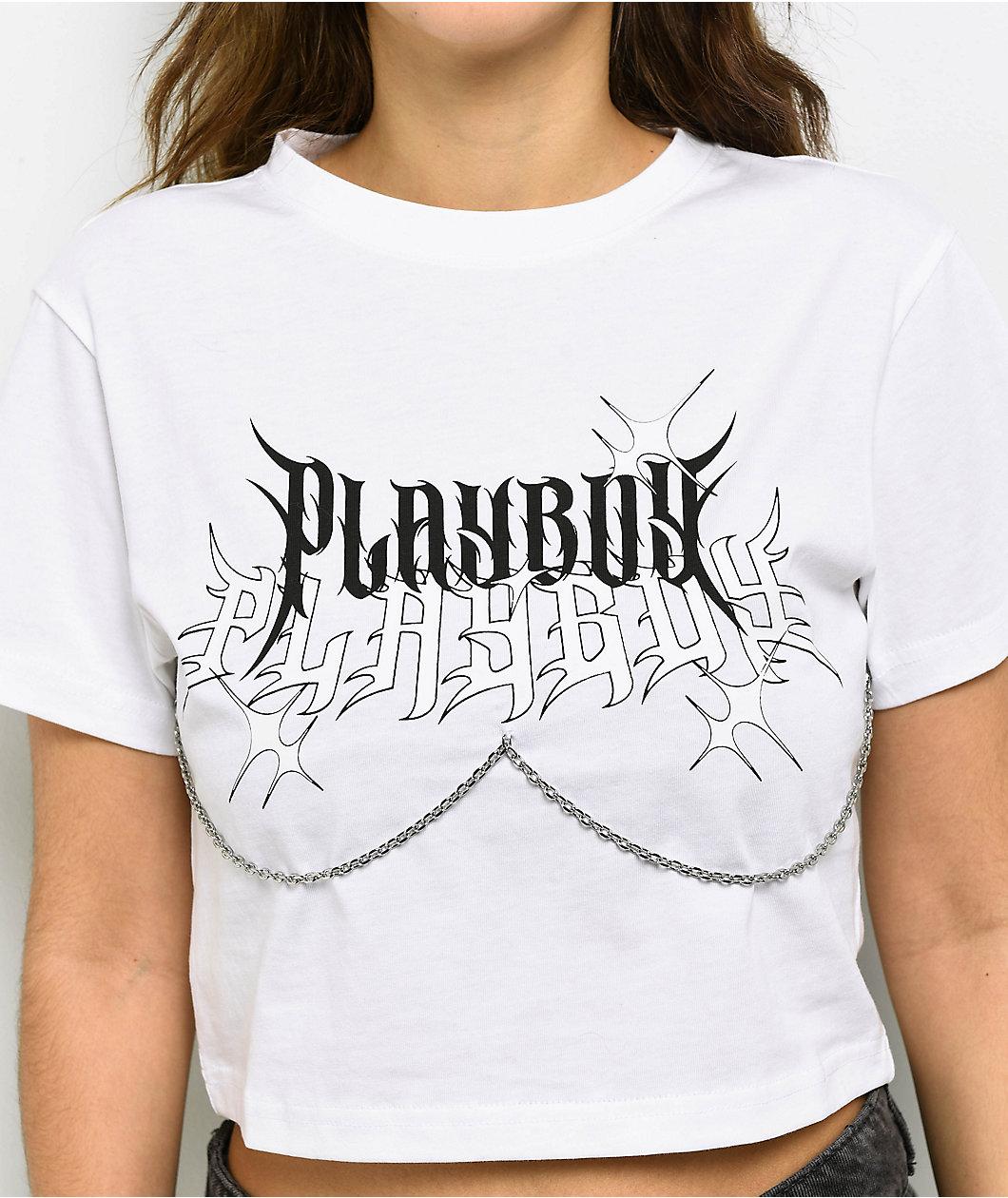 Add alternative style to any outfit with the Chain crop t-shirt from the icons at Playboy. The white crop top features a hanging silver chain on the front for unique, eye-catching style, as well as cyber sigilism branding for a counterculture vibe. A