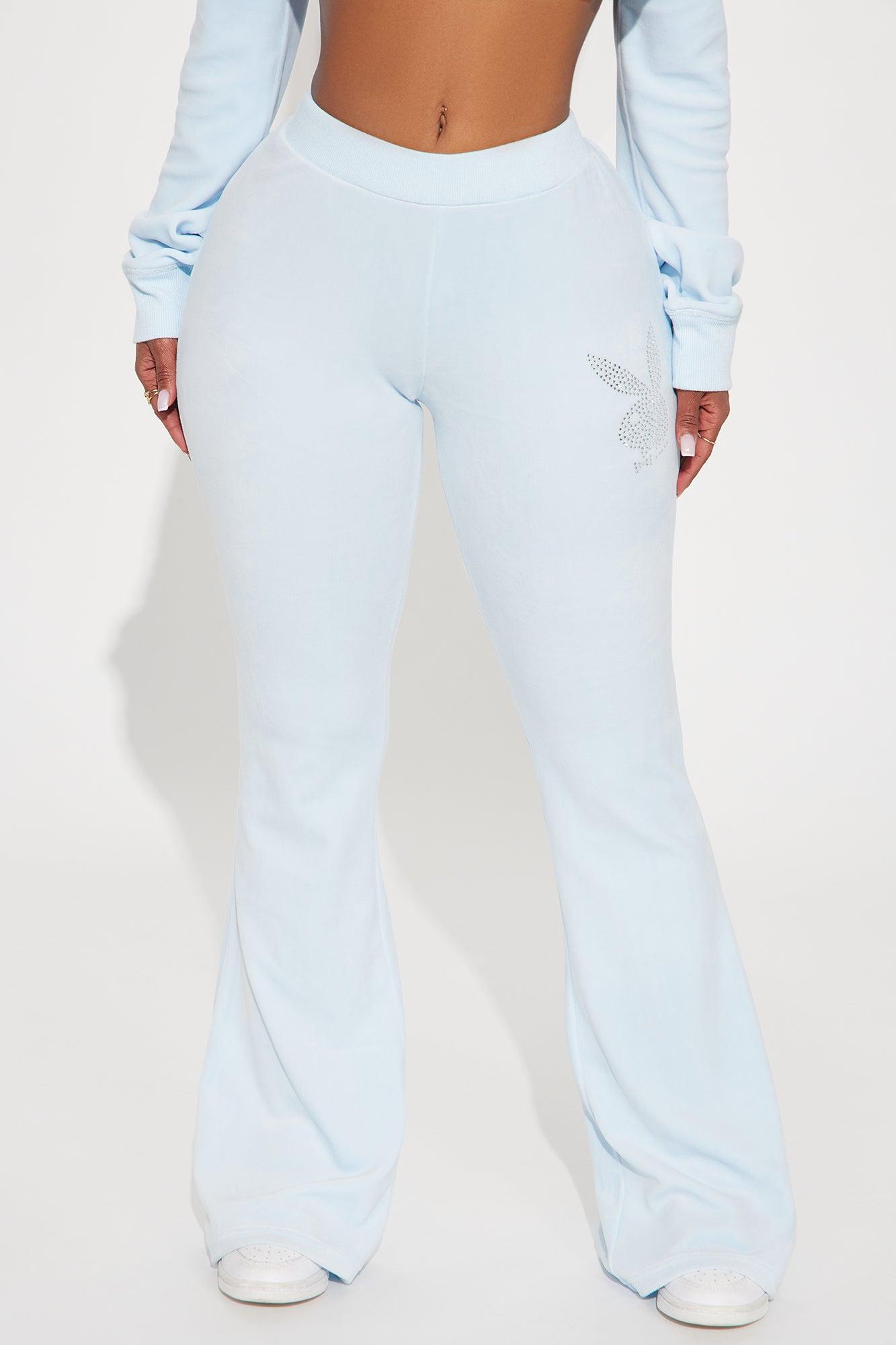 Available In Light Blue And Black. Flared Pant Elastic Waistband Drawstring Detail Rhinestone Detail Stretch Pair To "Playboy Snow Bunny Velour Zip Front Hoodie" Disclaimer: Rhinestone Placement Will Vary. 95% Polyester 5% Spandex Imported