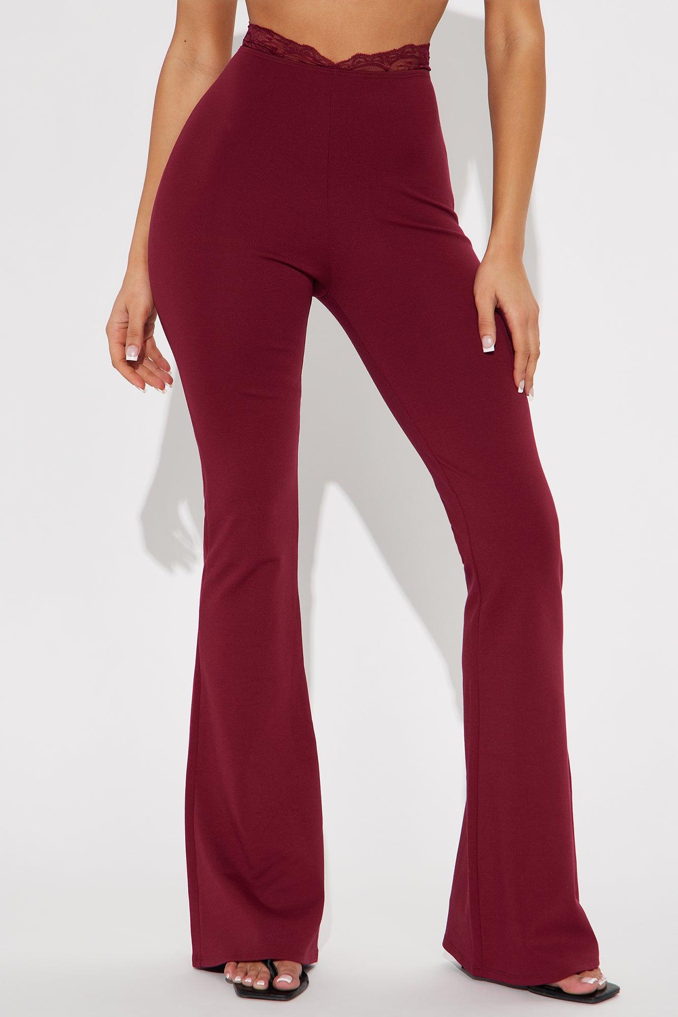 Available In Black And Burgundy. Flare Pant Low Rise V Waist Elastic Waistband Lace Trim Millennium Stretch 33" Inseam Self: 68% Rayon 28% Nylon 4% Spandex Imported