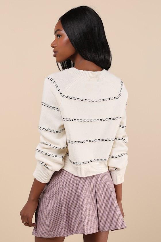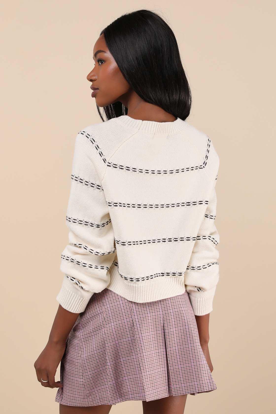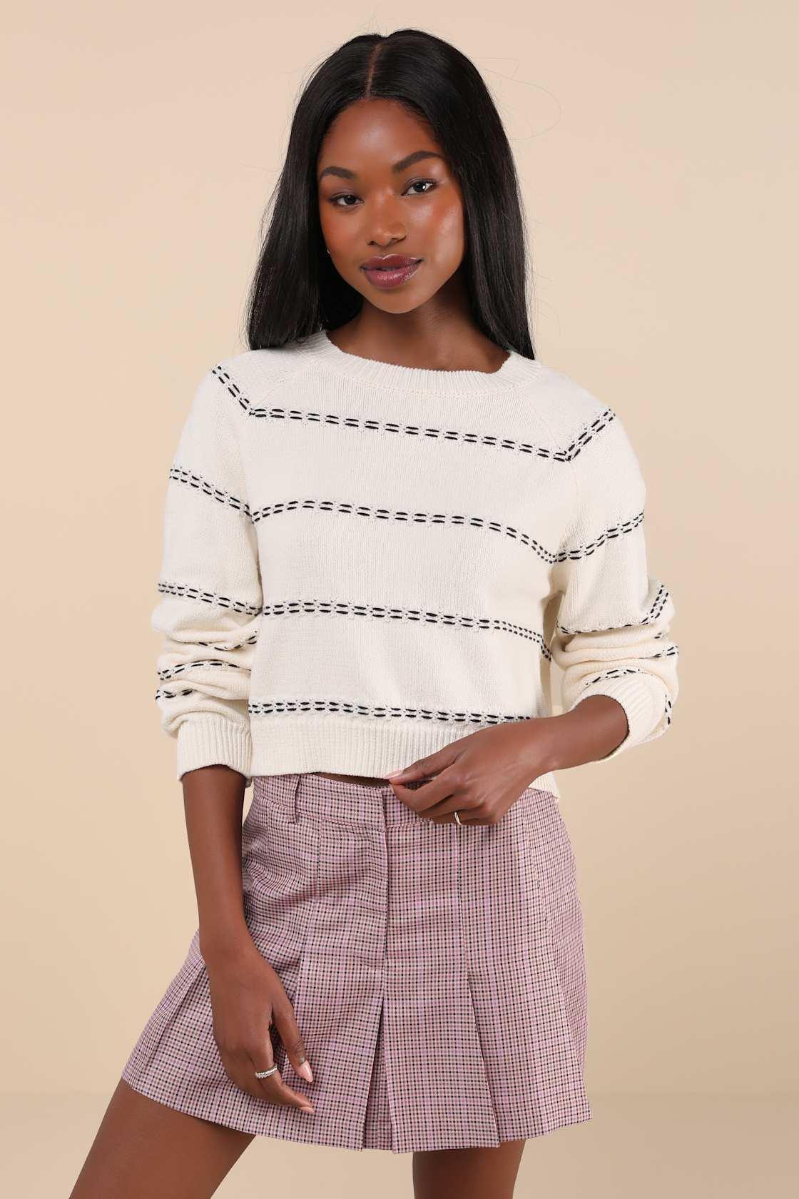 Take a moment to stop and appreciate how cute you look in the Lulus Pleasant Perception Ivory Stitched Long Sleeve Sweater! Cozy sweater knit features black stitching details that create a stripe-like design across this pullover. Long, raglan-style sleeves frame the boat neckline and boxy bodice that finishes at a slightly cropped, banded hem. Ribbed knit accents the neckline, cuffs, and hem.