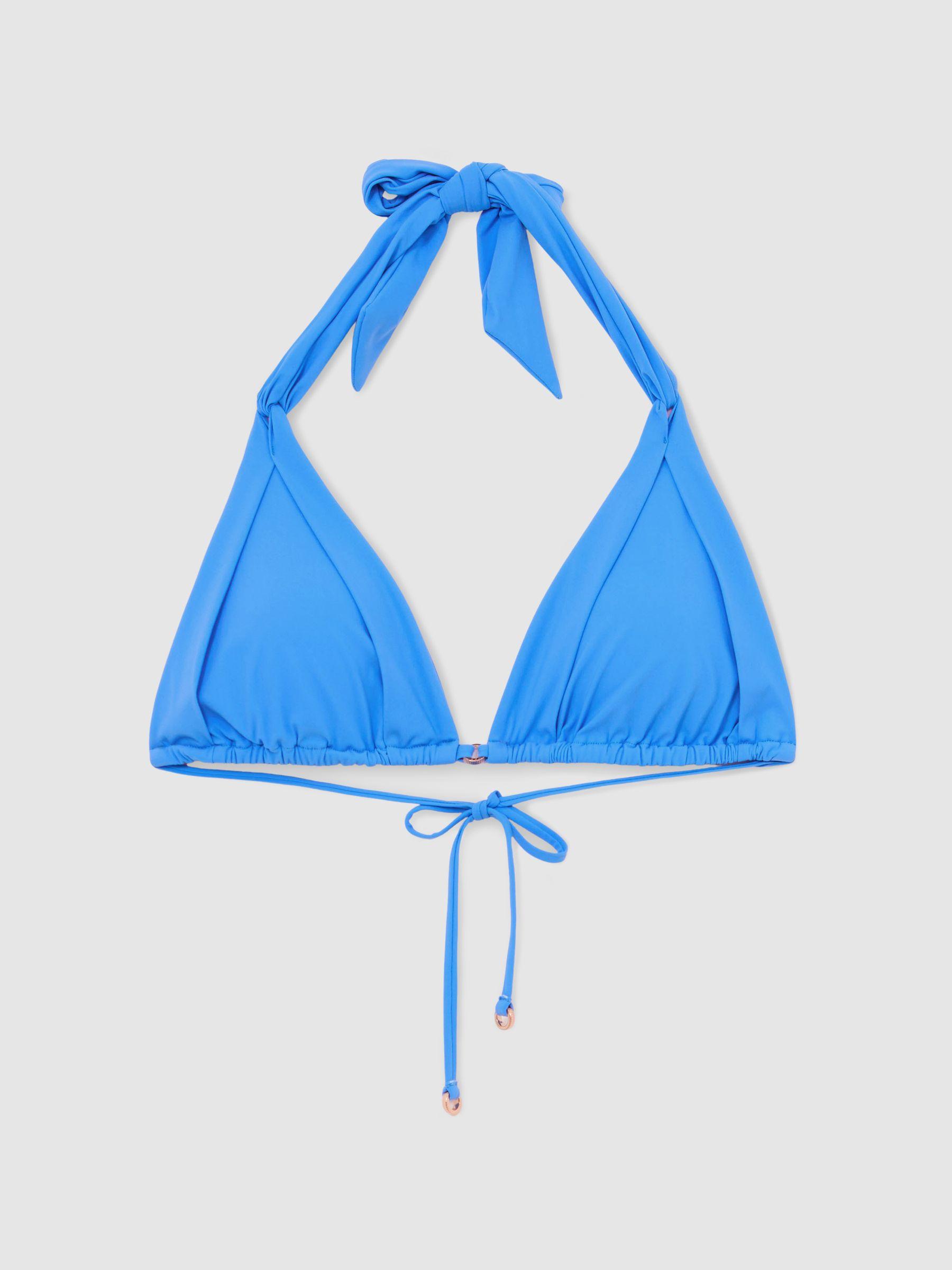 The Matilda bikini top is shaped with classic triangle cups and subtle pleat detailing. It ties at the neck and back, with removable padding and gold-tone ring hardware. Triangle cups. Pleat details. Removable padding. Self-tie halterneck and back. Gold-tone ring hardware.