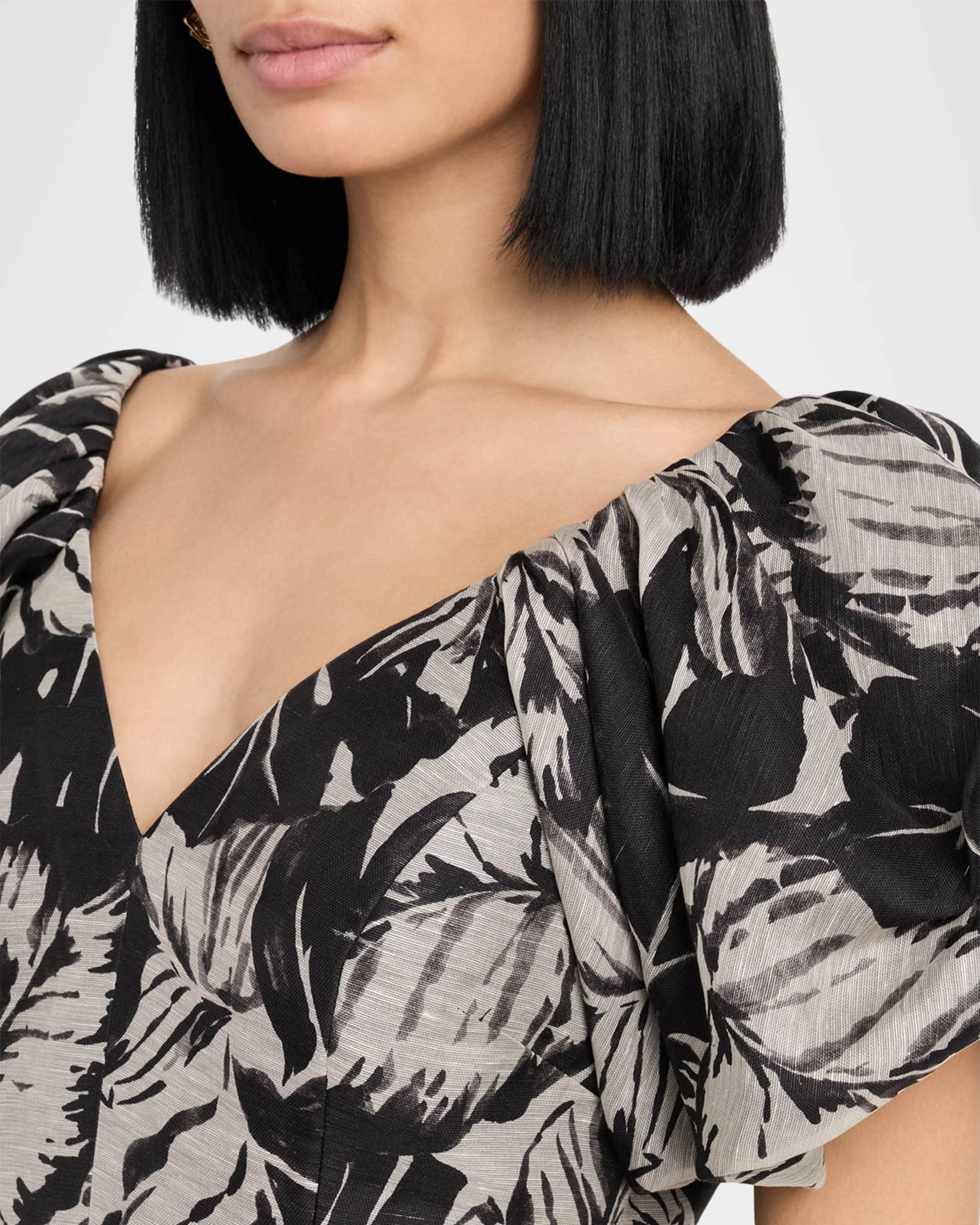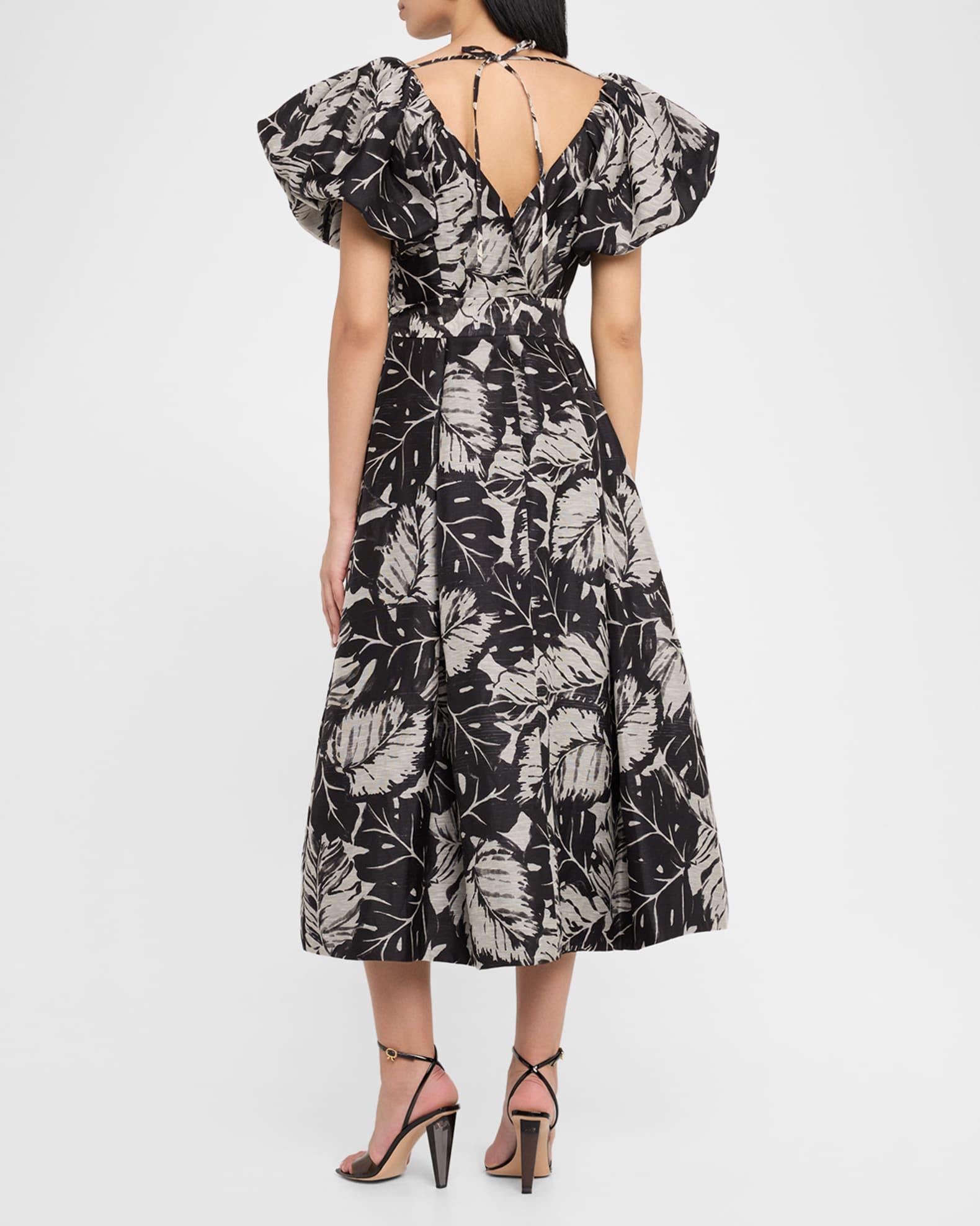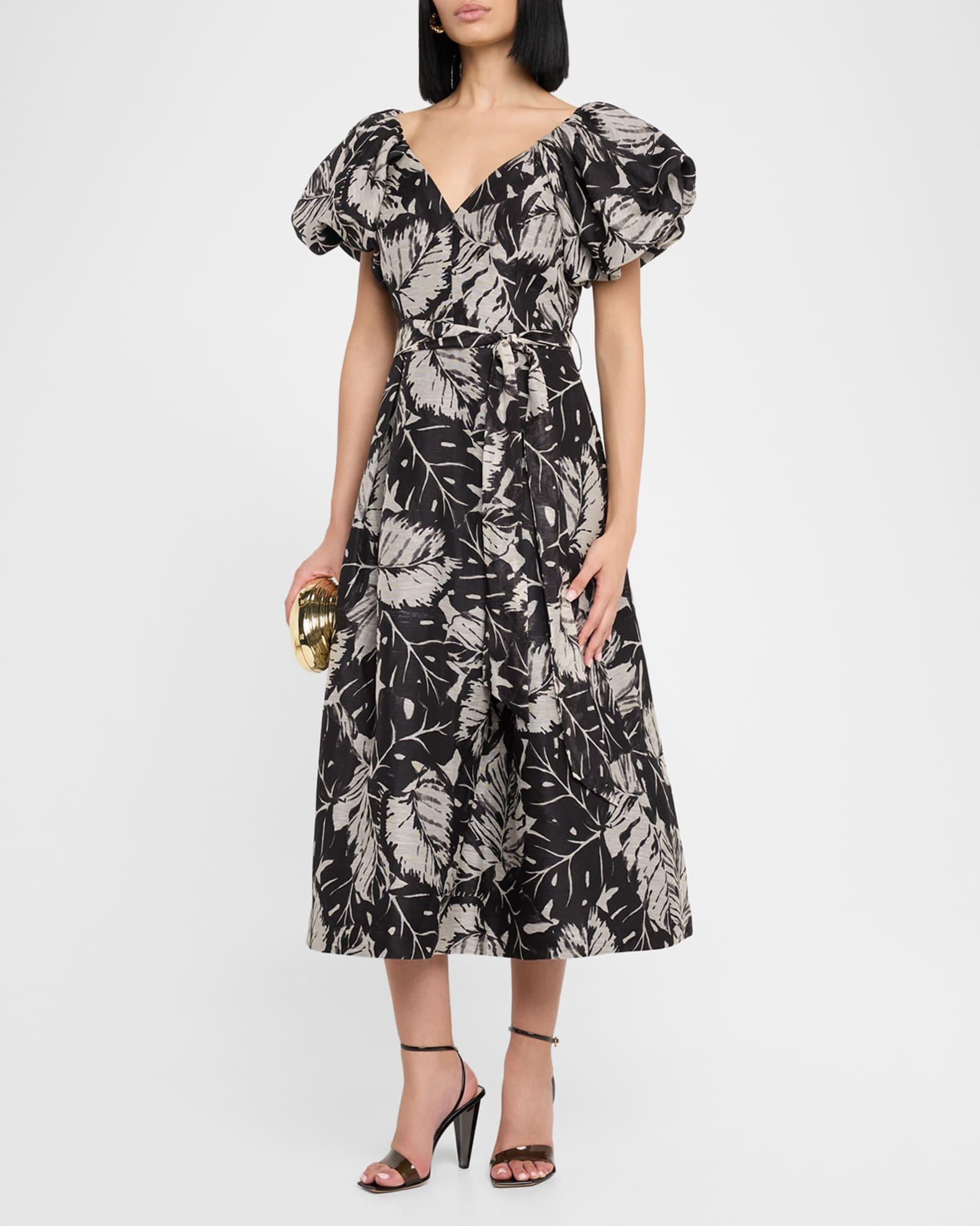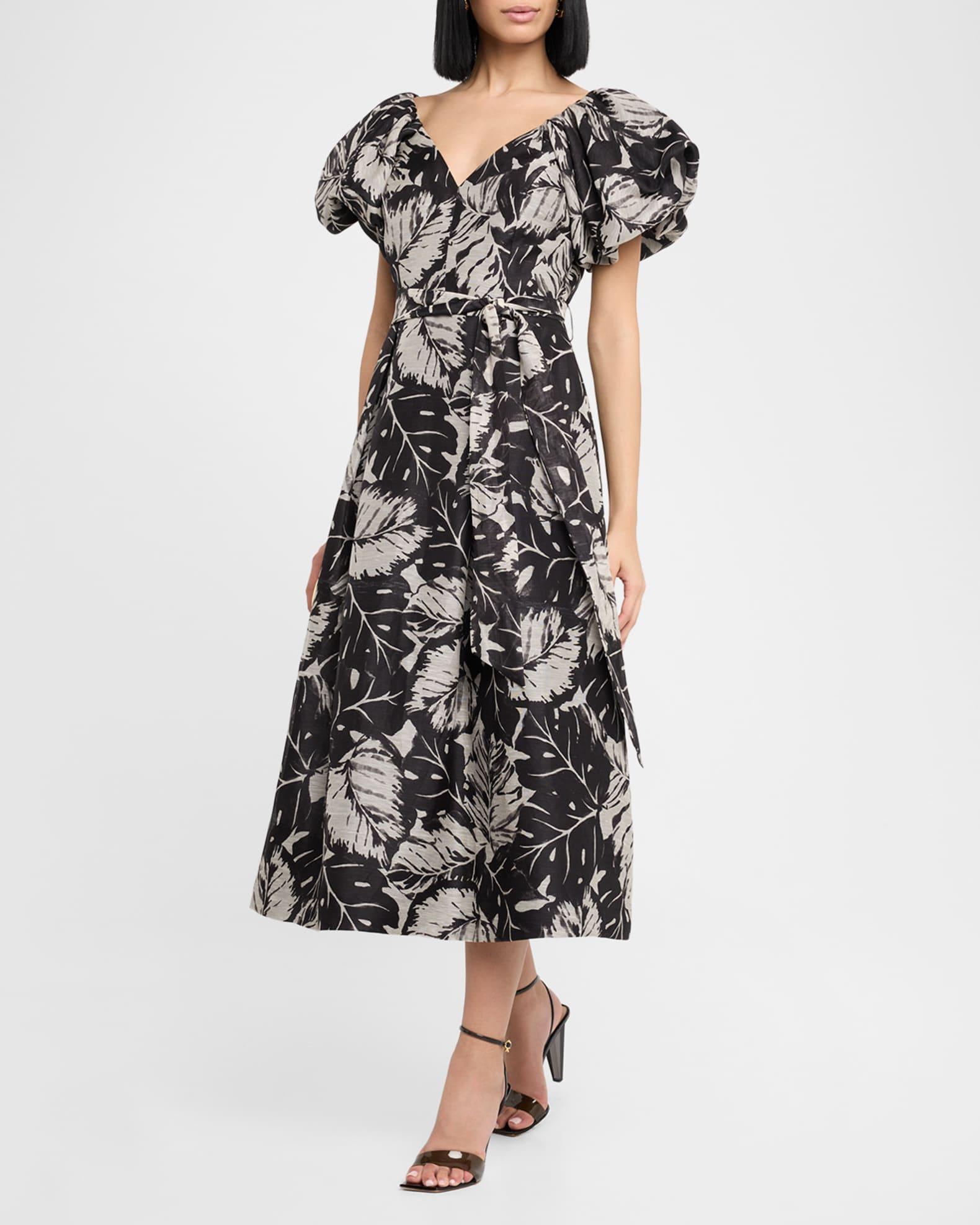 Rickie Freeman for Teri Jon pleated midi dress in linen features a tropical botanical print Approx. 50.5"L from shoulders to hem V neckline Short puff sleeves Princess seams Upper back self-tie Waist self-tie Hem falls below the knee A-line silhouette Invisible back zipper Silk/linen Imported
