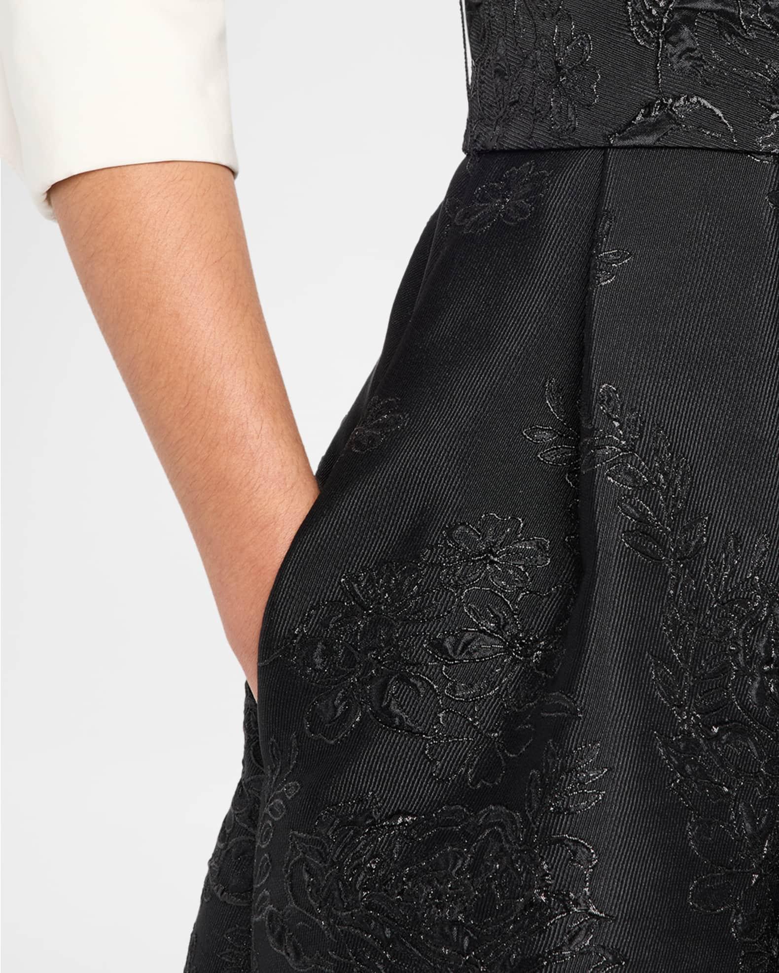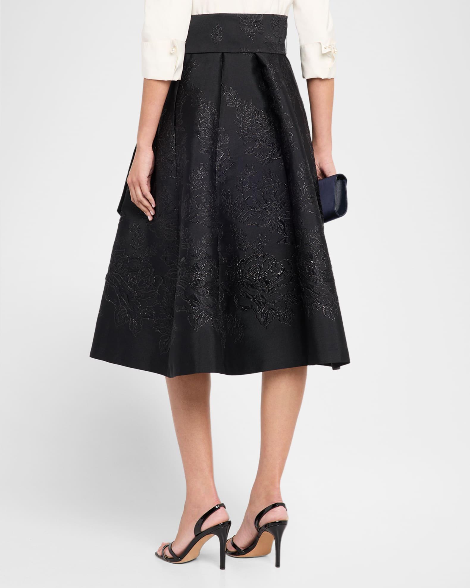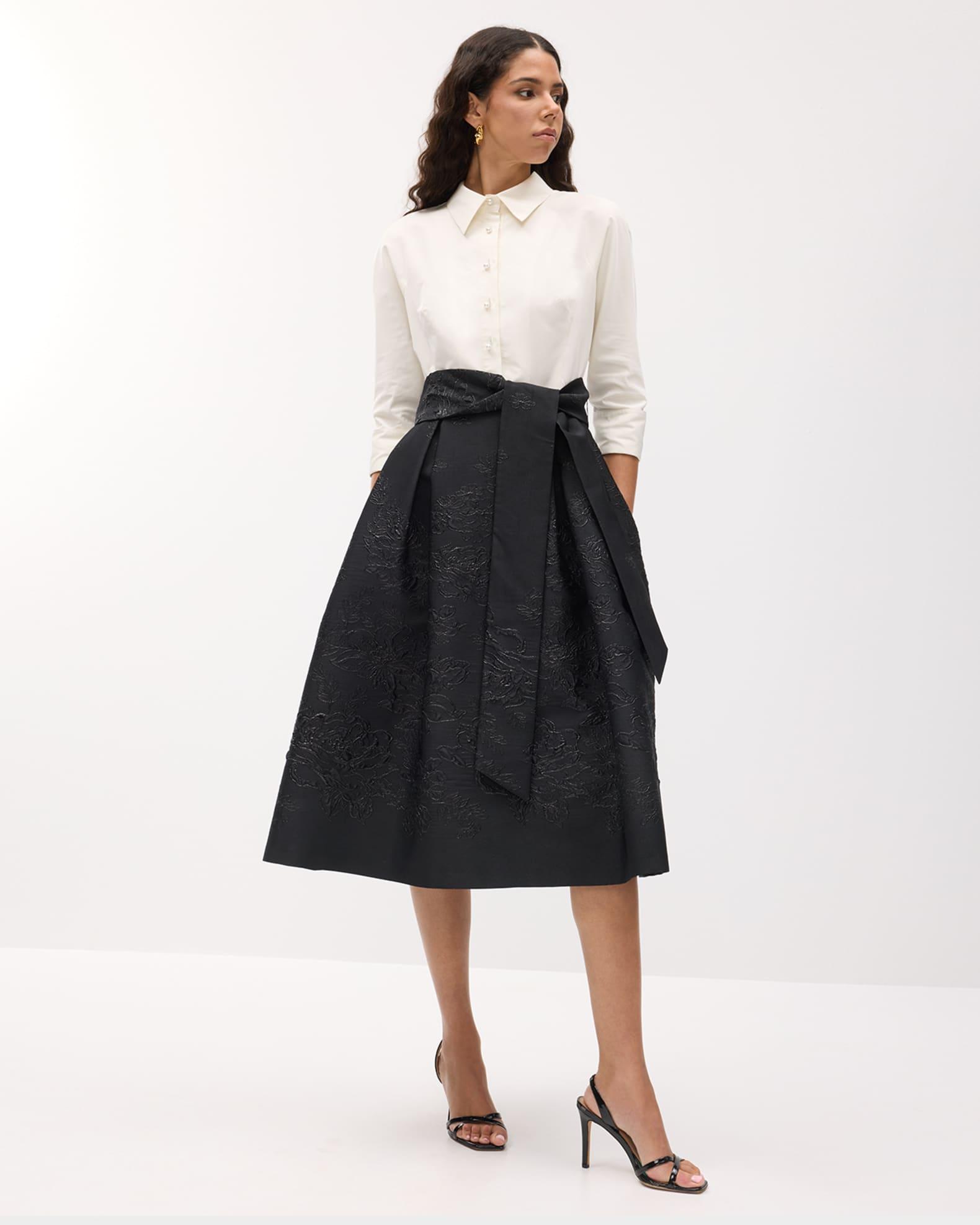 Rickie Freeman for Teri Jon mixed media shirtdress is crafted with a taffeta bodice and pleated metallic floral jacquard skirt Point collar; button front 3/4 sleeves; button cuffs Waist self-tie On-seam pockets Hem falls below the knee A-line silhouette Polyester Imported