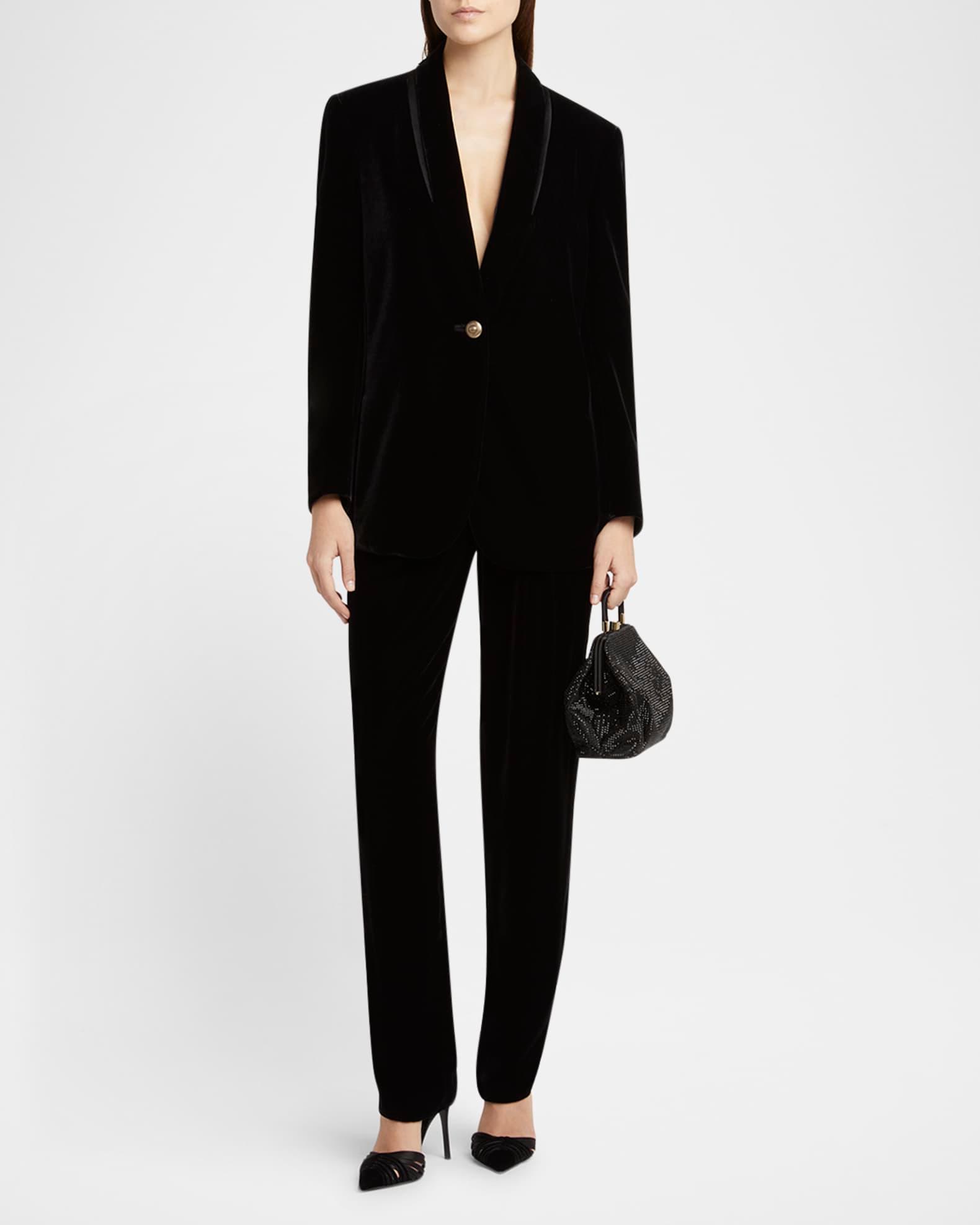 Giorgio Armani velvet trousers finished with a pleated front High rise Side pockets Straight legs Full length Hook/zip fly Viscose/silk Dry clean Made in Italy