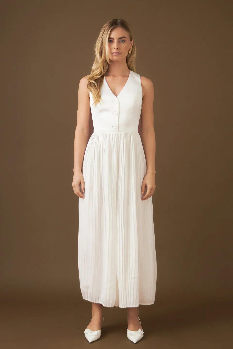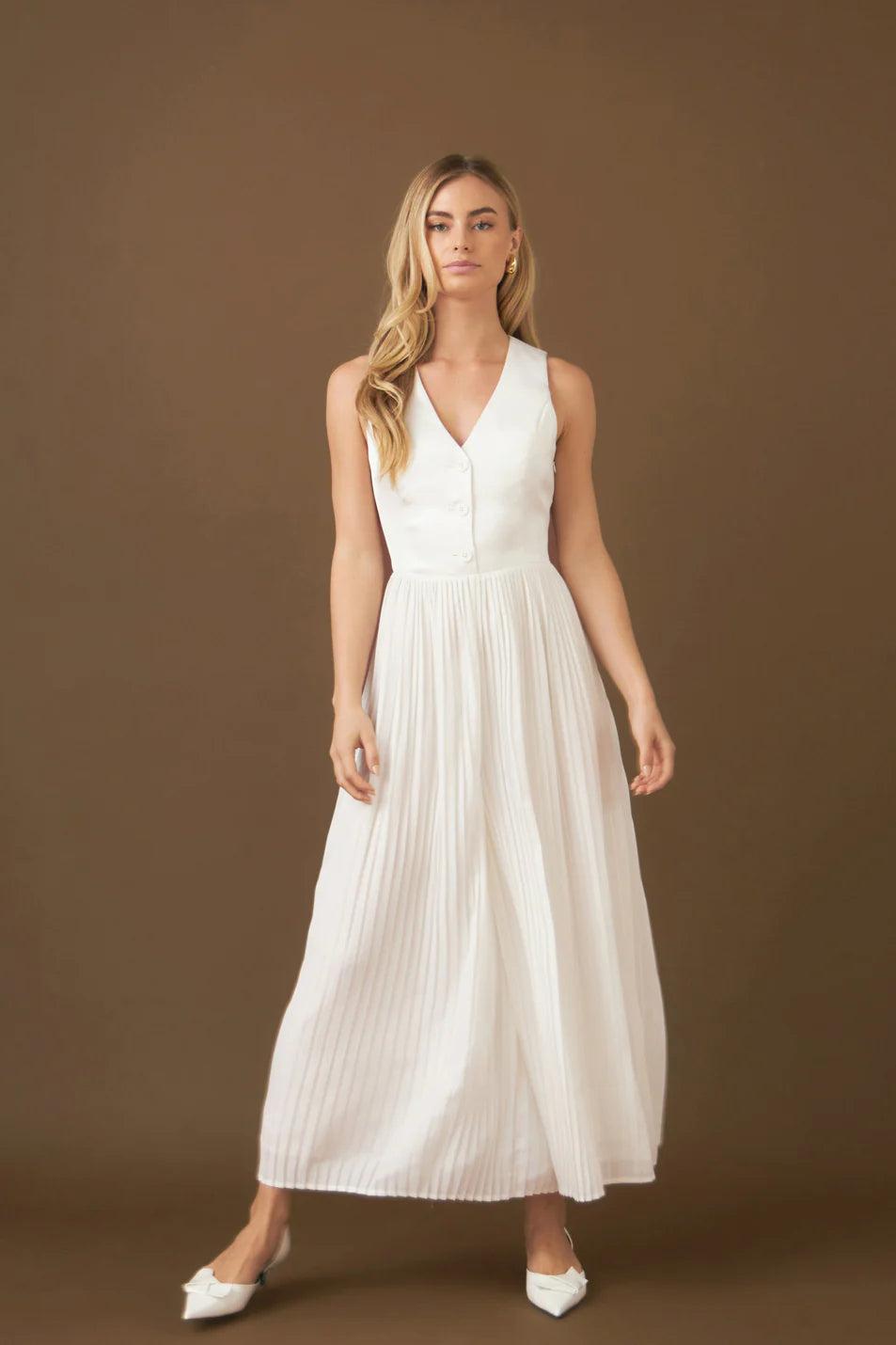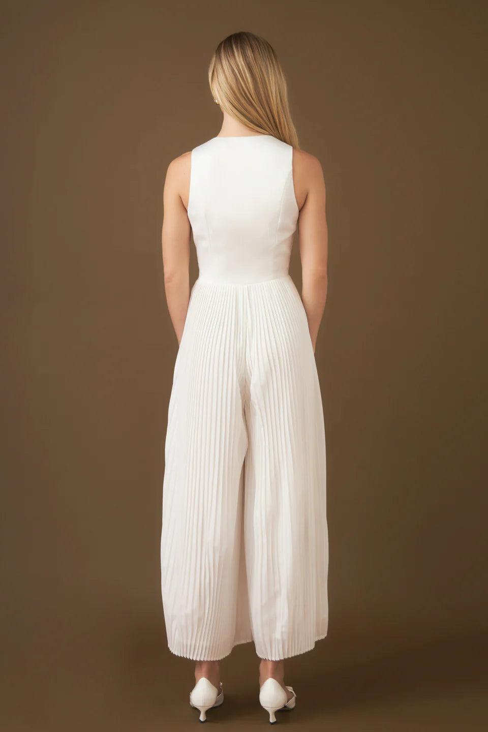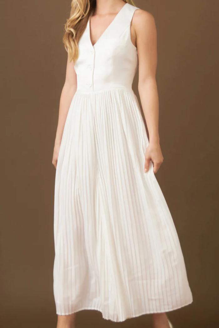 Our Mixed Media Vest Pleated Jumpsuit is a unique design combining different fabrics in one eye-catching item. The long jumpsuit features a woven vest contrasted with pleated chiffon pants. The combination of materials ensures a unique look suited to any occasion. The soft fabric and tailored bodice are flattering and comfortable. Perfect for modern women on the go who want to make a statement. Enjoy this stylish jumpsuit and be ready to turn heads.