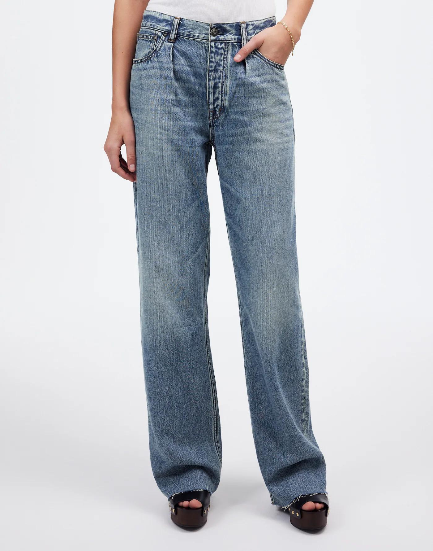 The cut: designed to be slung low, these full-length jeans have front pleats and a baggy wide leg. In Billings, our medium wash that mimics the natural color shifts of aged indigo.