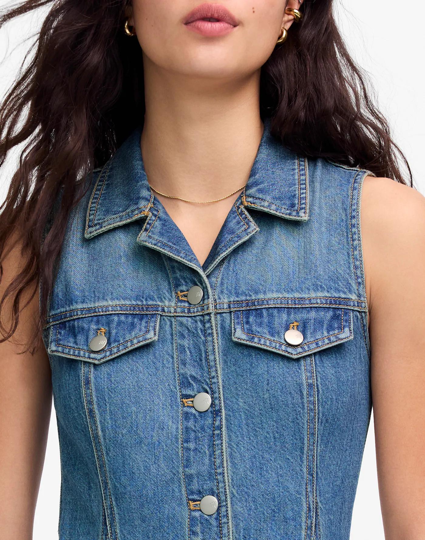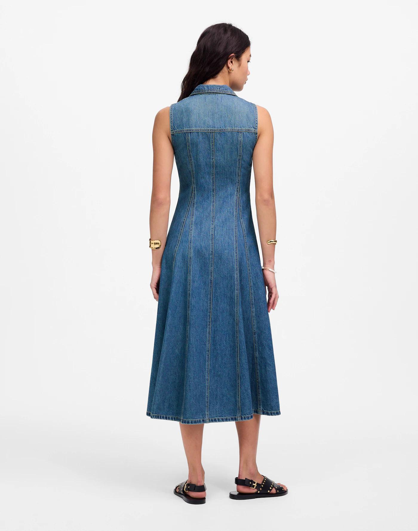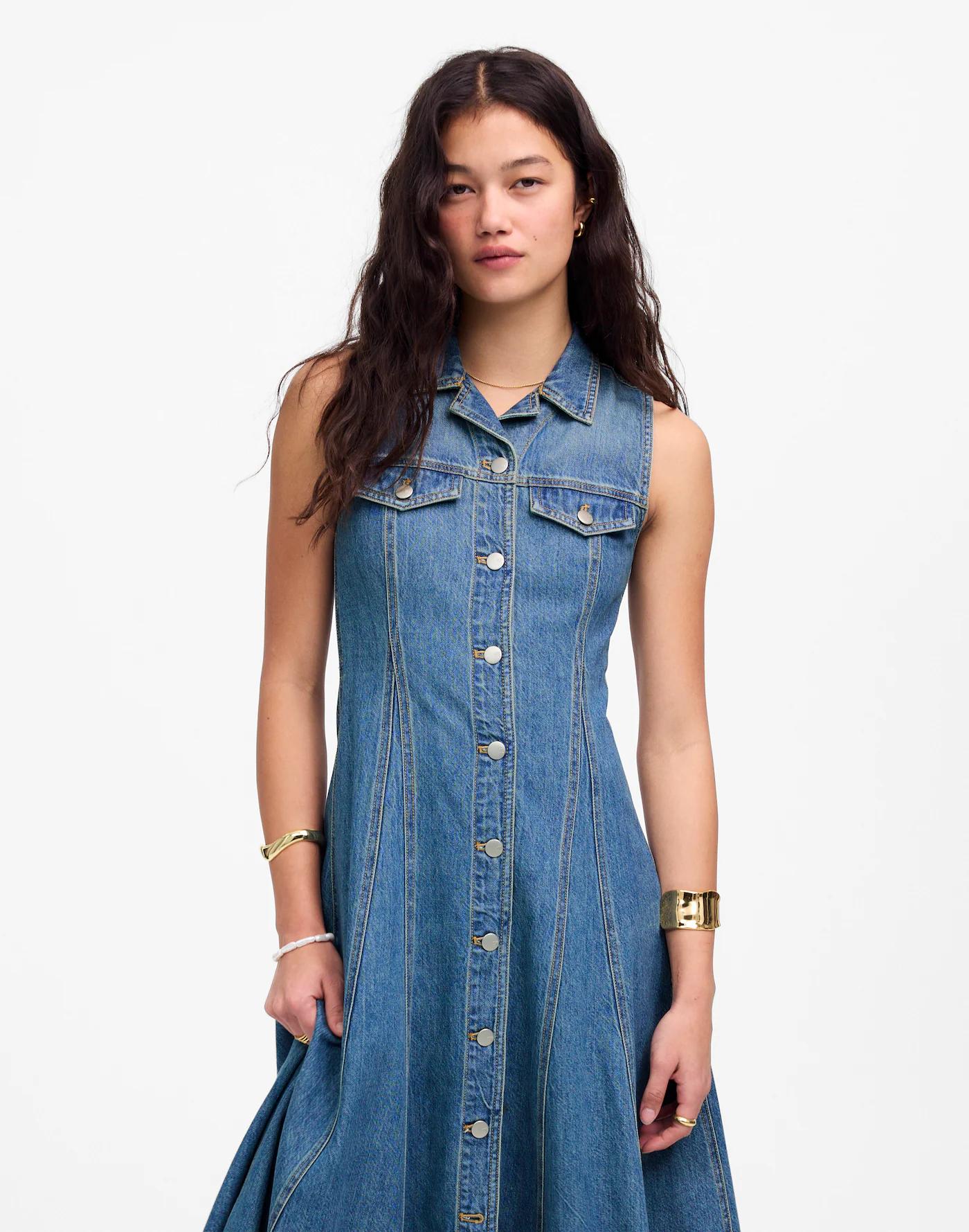 Faded to perfection, this sleeveless midi shirtdress strikes the right balance between old-school cool and modern ease. Crafted from our Airy Denim fabric with a notch collar, faux chest pockets and pleats for added fullness and movement. In Billings, a medium wash that mimics the natural color shifts of aged indigo.