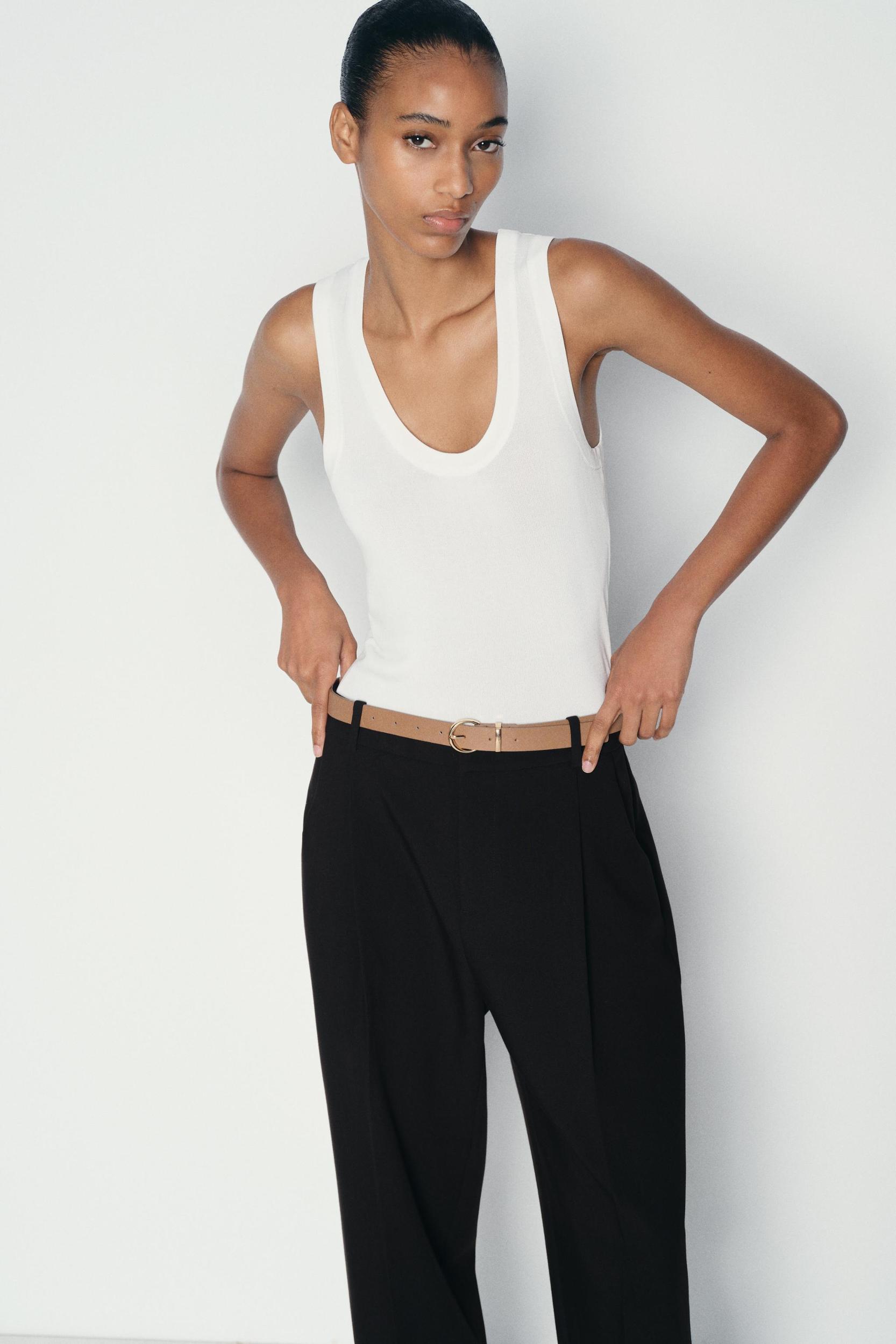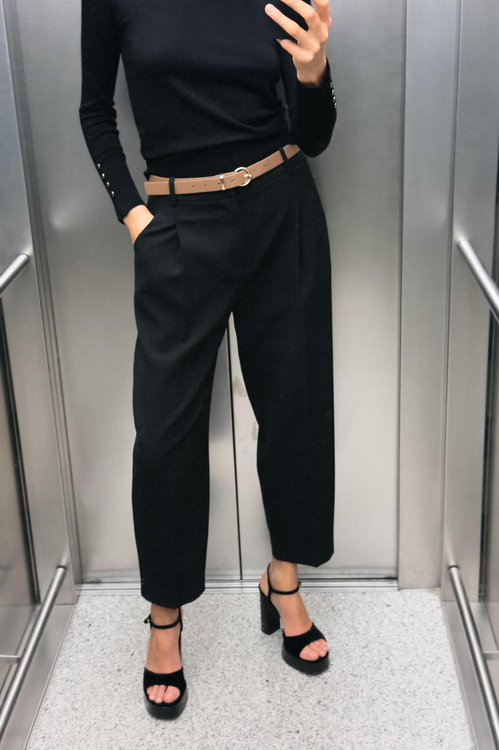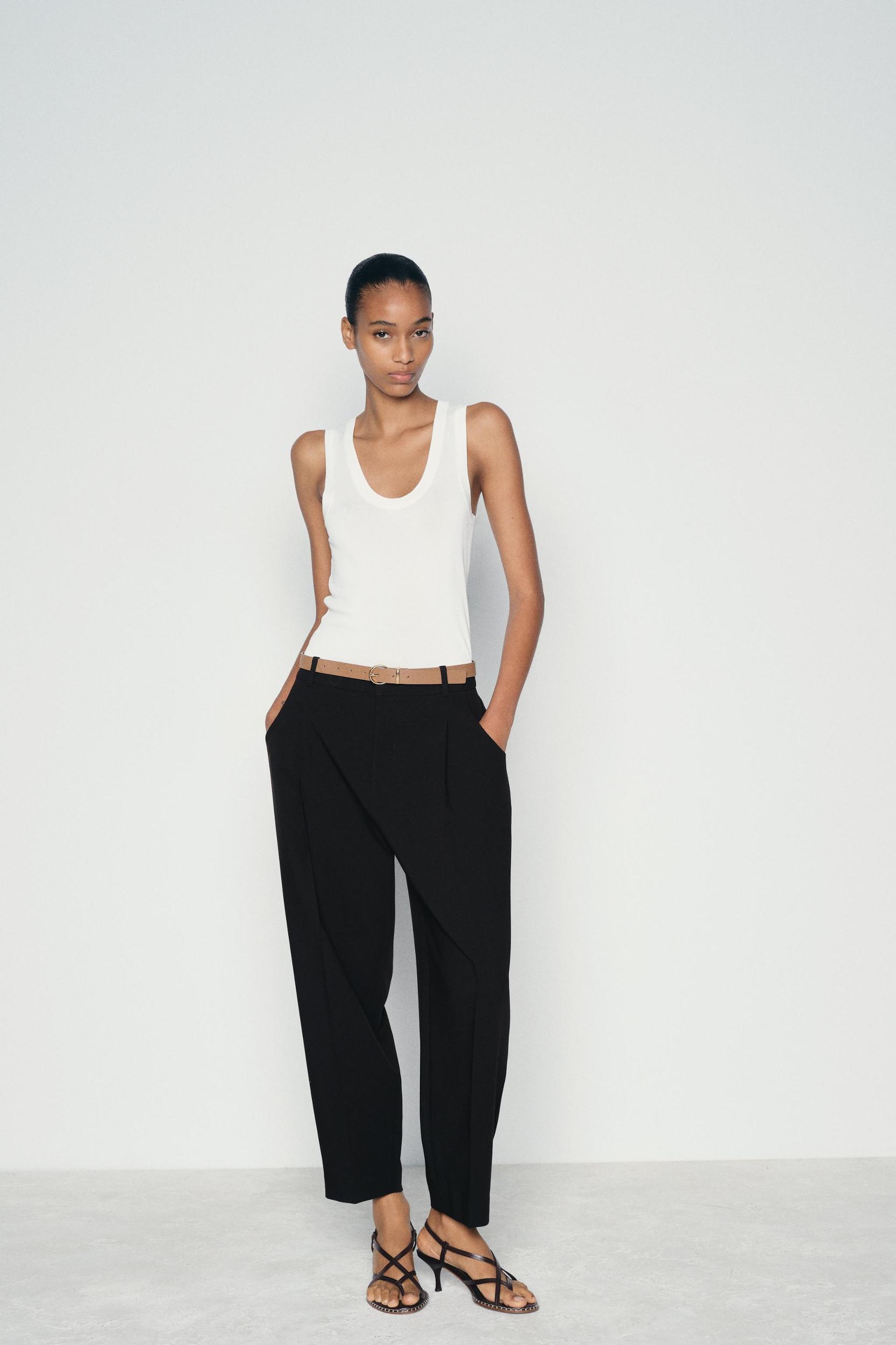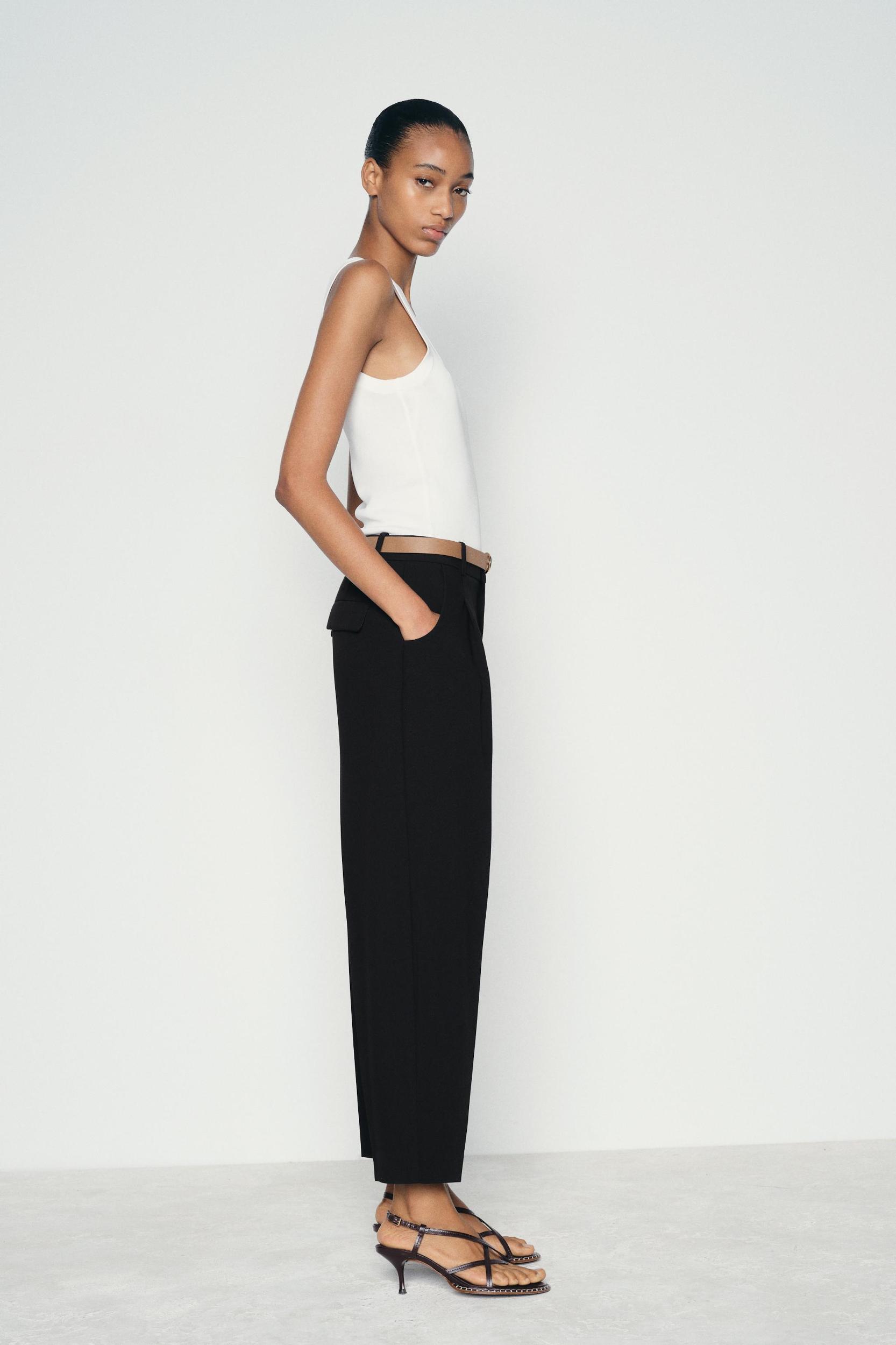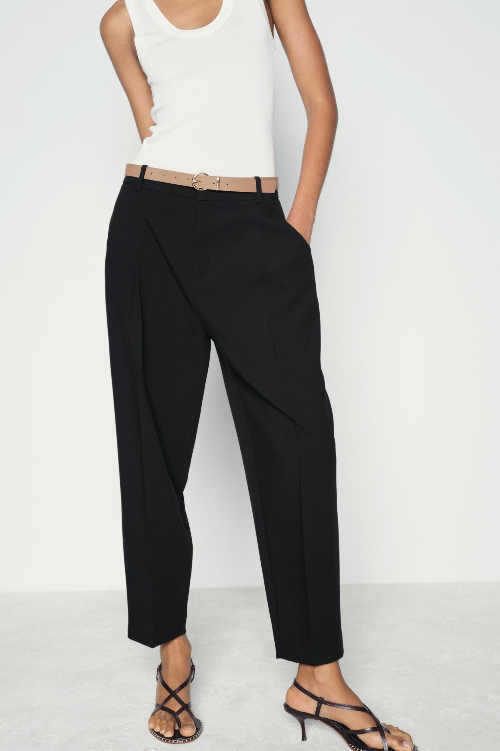 Ankle pants with a high waist with front pleats and belt. Front pockets and false back pockets with flaps. Front zip, inner button, and metal hook closure.