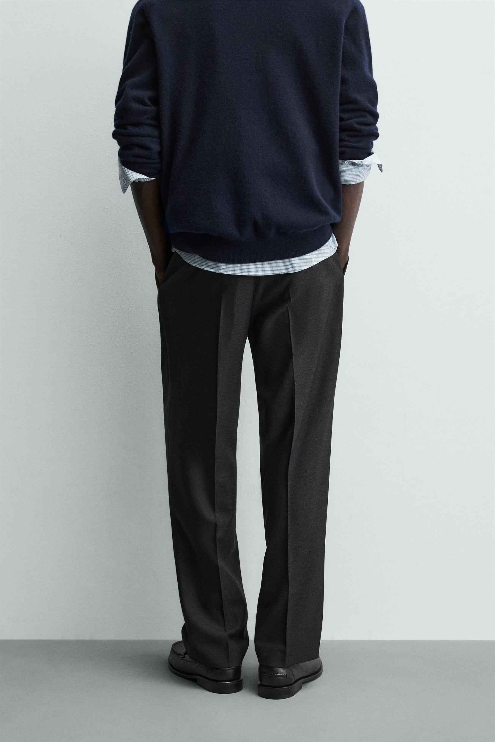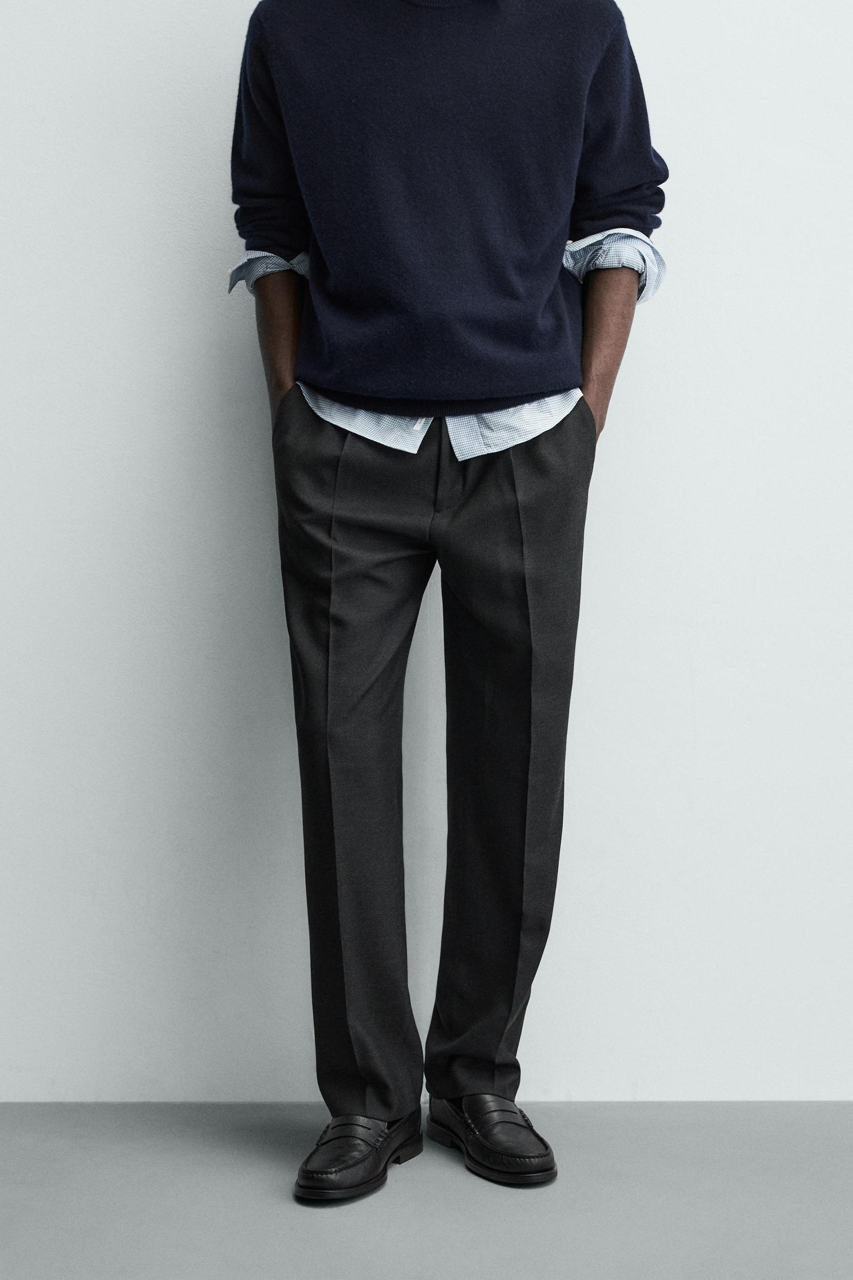 Regular fit pants. Waist with front pleats. Front pockets and back double-welt pockets with button. Front zip and button closure.