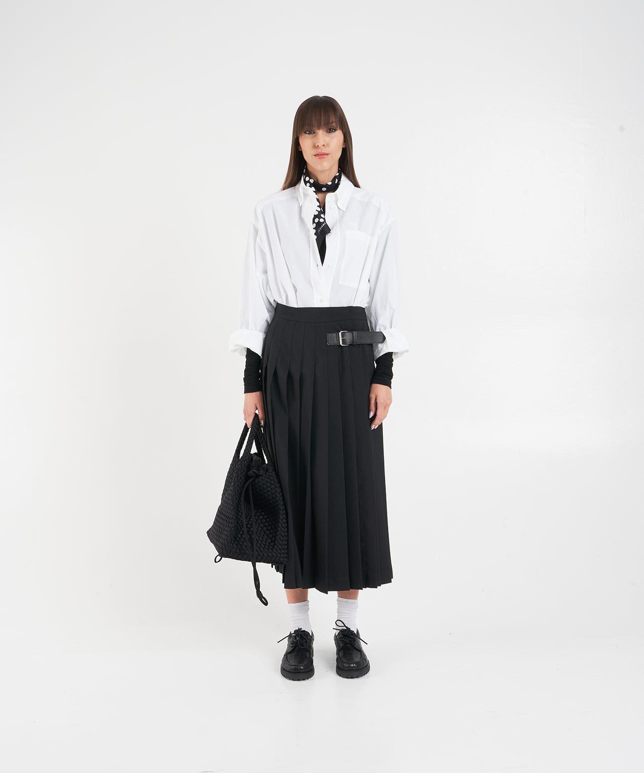 The timeless pleated skirt 'KEO' by Otto d ame impresses with its elegant midi length and the fine, continuous pleats that give it a flowing silhouette. A discreet belt with a buckle closure accentuates the waist. This versatile skirt, crafted in Italy, is a luxurious essential for any wardrobe and offers endless styling possibilities.Midi lengthPleated foldsWaist belt with buckle closureMade in ItalyPleated skirt