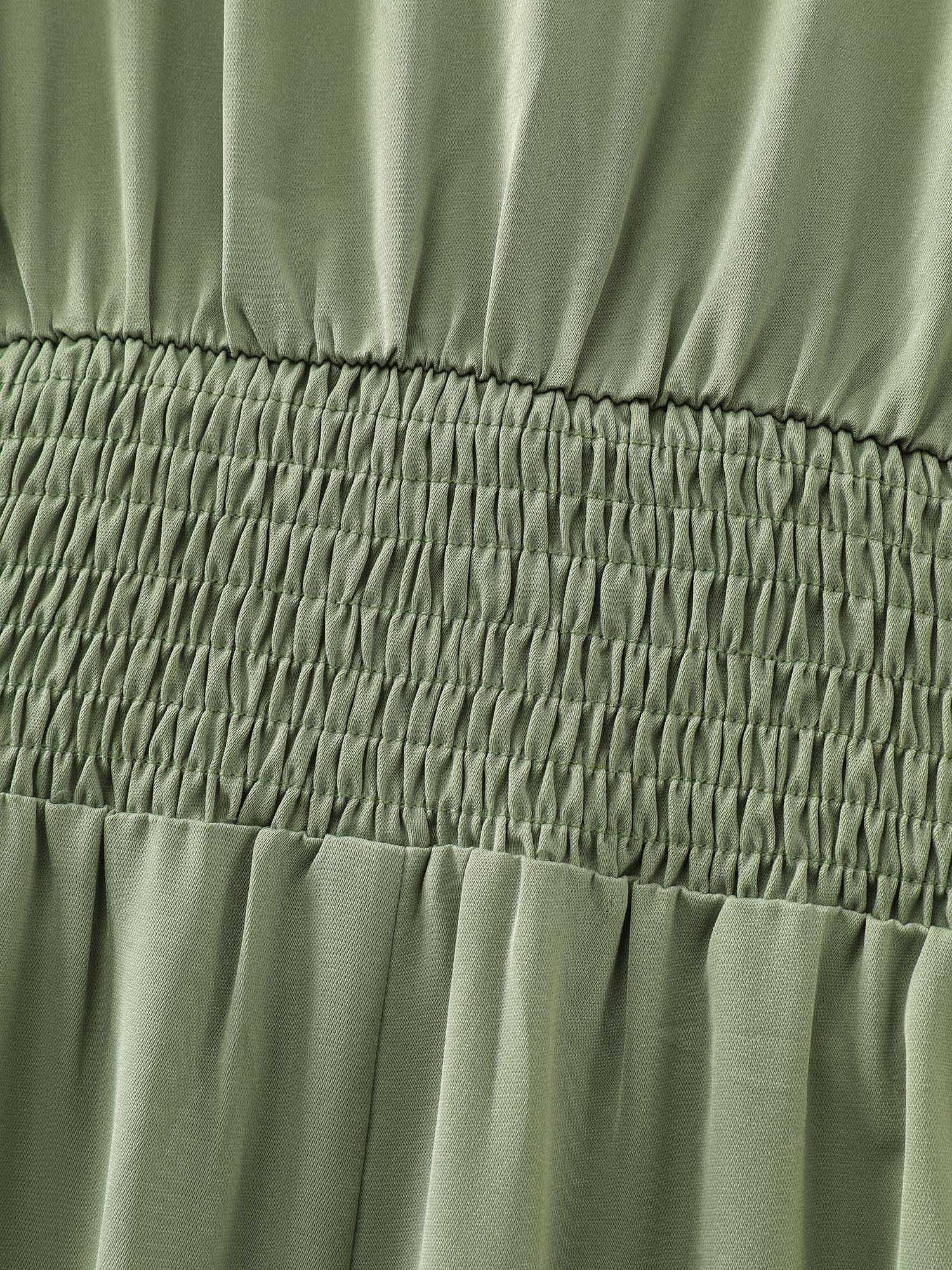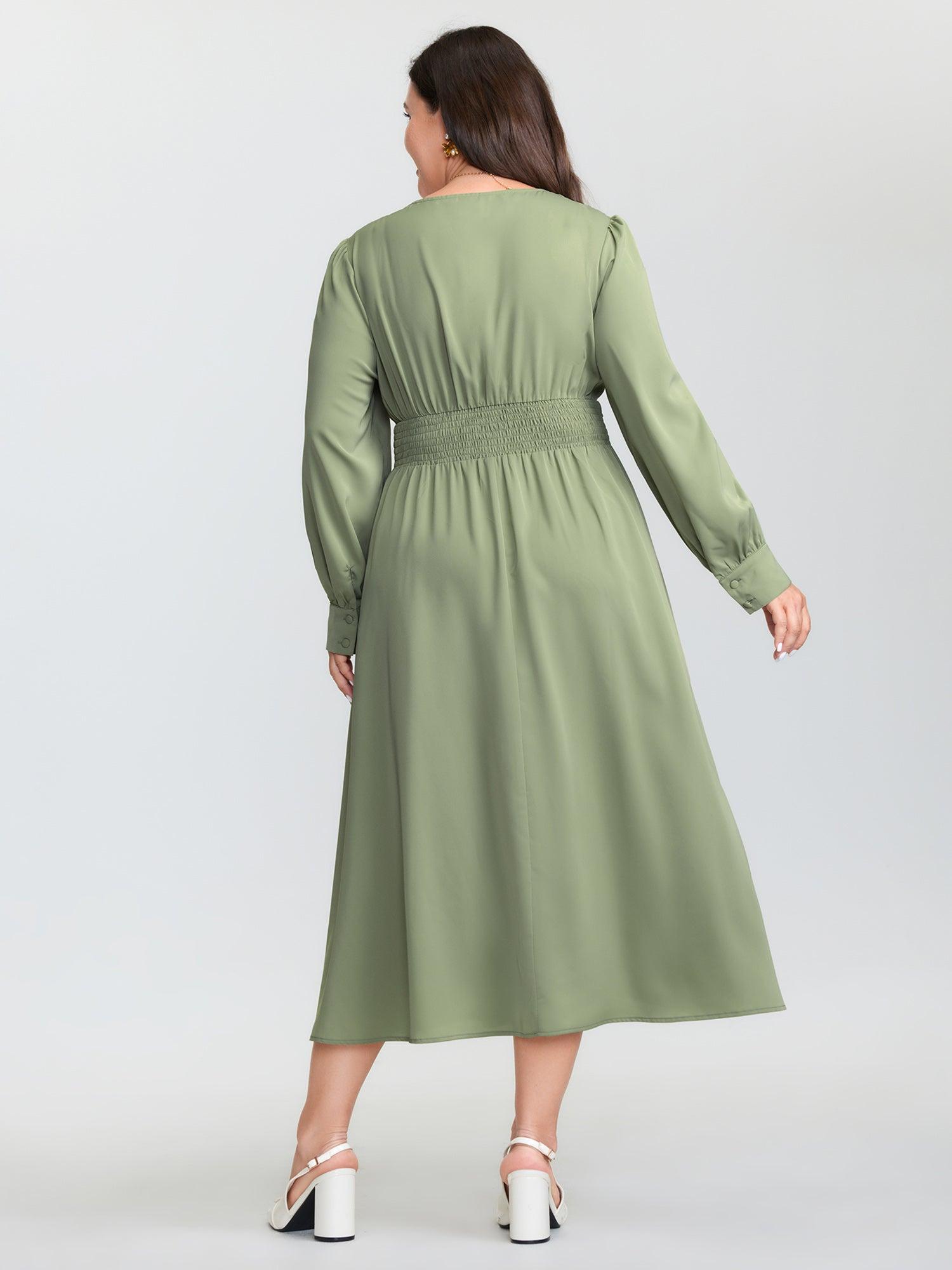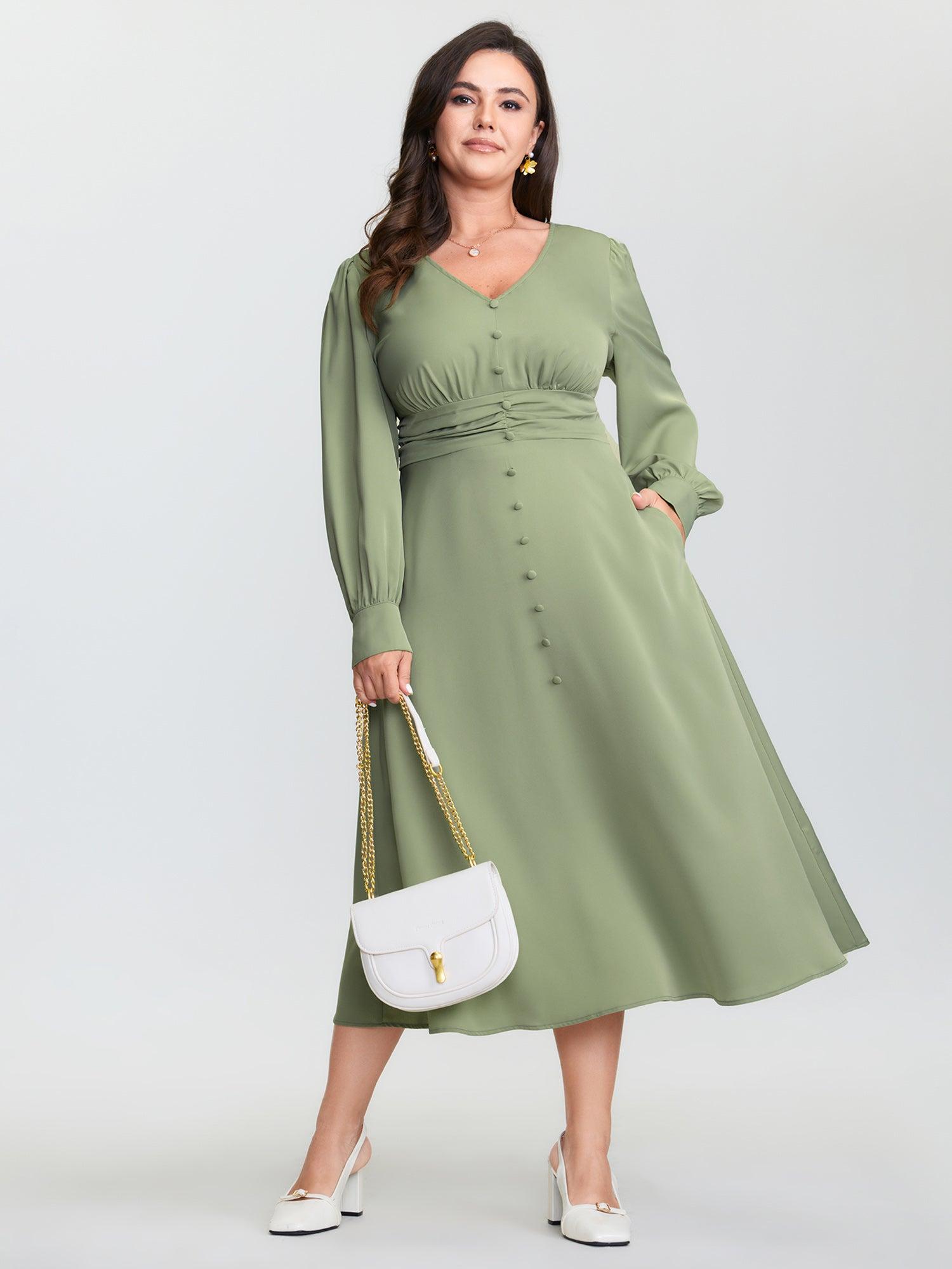 Shop Pleated Waist Deep V-Neck Midi Dress now and redefine your style with confidence at BloomChic. Tailored for mid and plus-size women. This trendy Dress, sizes 10-30. You can never go wrong with BloomChic Dresses. Color:Sage;Style:Timeless;Neckline:V-neck;Sleeve Type:Gathered cuff;Prints:Non;Details:Shirred, Button, Gathered;Pocket:Side seam pocket;Belt:No-belt;Closure Type:Button