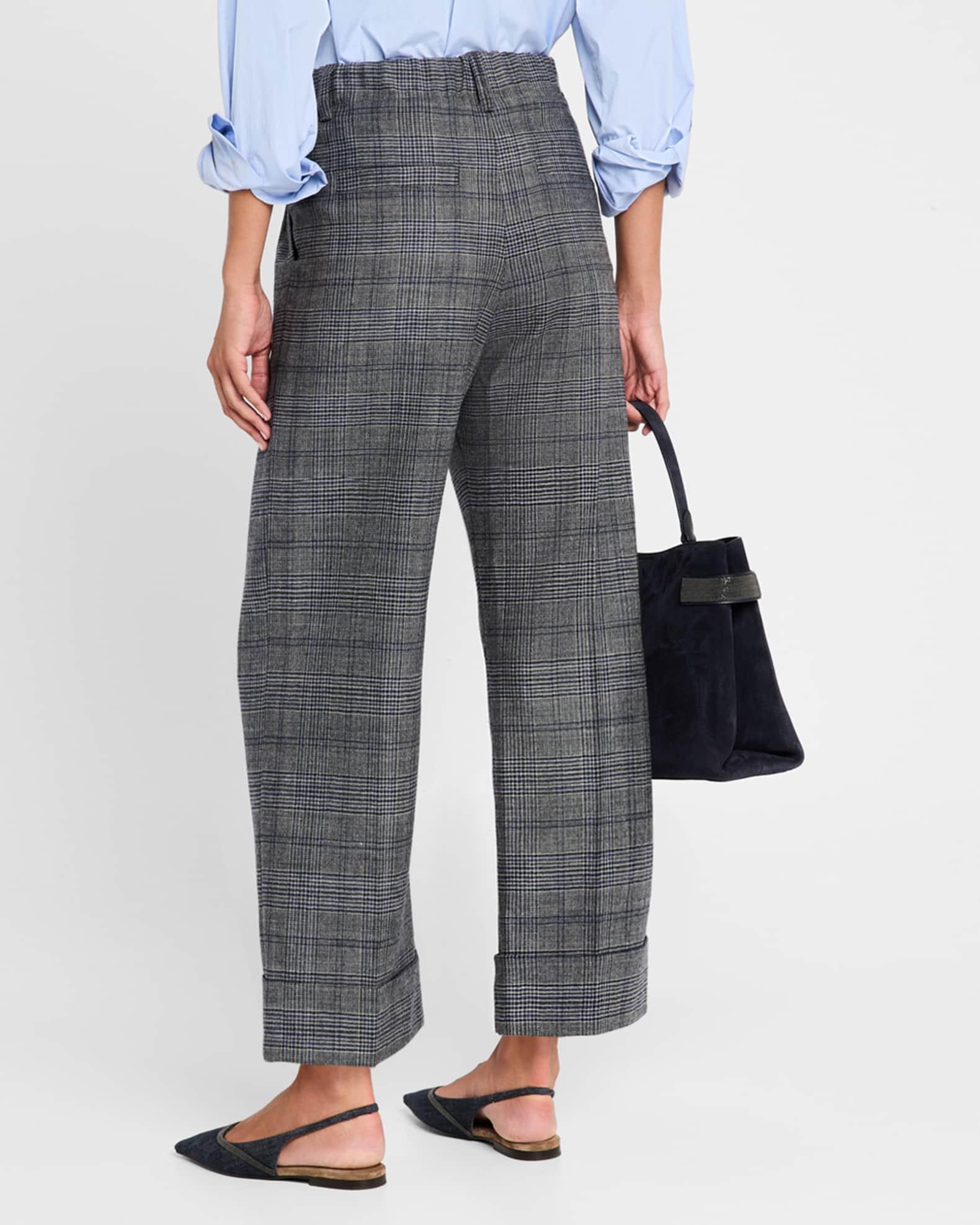 Brunello Cucinelli Prince of Wales trousers featuring a double pleated front, monili belt loop detail, and a cuffed hem High rise Angled side slip pockets; back welt pockets Wide legs Ankle length Hook/zip fly; belt loops Virgin wool Lining: Polyester/acetate/cupro Made in Italy