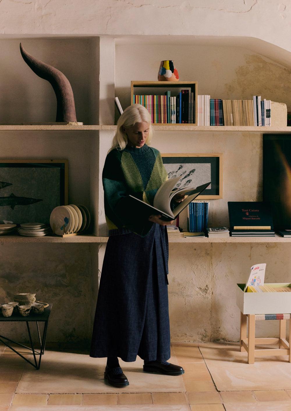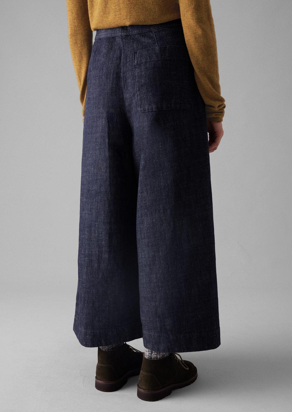 Our wrap culottes are made from organic cotton denim, yarn-dyed to a deep indigo. With a small amount of elastane for stretch and a cotton twill lining, finished with a tie and concealed corozo button closure at the waist.
