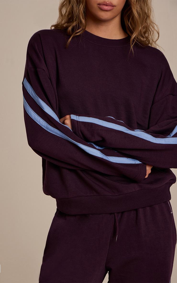 Command attention in comfort with the plum contrast striped oversized Sweatshirt. This piece champions a relaxed, generous cut featuring a classic crew neckline and dropped shoulders, distinctly elevated by bright blue contrast stripes on each sleeve. Style it with the matching sweatpants for a cohesive, comfortable day look, or contrast its relaxed fit with sharp tailored black pants. Finish the ensemble with sleek chunky boots for an urban edge and a touch of minimalist silver jewelry, securing an effortlessly polished aesthetic for any day.Length approx 48.5cm/19inch (Based on sample size S)Model wears size SModel Height - 5ft 10inchp]:!mb-4inch>Brand: PrettyLittleThingCategory: AthleisureProduct type: SweatColor: PurpleMaterial: Fleeceback SweatOccasion: Day