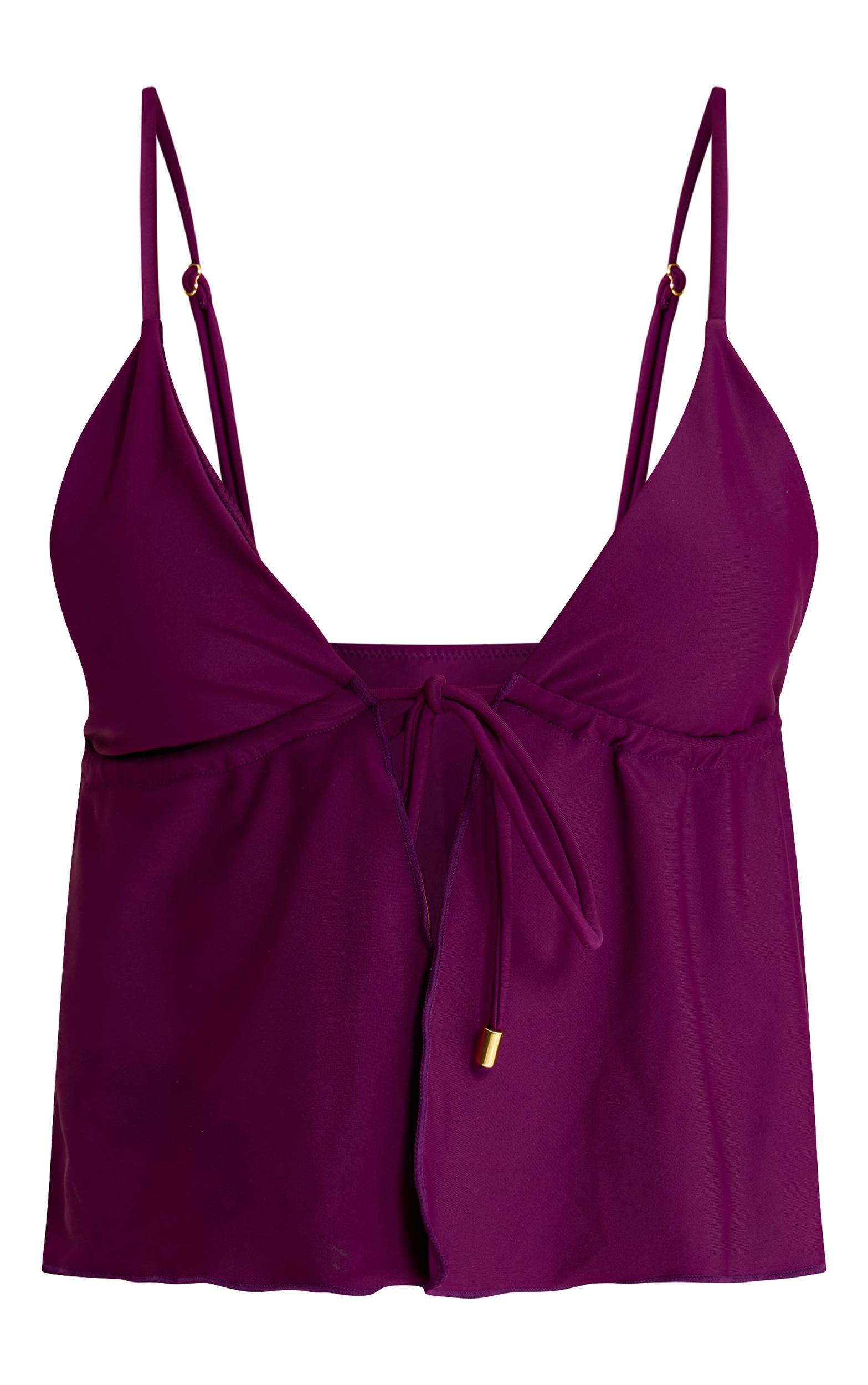 Bring a twist to your swimwear with the plum frill tie front tankini top. Made from a plum stretch swim fabric with delicate frill details and a tie front, it offers more coverage without compromising on style. Complete the look with the matching tanga bottoms and a pair of gold earrings.Length approx 48.5cm/19inch (Based on sample size US 4)Model wears size UK 8/ EU 36/ AUS 8/ US 4Model Height - 5ft 6inchp]:!mb-4inch>Category: SwimwearProduct type: Triangle Bikini TopColor: PlumMaterial: SwimDesign: PlainOccasion: Day