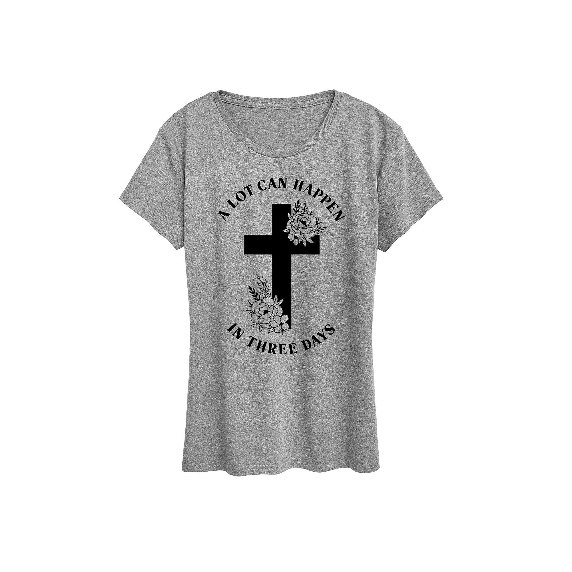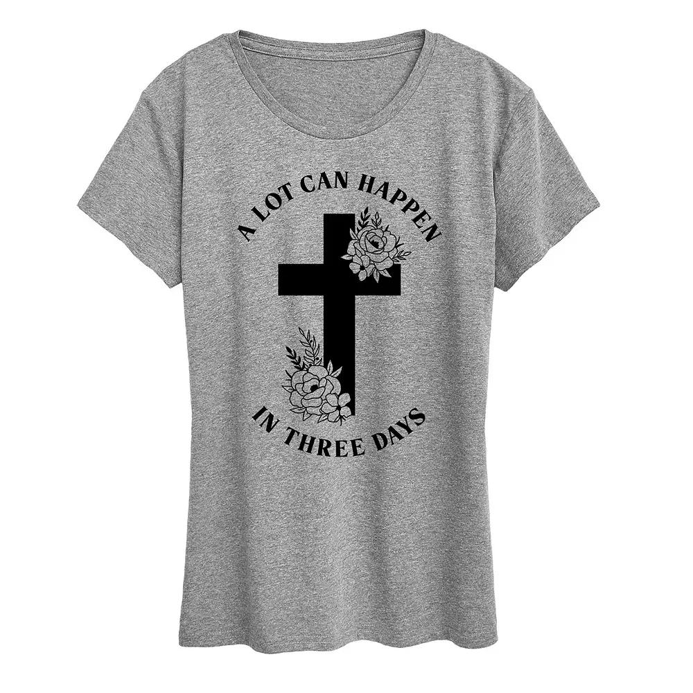 Heather Gray A Lot Can Happen In Three Days Graphic Tee - Women & Plus. A springy crewneck tee made from a lightweight cotton blend with an Easter-themed graphic. Full graphic text: A lot can happen in three days.Size S: 26 long from high point of shoulder to hemSize & fit: Relaxed-fit garment with a slightly longer hem. Fits true to size.50% cotton / 50% polyesterMachine wash; tumble dryImported, screen printed in the USA