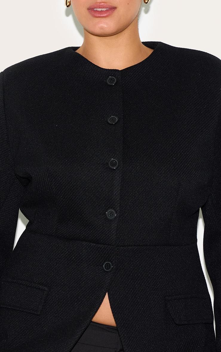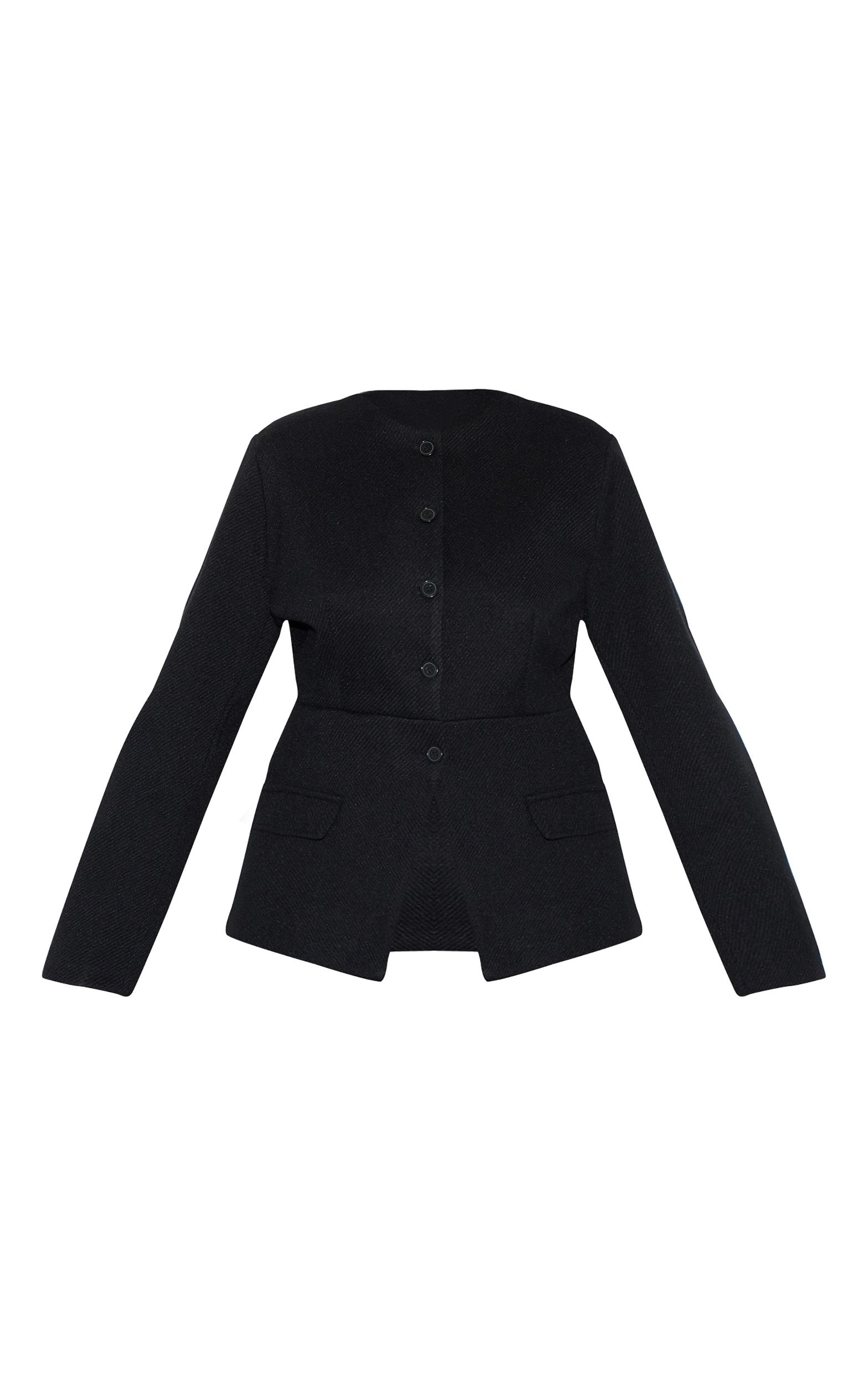 Get ready to turn heads in this plus black button up longline collarless blazer. Made from black textured material, this blazer has button fastenings with long sleeves and a chic split hem. Crafted for when you want to look chic all day long, team this piece with black wide leg pants, minimalistic stiletto heels and your go-to gold earrings. Length approx 58.5cm/23inch (Based on sample size US 12)Model wears size UK 16/ EU 44/ AUS 16/ US 12Model Height - 5ft 9inchp]:!mb-4inch>Brand: PrettyLittleThingCategory: OuterwearProduct type: Fitted BlazerColor: BlackMaterial: Faux WoolOccasion: Evening