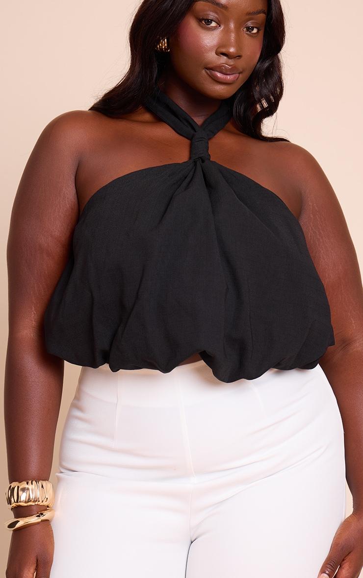 Make a shape statement in the plus black halterneck puffball top—volume meets sleek. Constructed in smooth woven fabric with a halterneck cut and exaggerated puff hem, this dress balances bold structure with effortless elegance. Pair with platform heels and a bold eye for evening energy.Length approx 85cm/33.5inch (Based on sample size US 12)Model wears size UK 16/ EU 44/ AUS 16/ US 12p]:!mb-4inch>Brand: PrettyLittleThingCategory: TopsProduct type: Cami TopColor: BlackMaterial: Faux LinenNeckline: HalterneckSleeves: SleevelessOccasion: Day