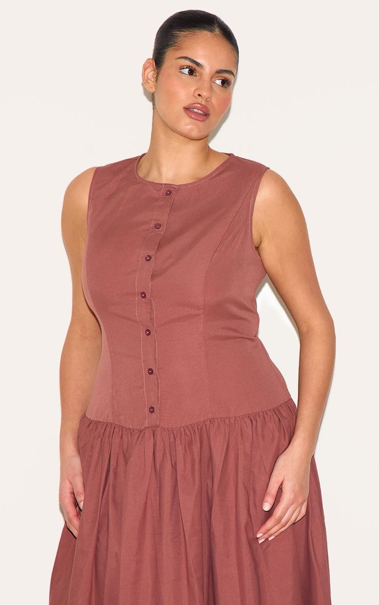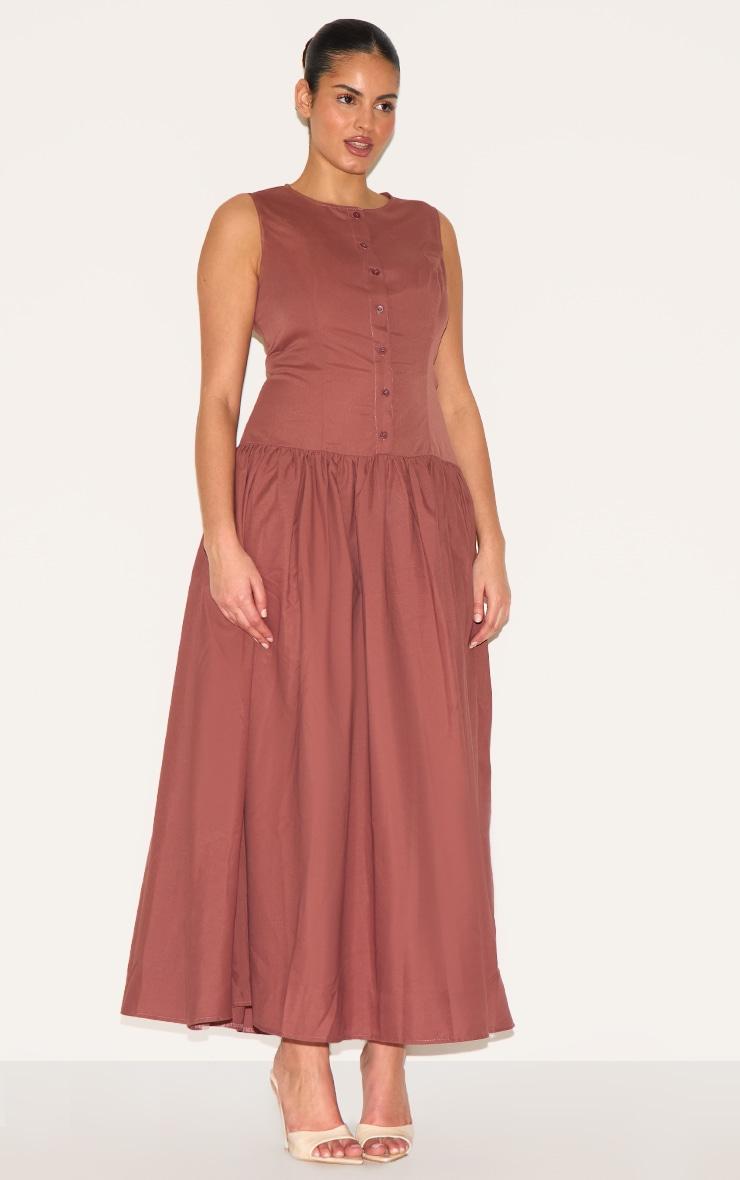 The plus brown button down drop waist maxi dress brings understated elegance to any wardrobe, cut to flatter with thoughtful detailing and a timeless silhouette. Made with brown material with button detailing and a dropped waist, this dress can be styled with your favorite strappy heels and gold earrings.Length approx 139.5cm/55inch (Based on sample size US 12)Model wears size UK 16/ EU 44/ AUS 16/ US 12Model Height - 5ft 9inchp]:!mb-4inch>Brand: PrettyLittleThingCategory: DressesProduct type: Shift DressColor: BrownMaterial: Cotton PoplinNeckline: CrewSleeves: SleevelessOccasion: Day